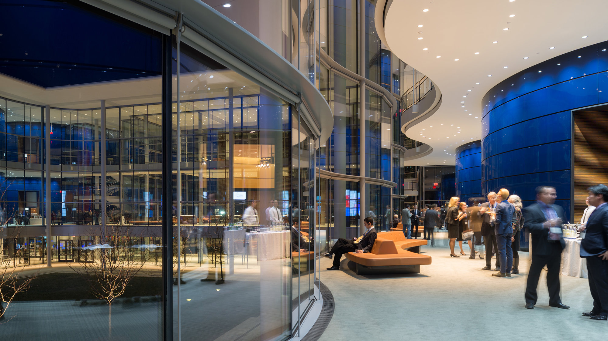 The classrooms are contained within sixteen double-height blue drums, arranged around the central courtyard. Tailored to Yale’s curriculum, the teaching spaces can support every style of learning, from team-based working to lectures, discussions ‘in the round’ and video conferencing. Guided by the principle that interaction outside of the classroom is equally important, the five-storey building incorporates a variety of social spaces. These are concentrated at ground level, where there is a coffee shop, media library and a large common room, opening out into the courtyard. On the second floor, the classrooms are connected by a wide internal circulation ‘cloister’ – the glazed façade around the courtyard follows the undulations of the blue drums to define bays where students can gather. The third floor is pulled back from the facade to form a mezzanine, opening visual connections between the different levels. The building targets LEED Gold standards of environmental performance, with chilled beams, displacement ventilation and solar responsive shading.