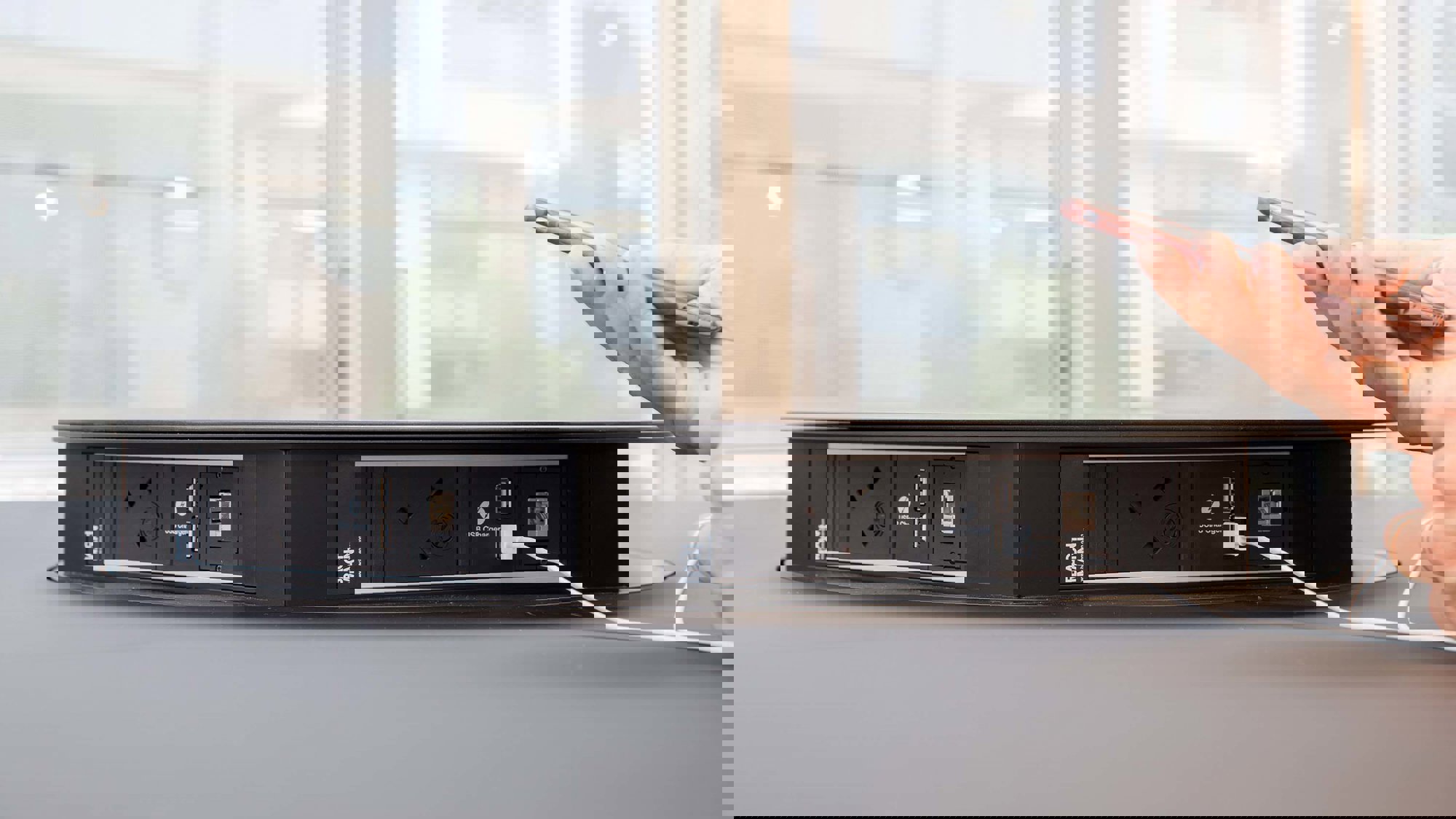 The Element 02 desk was conceived to support discussion and group working, reflecting the dynamic, fluid nature of today’s workplace. The circular table comprises two discs – a central pillar containing a power supply and a perimeter ring, which can be elevated to support both standing and seated meetings. Controlled by a lever and smooth internal mechanism, it can rise from 56 centimetres to a little over 1.2 metres. Contrasting with the white study table, the prototype has been manufactured in black powder coated aluminium, finished with black glass and supported by a ring of stainless steel at the base.