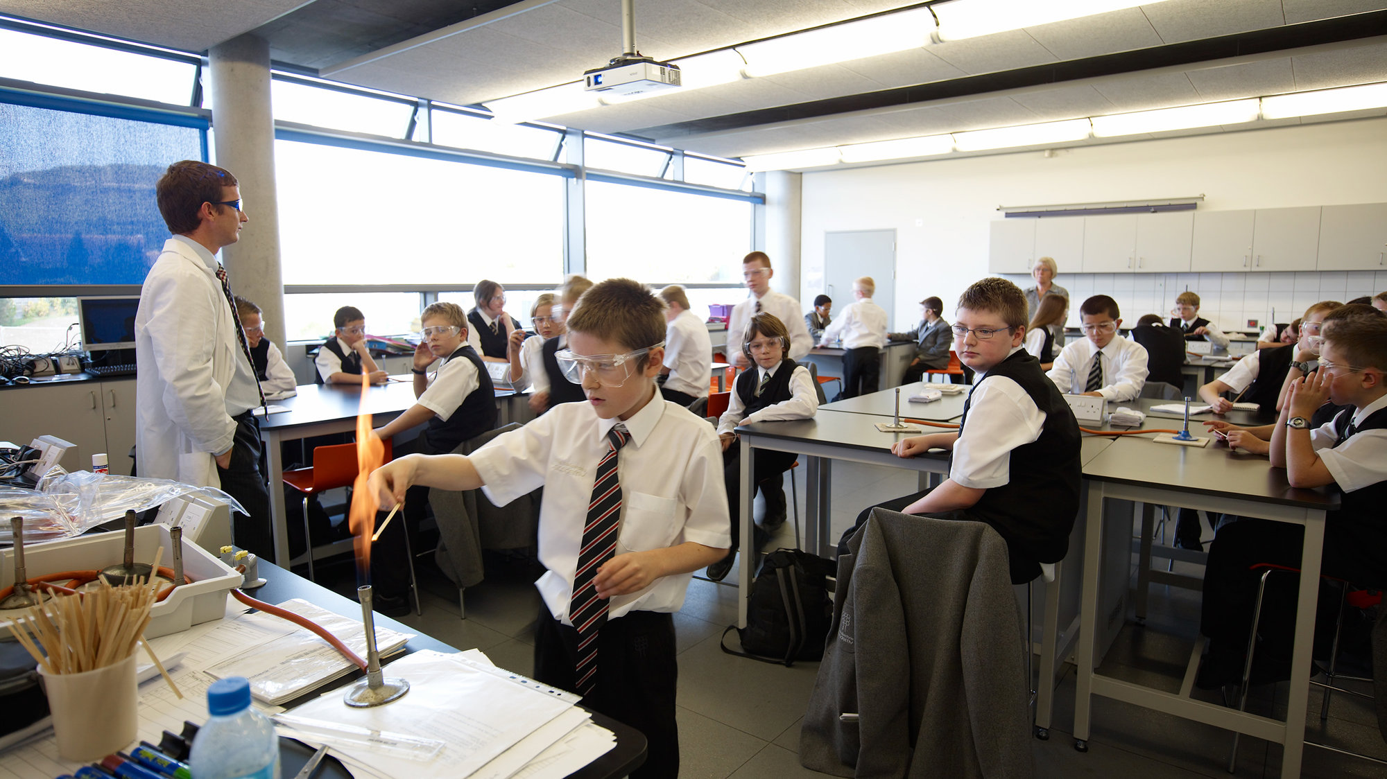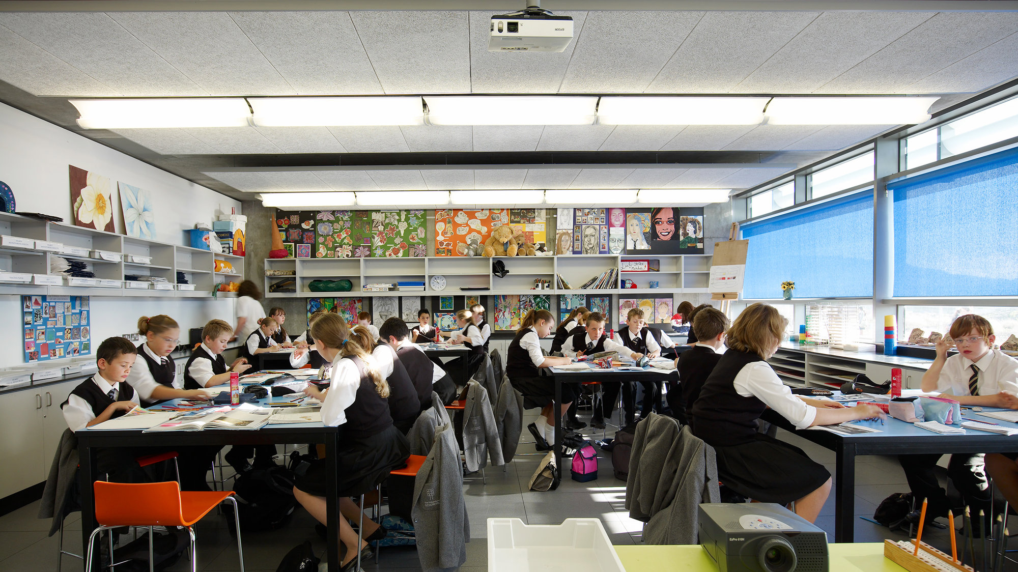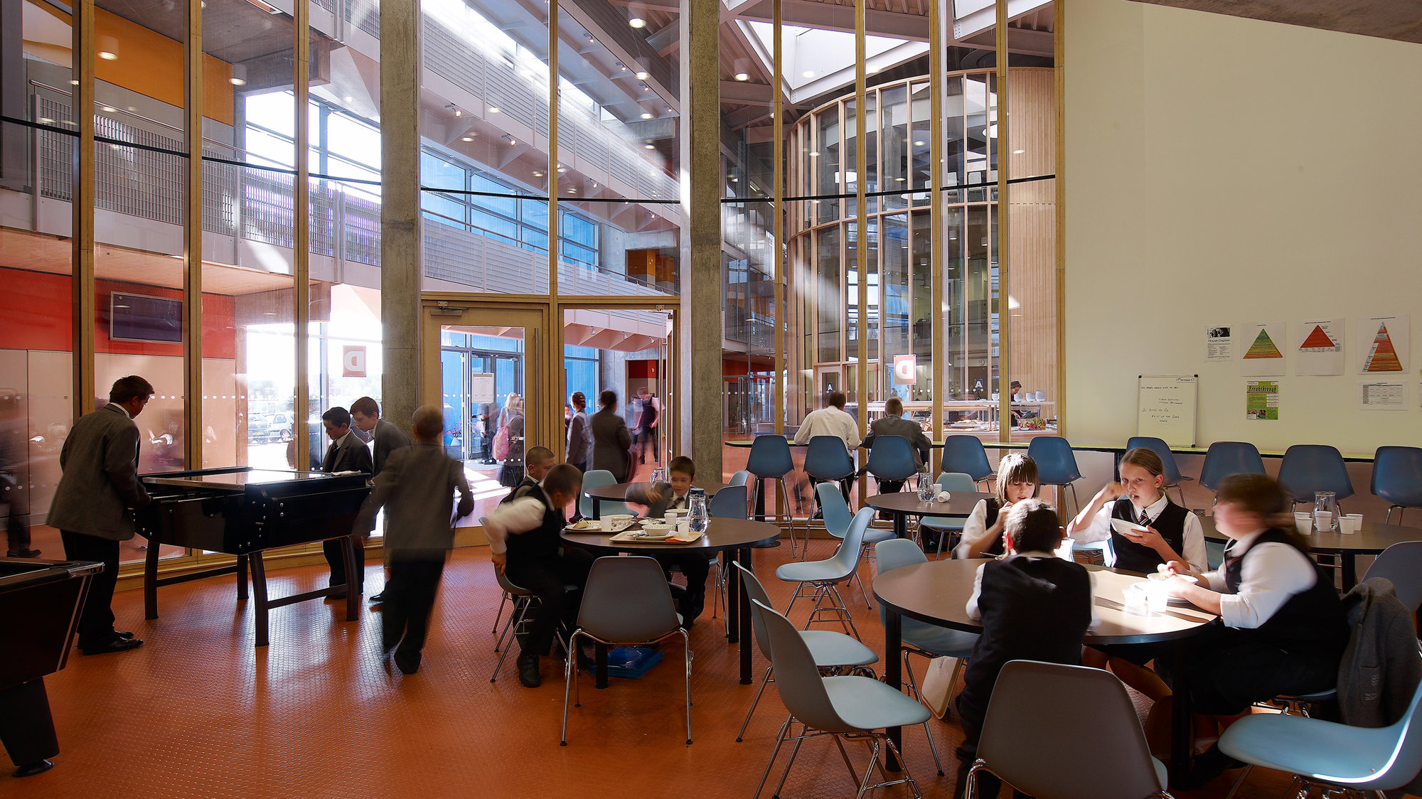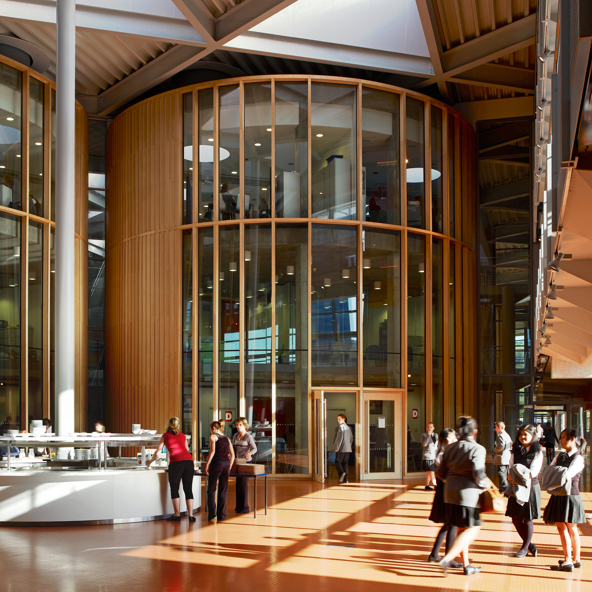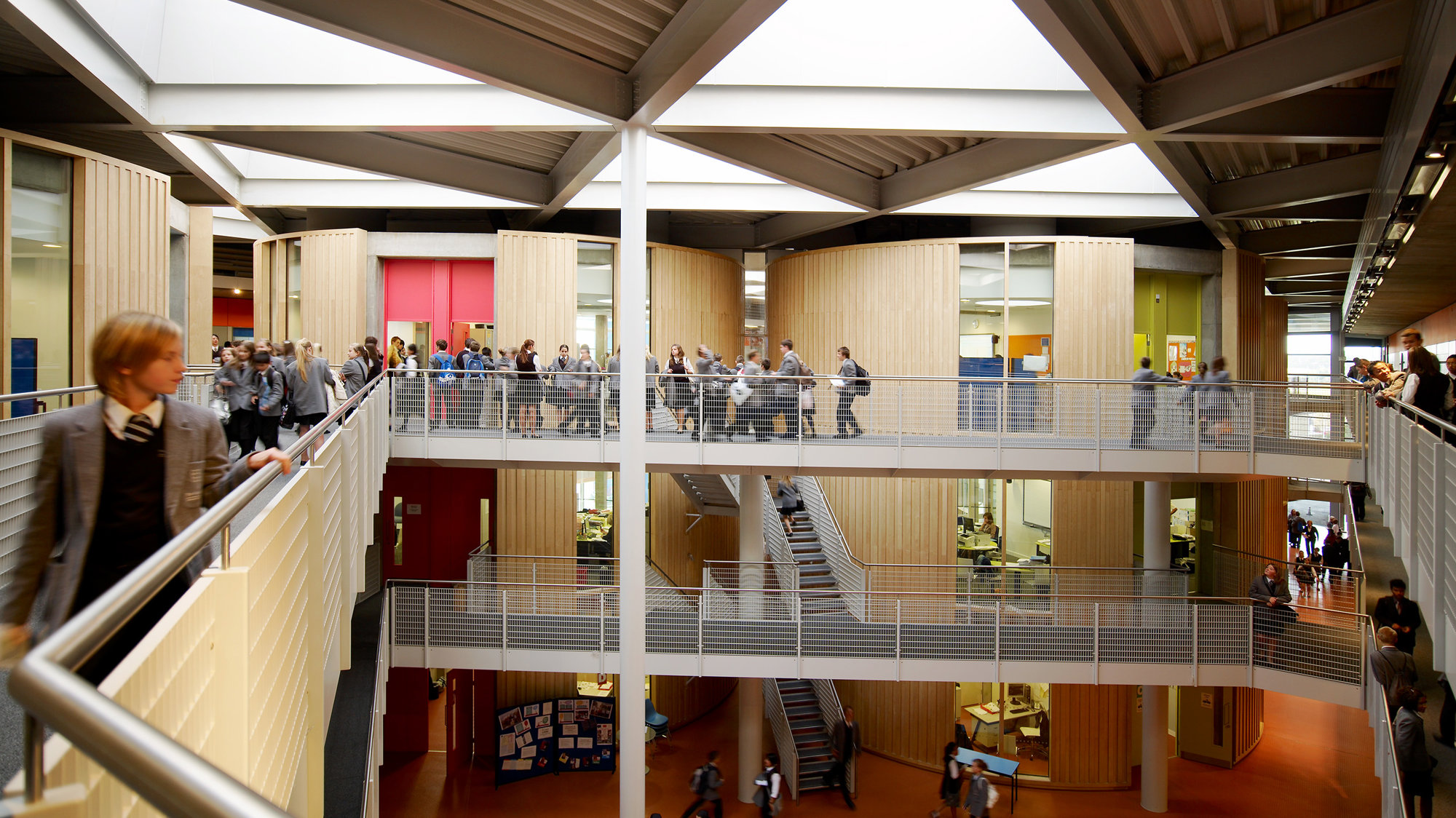 Inside the atria are eight timber-clad, circular drums, each of which contains a three-storey house space. Within these houses are intimate spaces for registration, pastoral support groups, dining, coat cupboards and break-out zones, overlooked by raised staff areas and seminar spaces, with language teaching rooms on the upper levels. Specialist classrooms for art dominate the north and south perimeters on the ground floor, while more traditional academic teaching facilities are placed on the quieter, upper levels. All classrooms have full height glass panels adjacent to the doors to create a sense of display. Oriented to minimise unwanted heat gain and solar glare and shaded by horizontal brise soleil, much of the building, including the flexible perimeter classrooms, is naturally ventilated.