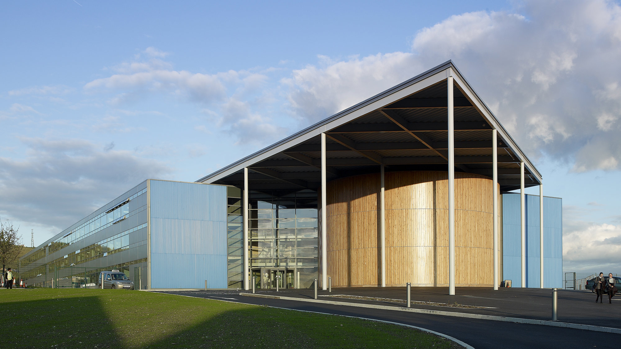 On plan, the three-storey building is a simple rectangle, with two entrances and an external play area on the southern edge; a sports hall and library in the eastern end; and a circular performance auditorium in the west. These spaces are unified beneath a dramatic steel roof canopy, made up of solid triangular inserts slotted into a diagonal lattice and punctured by light wells. The roof projects over the north eastern corner of the building to shade the glazed entrance and its angular form is echoed inside in a zigzag arrangement of elevated walkways. The walkways run between the strands of perimeter classrooms to define two full-height trapezoidal atria and a smaller study area.