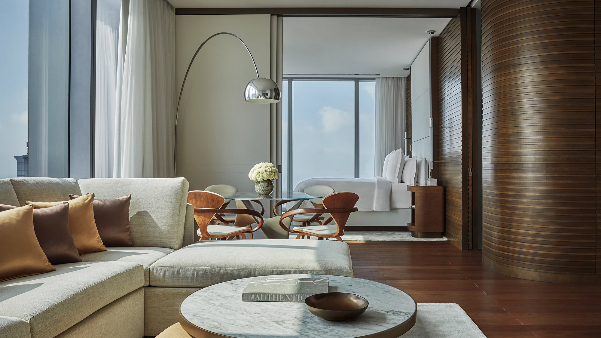 The hotel comprises nine floors of guest rooms below. The building’s circulation follows a defined pattern on every floorplate – an internal ‘street’ runs along the center from the elevators to the eastern edge, where the suites are located. Curved corners marking every room door give an impression of generosity of space, a language that continues in the interior layout of the rooms. Every room has full-height glazing, a 10-foot floor-to-ceiling clearance, walk-in wardrobes, a wall screen displaying digital art by Brian Eno, all complemented by a warm palette of materials and bronze tones. All the bespoke furniture used throughout the hotel – in the public areas as well as the rooms – was designed by the practice.