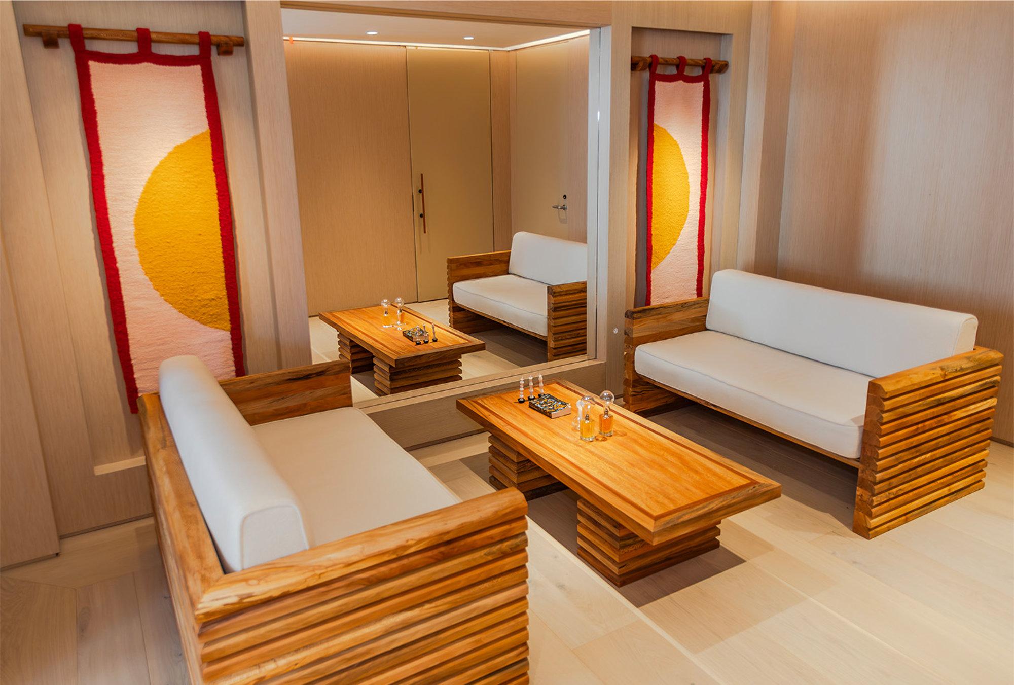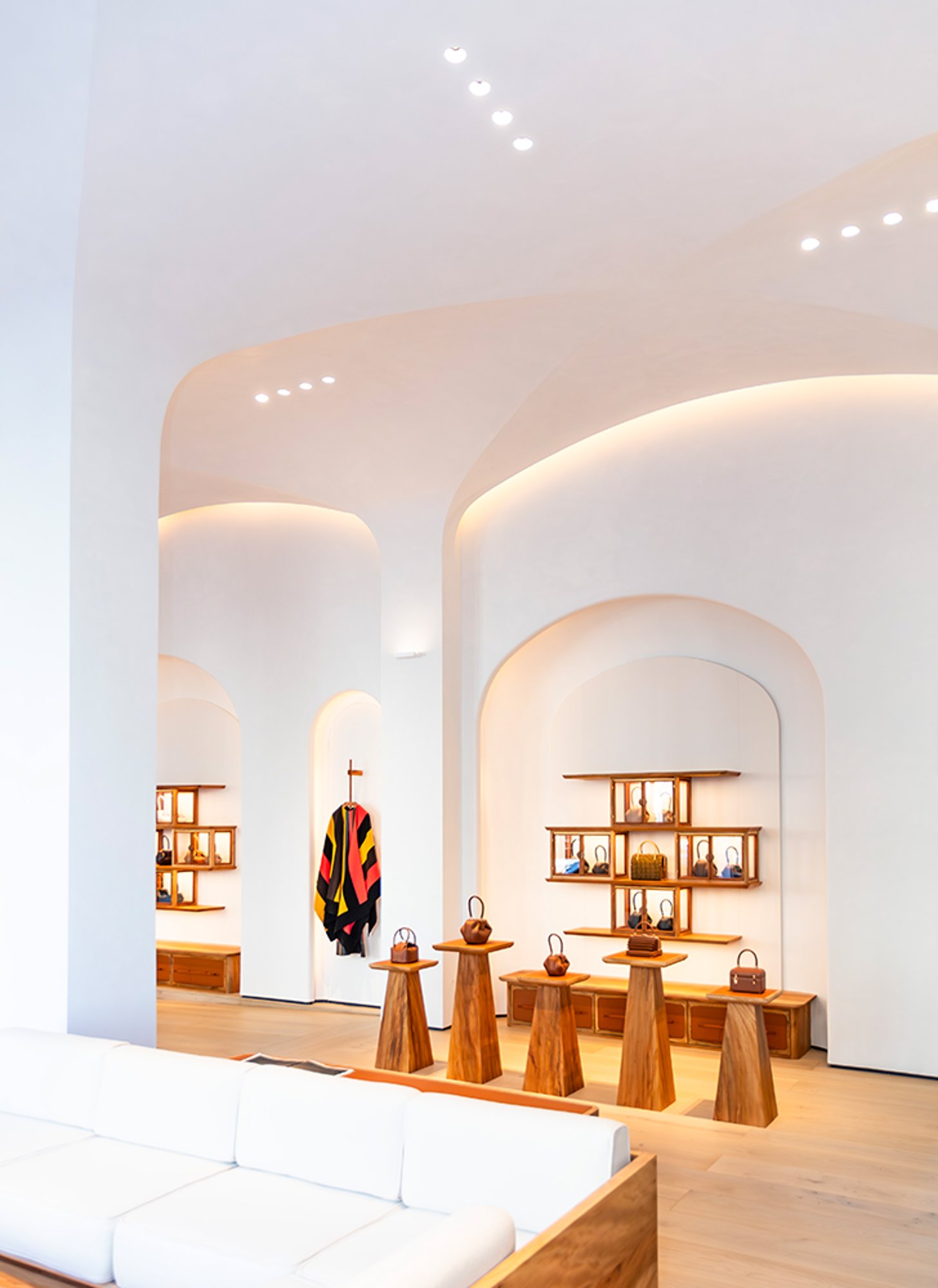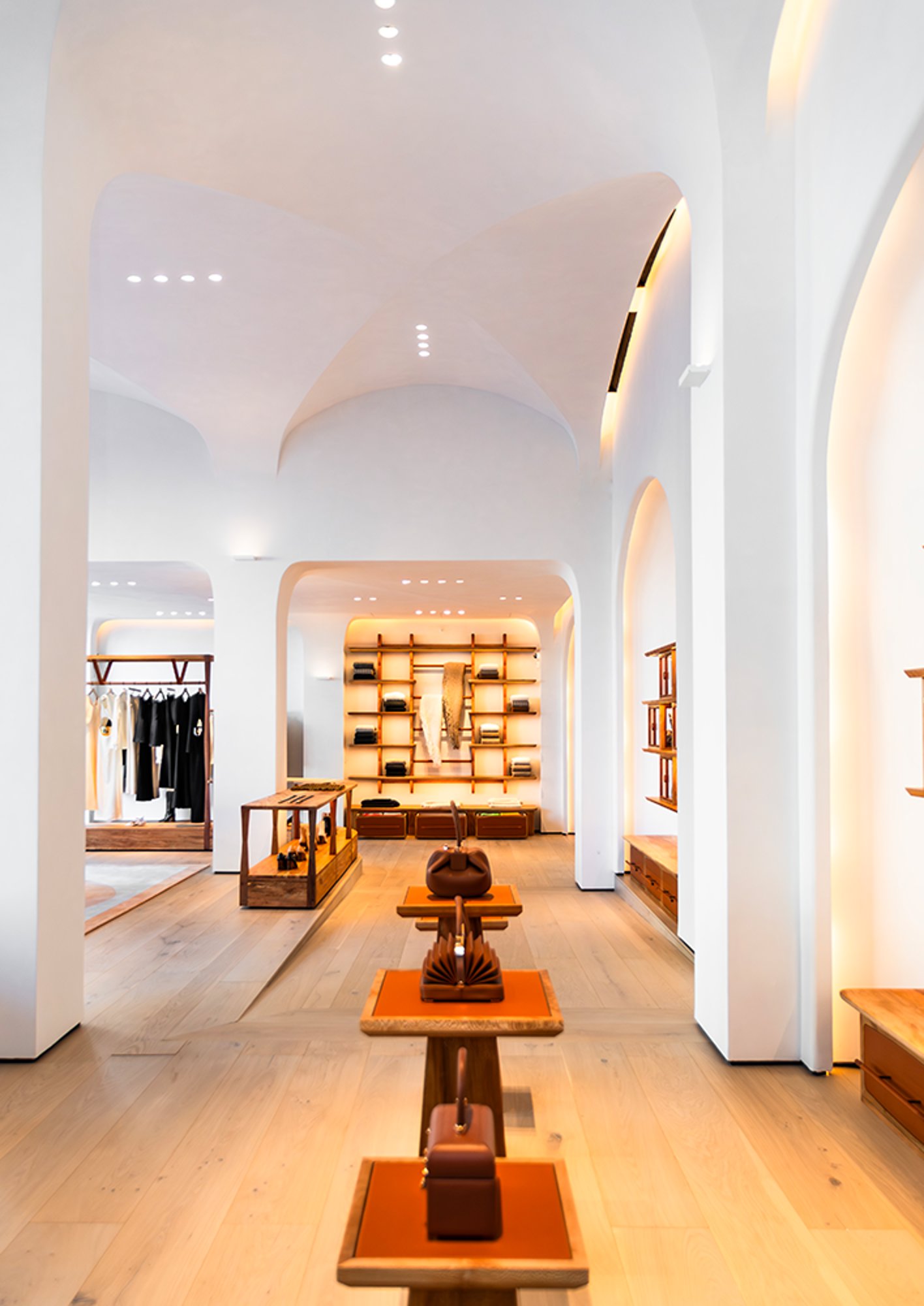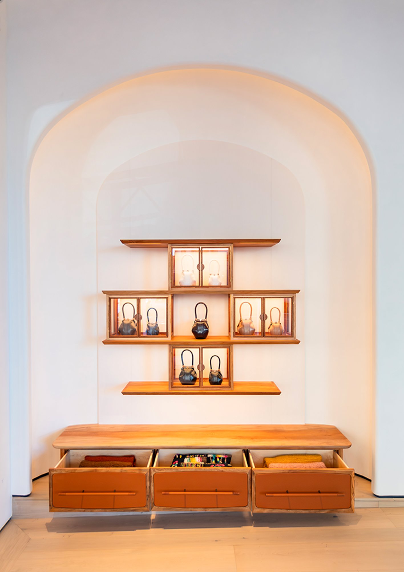 Visitors can access the store from two entrances, on Wilshire Boulevard or from within the hotel. The street-facing reception hall has lower ceilings to create a more intimate entrance that opens up to an airy double-height space. Echoing the brand’s ethos of craftsmanship, the vaulted ceiling has been finished with traditional materials and techniques, including the hand-application of Roman Clay, which is an eco-friendly plaster. A VIP area features fluted glass doors and silk carpets to enhance the retail experience.
