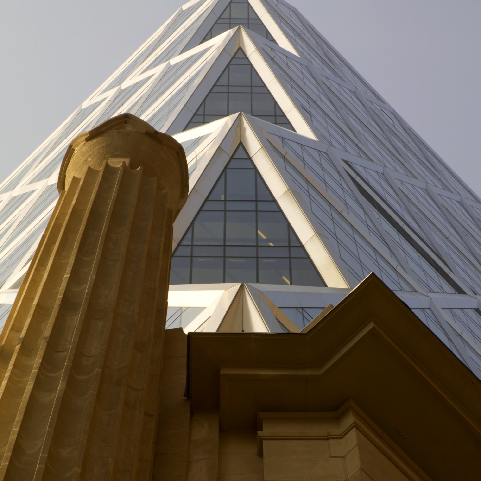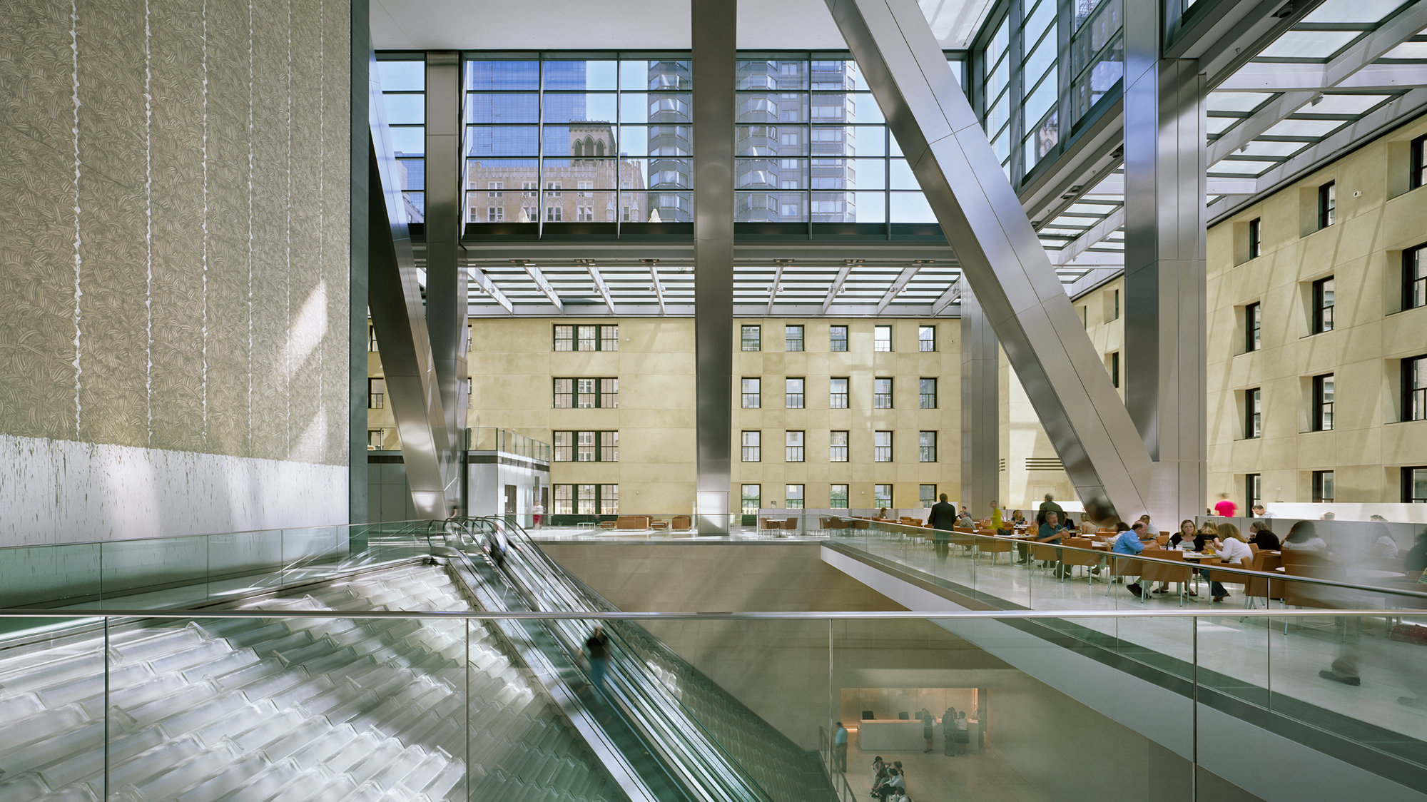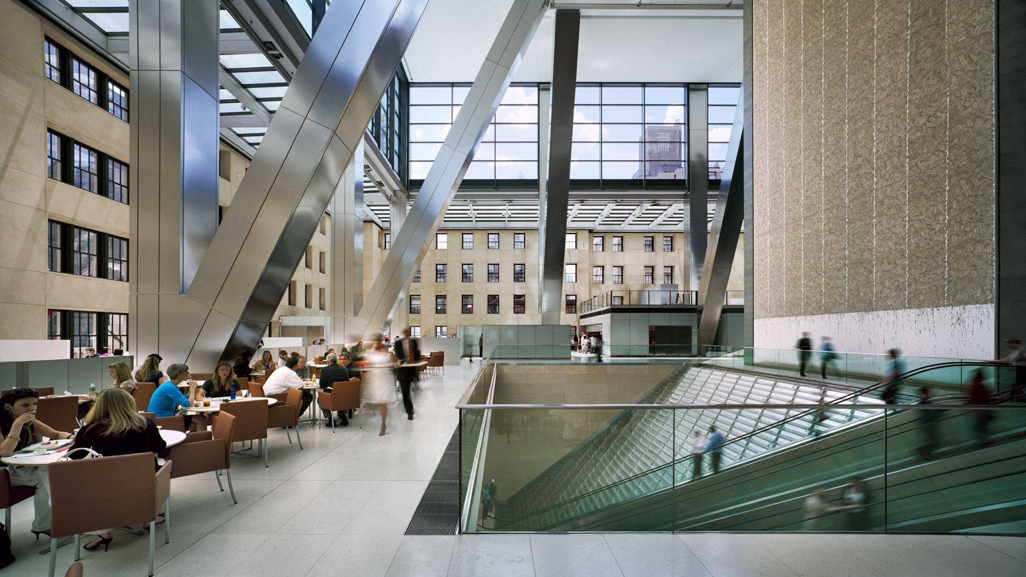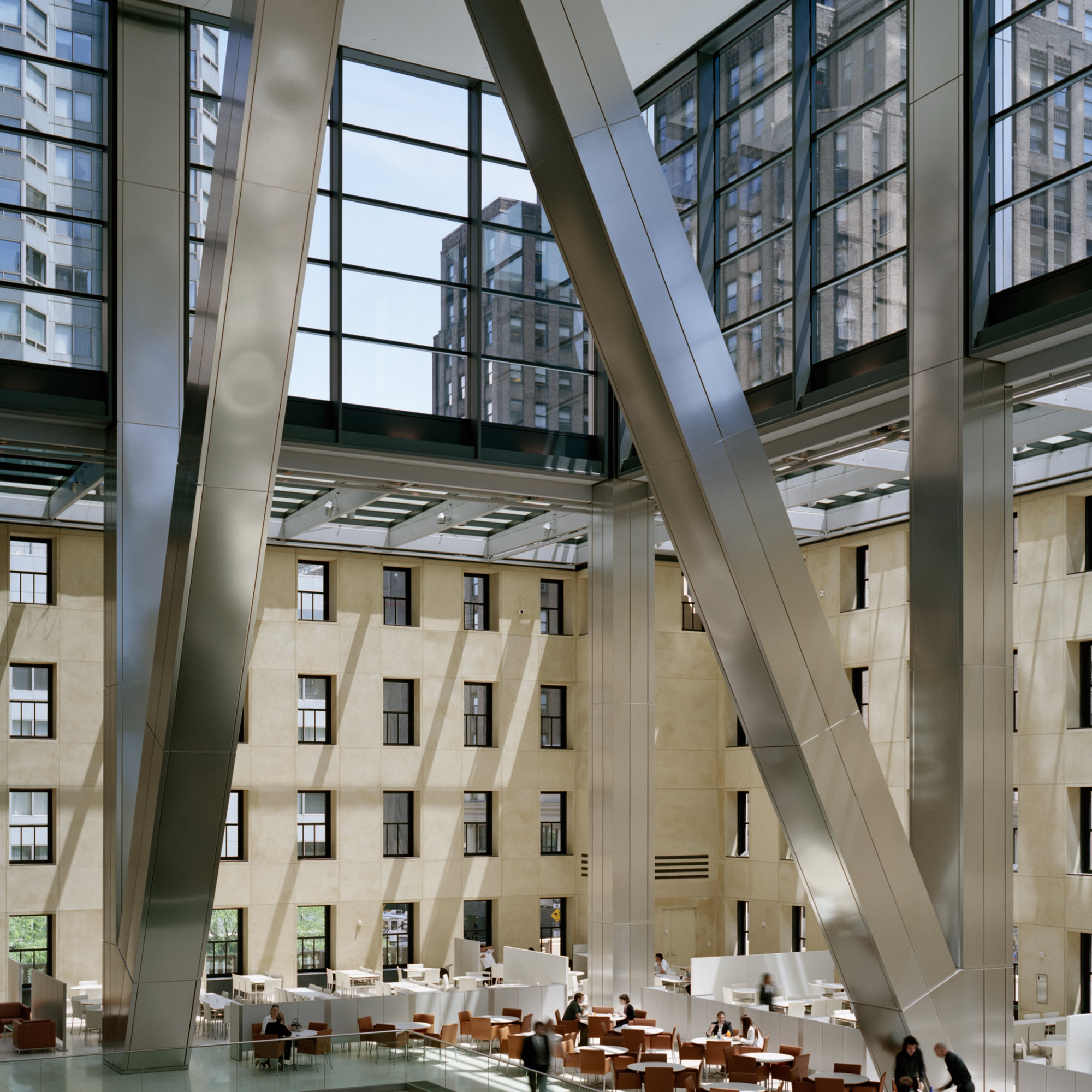 The new tower rises above the old building to a height of forty-four-storeys, linked on the outside by a skirt of glazing that encourages an impression of the tower floating weightlessly above the base. At the base of the tower, the main spatial event is a lobby that occupies the entire floor plate of the old building and rises up through six floors. Like a bustling town square, this dramatic space provides access to all parts of the building. It incorporates the main elevator lobby, the Hearst staff cafeteria and auditorium, and mezzanine levels for meetings and special functions. Structurally, the tower has a triangulated ‘diagrid’ form – a highly efficient solution that uses 20 per cent less steel than a conventionally framed structure. With the corners cut back between the diagonals, it creates a distinctive facetted silhouette on the Manhattan skyline.