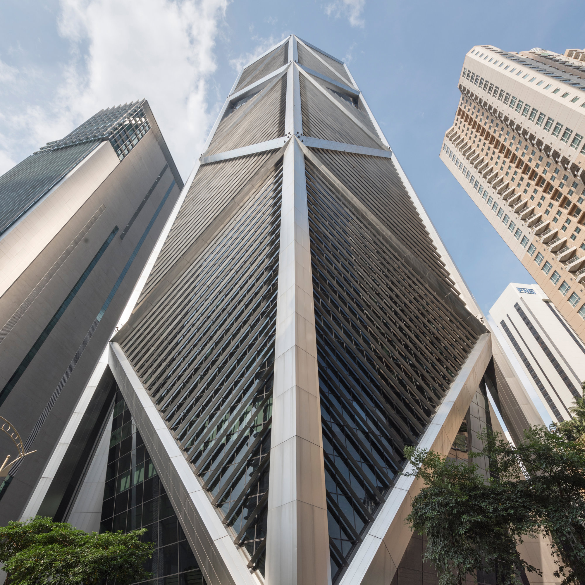 Extending the public realm, the building is set back from the perimeter of the site and poised on a slender base to create a generous, tree-lined plaza that reaches into the atrium. The glazed facades are pulled back to shade the entrances and create an impressive arrival sequence. The tower also features huge, open sky gardens, which are up to 40 metres in height and have uninterrupted city views, made possible by the tower’s innovative, self-bracing diagrid structure. Office floors are located in the lower portion of the tower, centred on a dramatic three-storey atrium, and serviced apartments are above – at ground level, the two functions have individual entrance lobbies on either side of the building. At the very top of the tower are penthouses, oriented to face spectacular views of KL city centre.