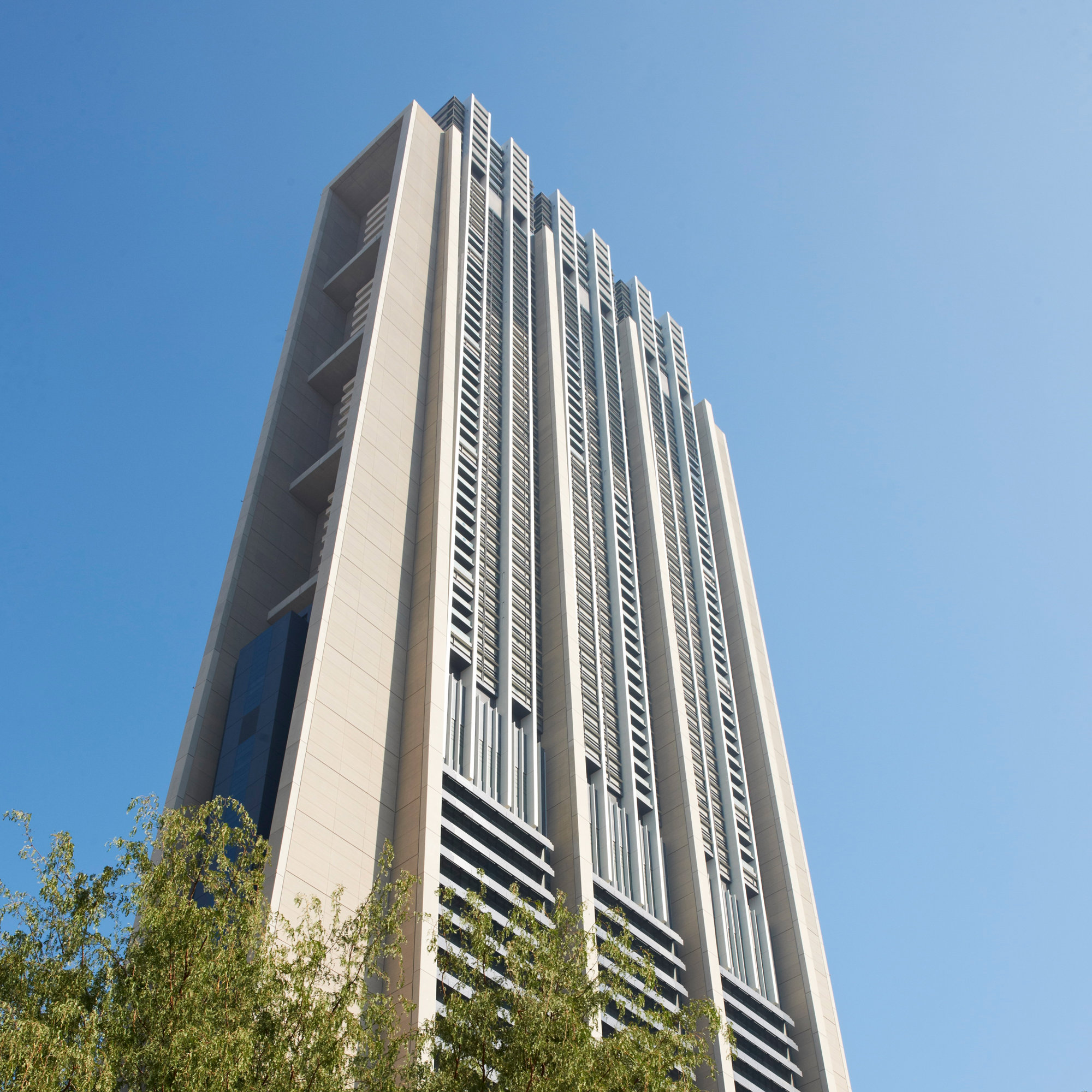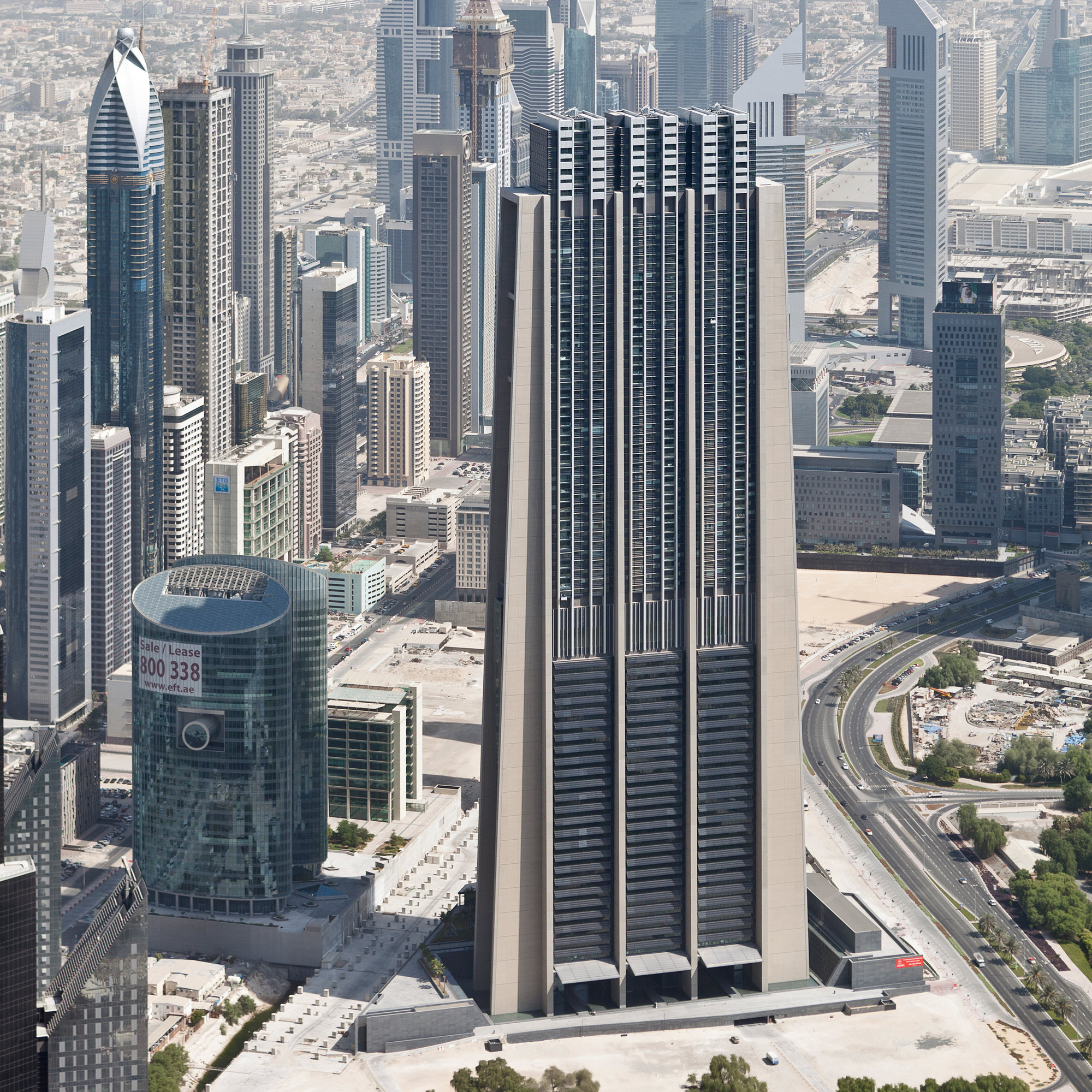 The floors are supported by four A-frame concrete 'fins' that taper as they rise, creating a slender profile that reveals the building's structural system and internal organisation. The twenty-five floors of office space are concentrated at the base of the tower, so that the living spaces above can take advantage of views towards the coast. The different functions are separated by a spectacular double-height, fully glazed sky lobby, articulated externally as a horizontal break in the façade. Residents' facilities include a lounge, restaurant, pool and health club and the tower is crowned by twelve luxurious duplex and triplex penthouse apartments with spectacular views over Dubai. A small central lift core, serving 40 levels of apartments, rises to the sky lobby, where a local lift core transports residents to their individual apartments.