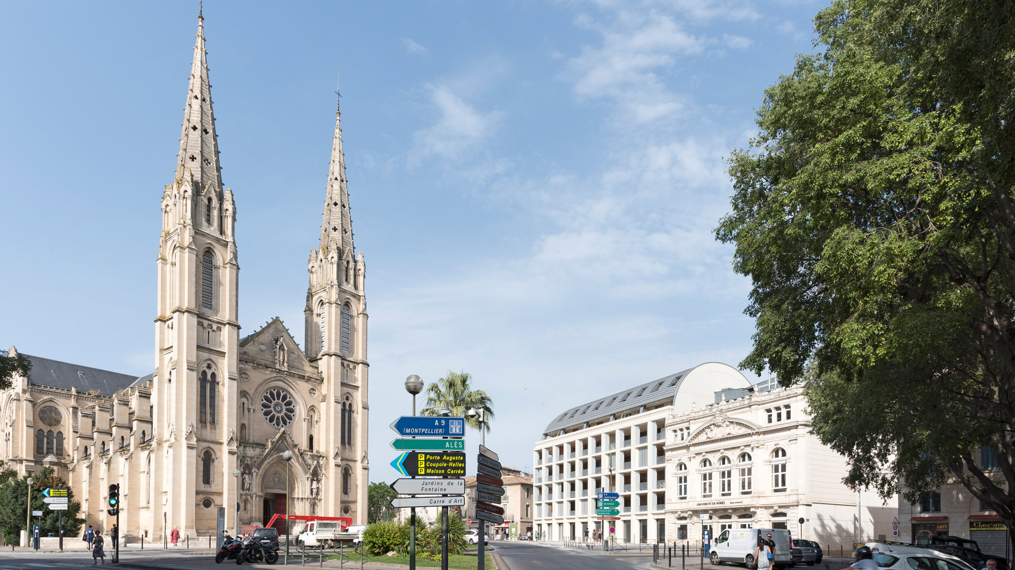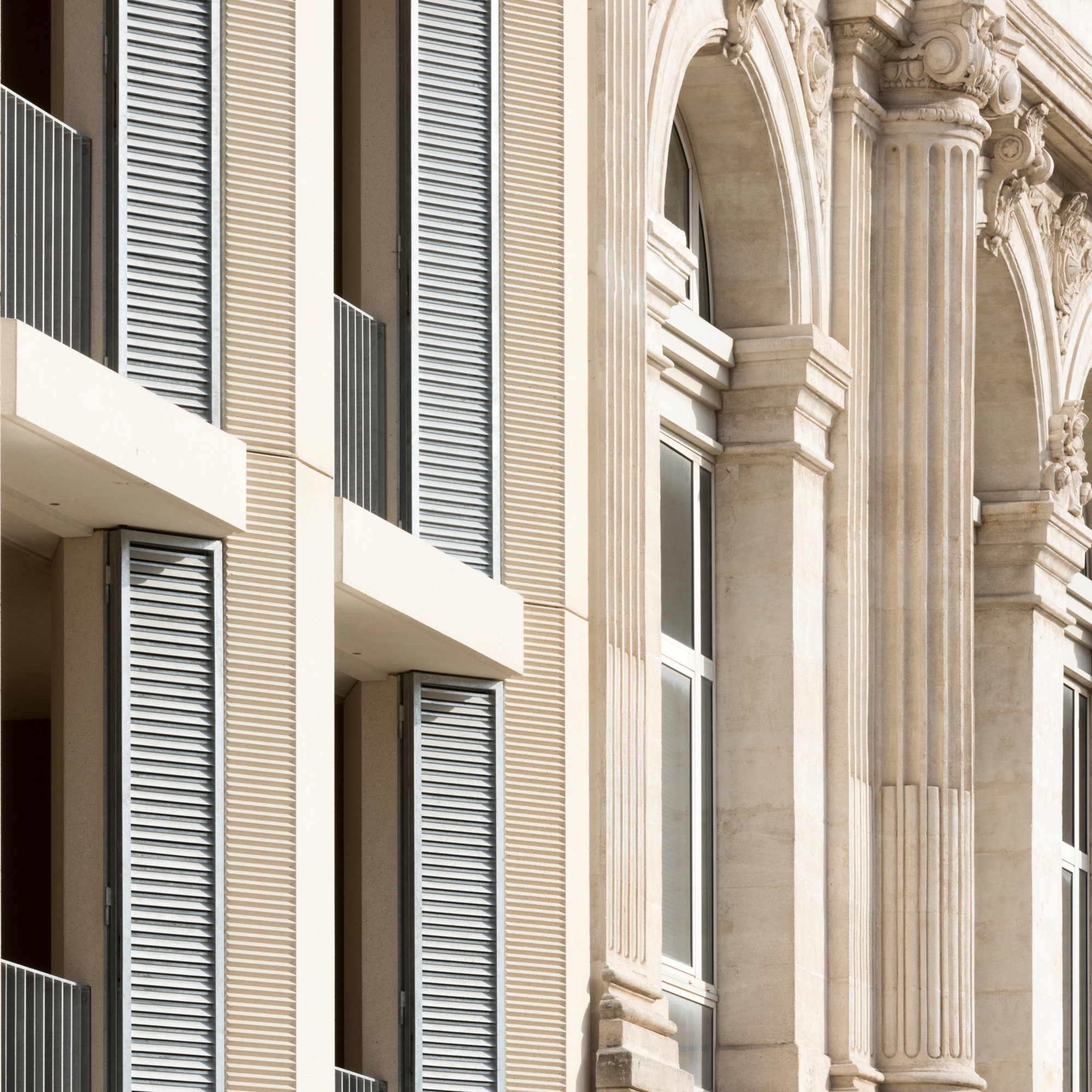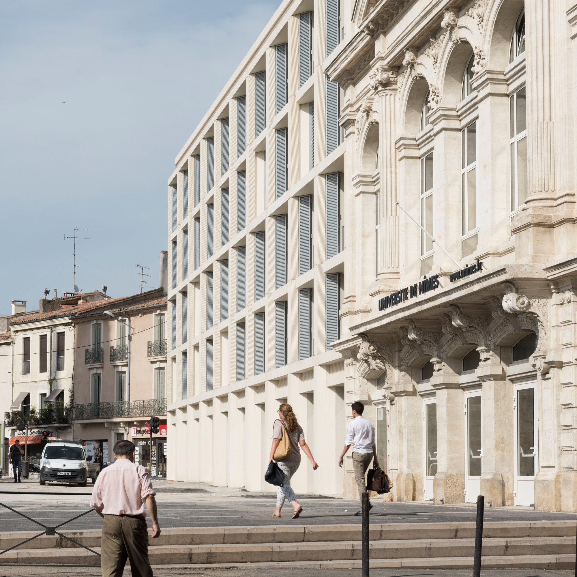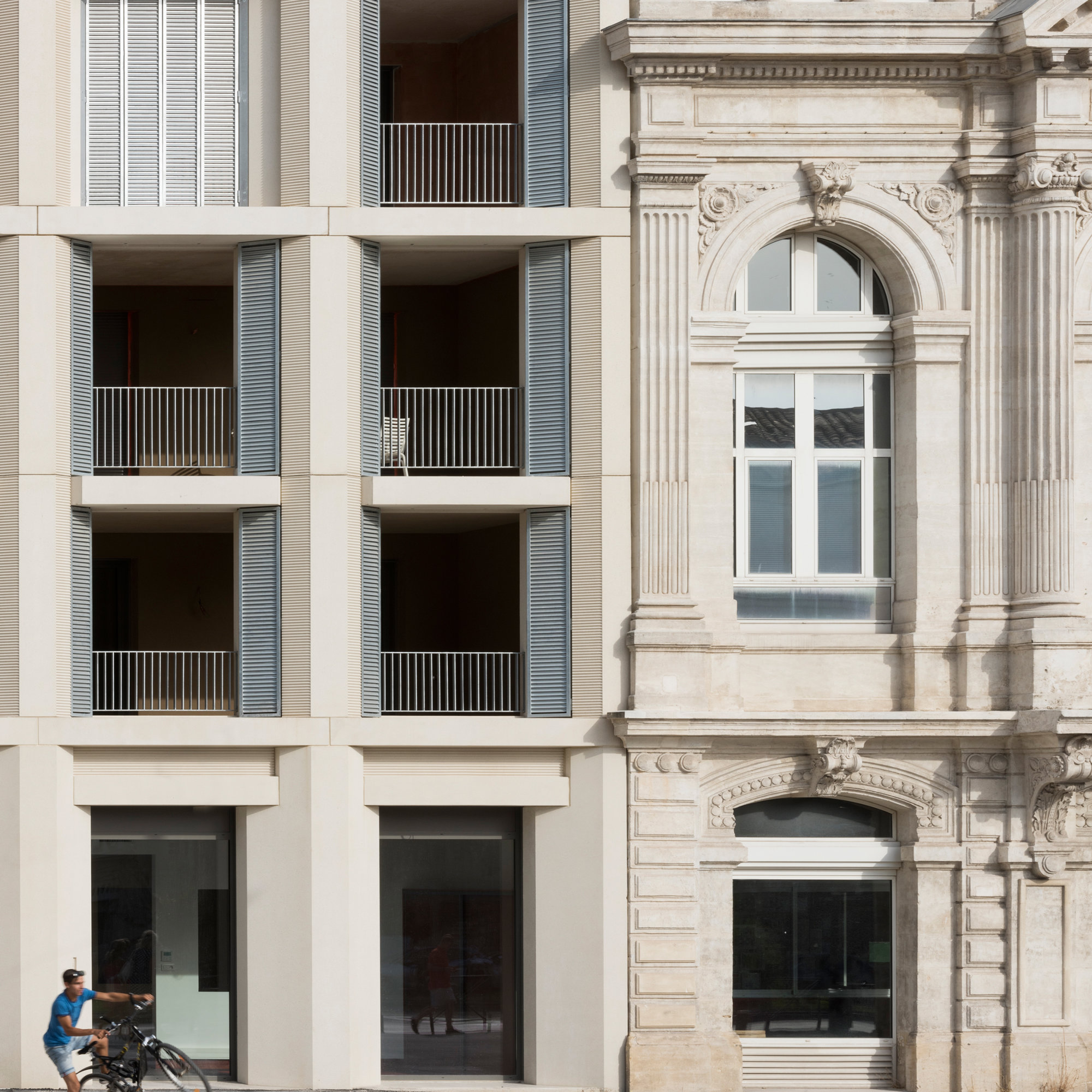 The masterplan includes new paving and landscaping, and a re-direction of traffic to bring pedestrian life back into the square. The new residential building forms a restrained backdrop to the new public space, providing sixty new apartments above offices and retail units. Its robust façade echoes the Roman Arènes nearby, with its geometrical openings and deep shadows, and also takes inspiration from the traditional façades of the old city – their balconies, louvred shutters and celebration of entrances – reinterpreting them in a subtle and contemporary manner.
