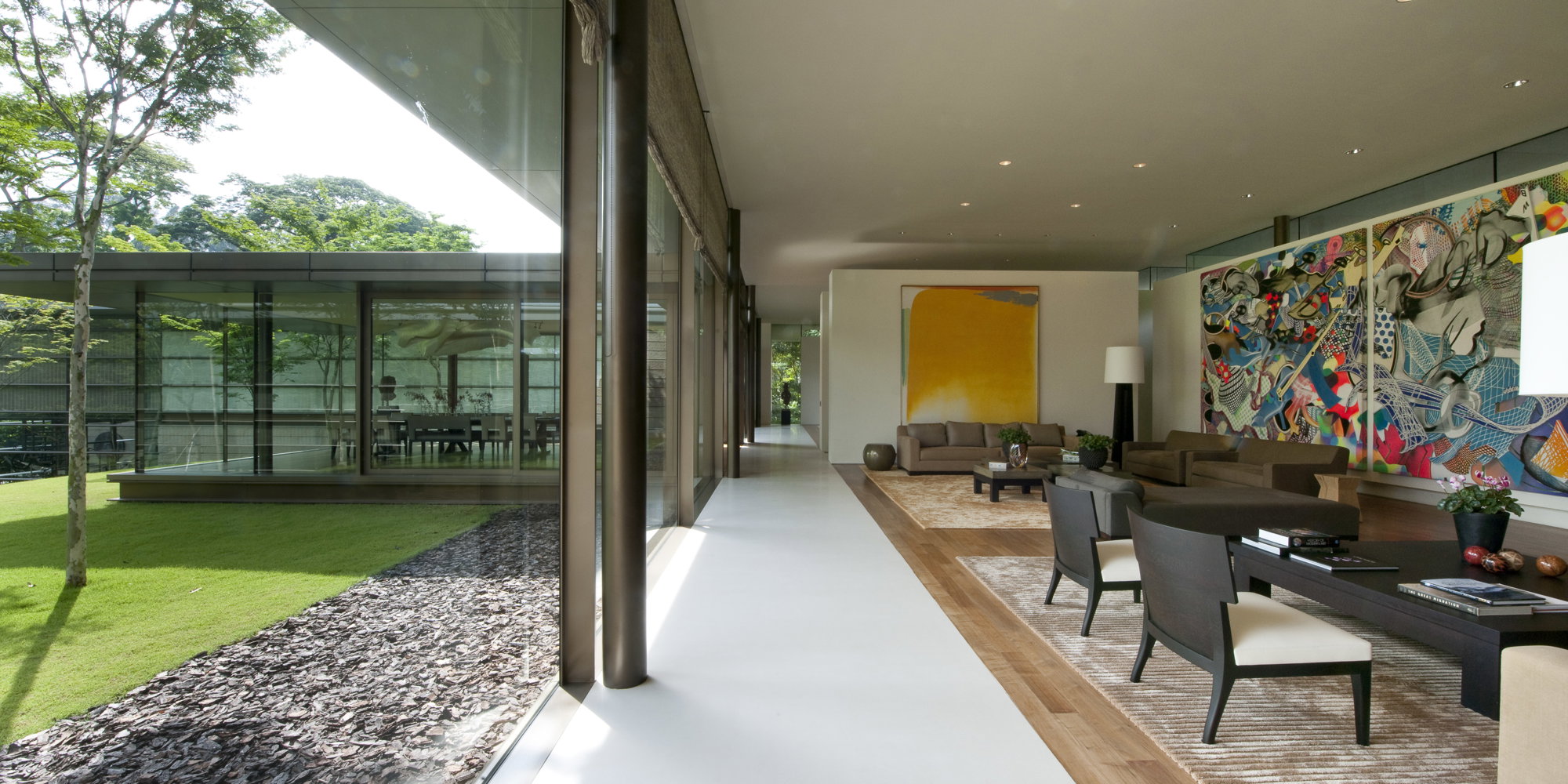 Combining discreet family accommodation with generous spaces for entertaining, the design of this house in Leedon Park balances the constraints of the site with the alternating requirements for privacy and transparency. Leedon Park is characterised by detached, low-rise houses set back from the road, but the house owes more to the simplicity of a Thai sala and the concept of an adaptive architecture than any local style. The tropical climate is exploited in the planting of the garden, while the deep overhang of the roof, raised above a layer of clerestory windows, offers protection from the sun and monsoon rains.