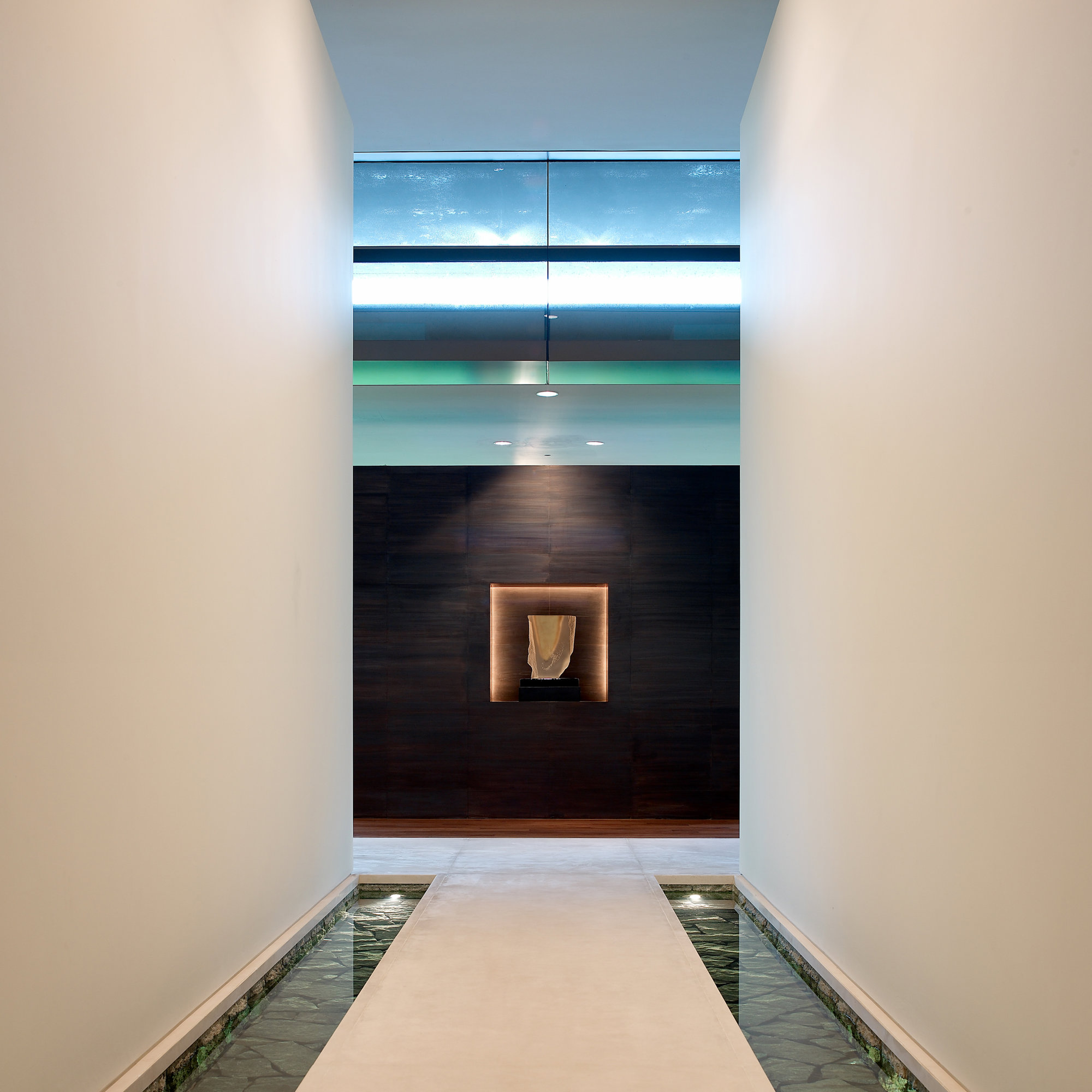 Geometric rills cut into the stone floor of the entrance hall introduce water as unifying natural element; its treatment throughout varies in depth, movement and illumination to complement the tone and function of the different parts of the house. The rooms themselves are conceived as a sequence of tactile experiences, animated by the changing light. The stone walls are rusticated to contrast with the smooth floors and cut into deep bands. In places, segments of onyx are embedded in the walls, while in others a slim layer of stone has been inserted between two layers of glass to form translucent shading screens. Illuminated recesses and stone plinths are integrated to aid the display of the client’s extensive collection of art.