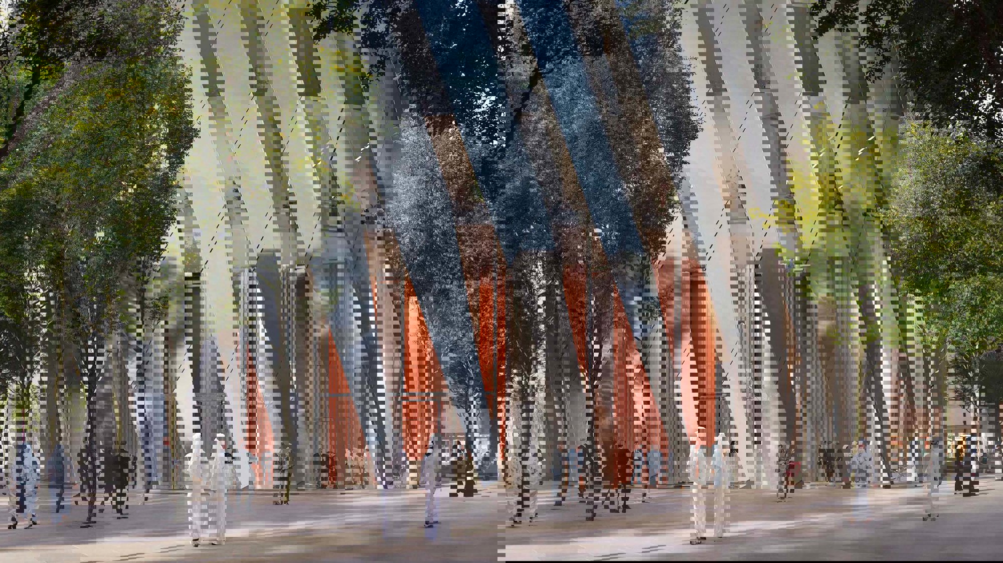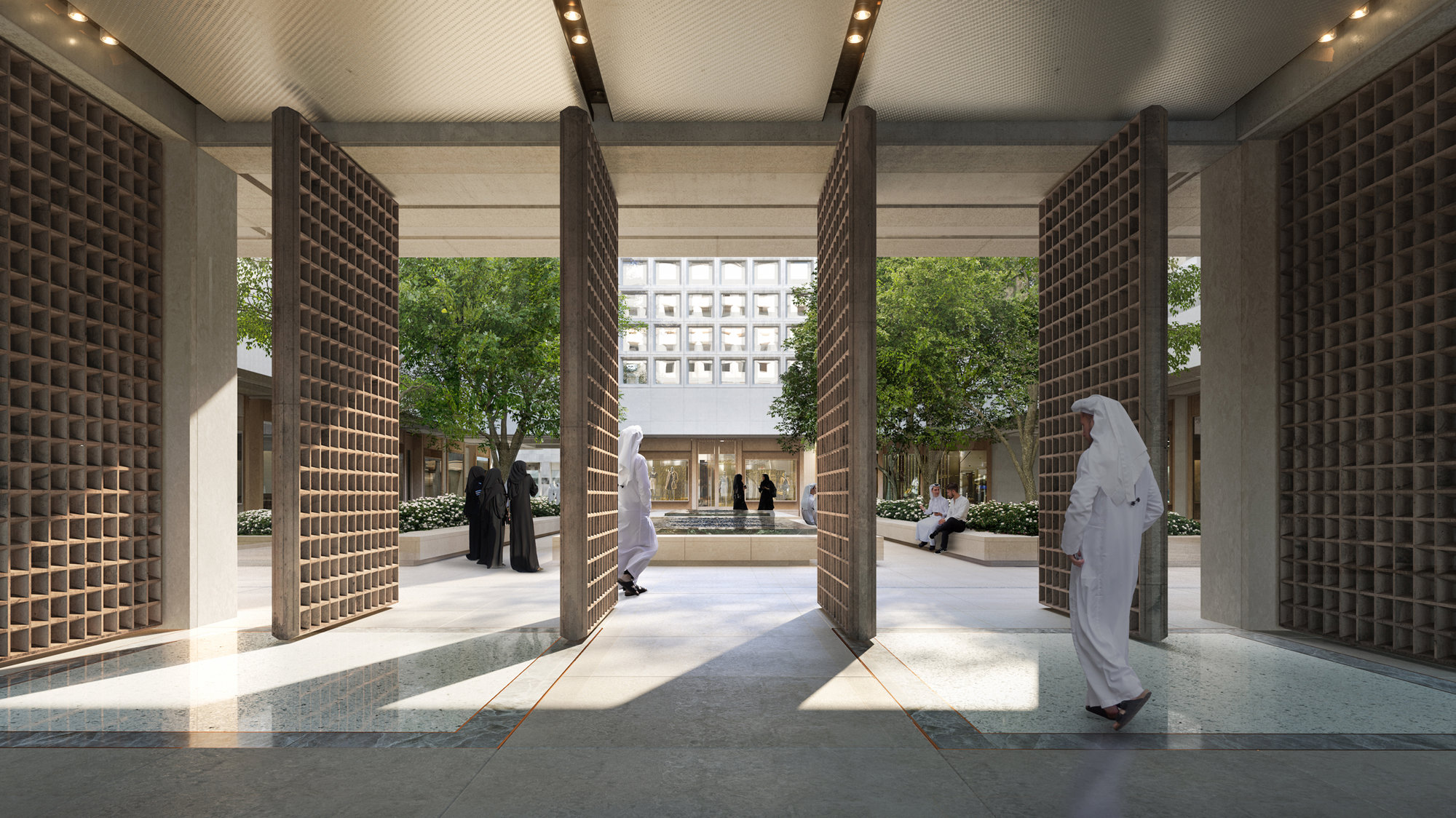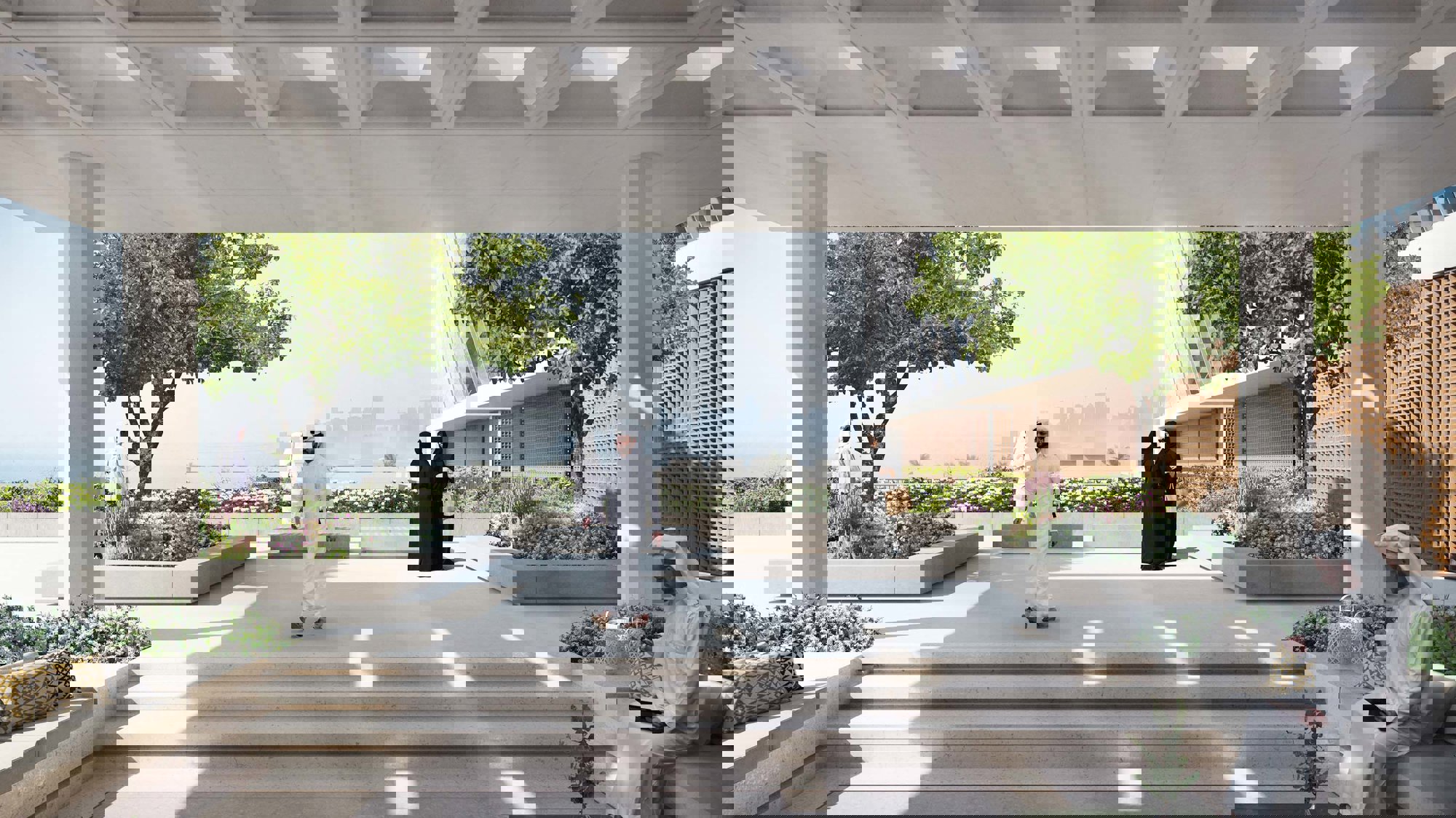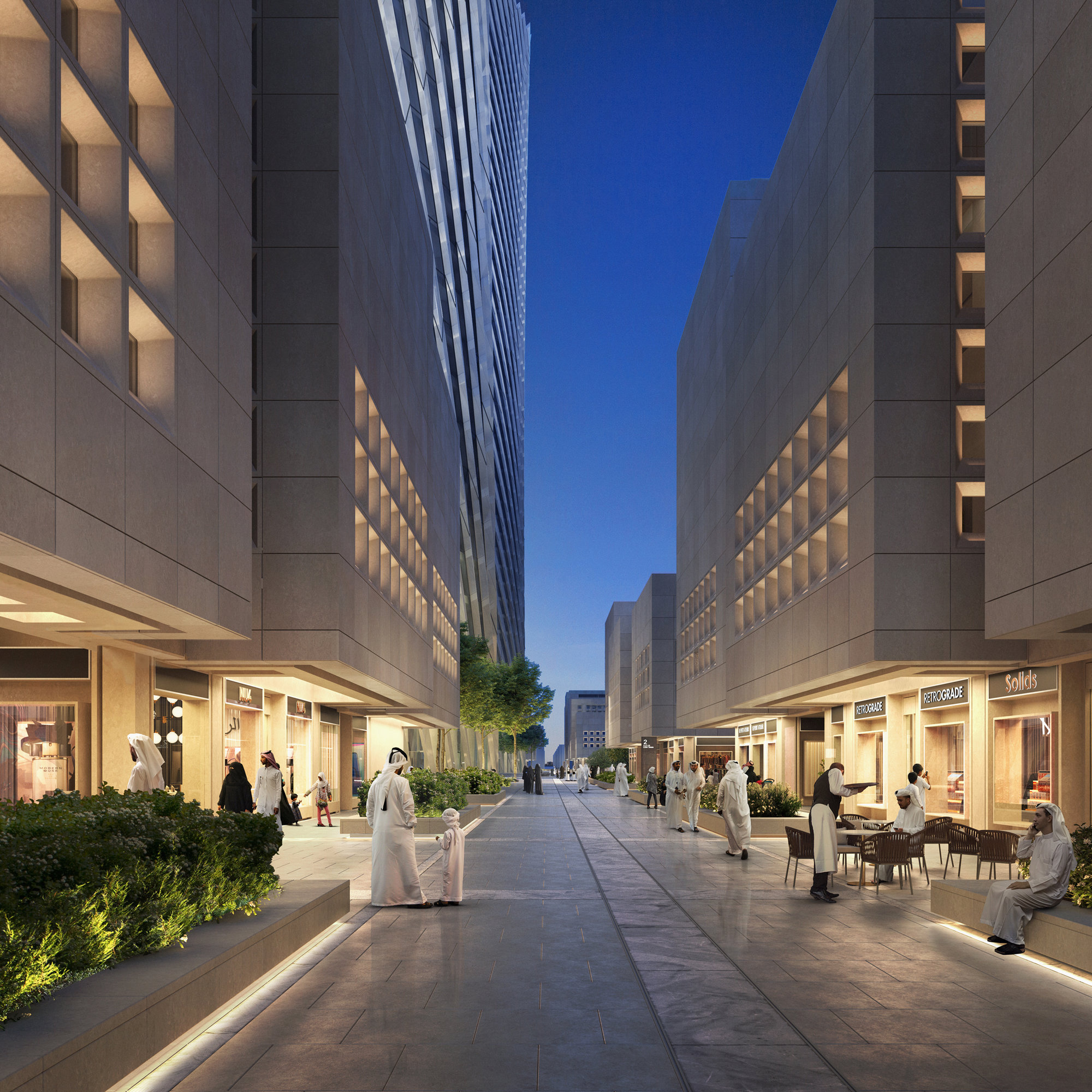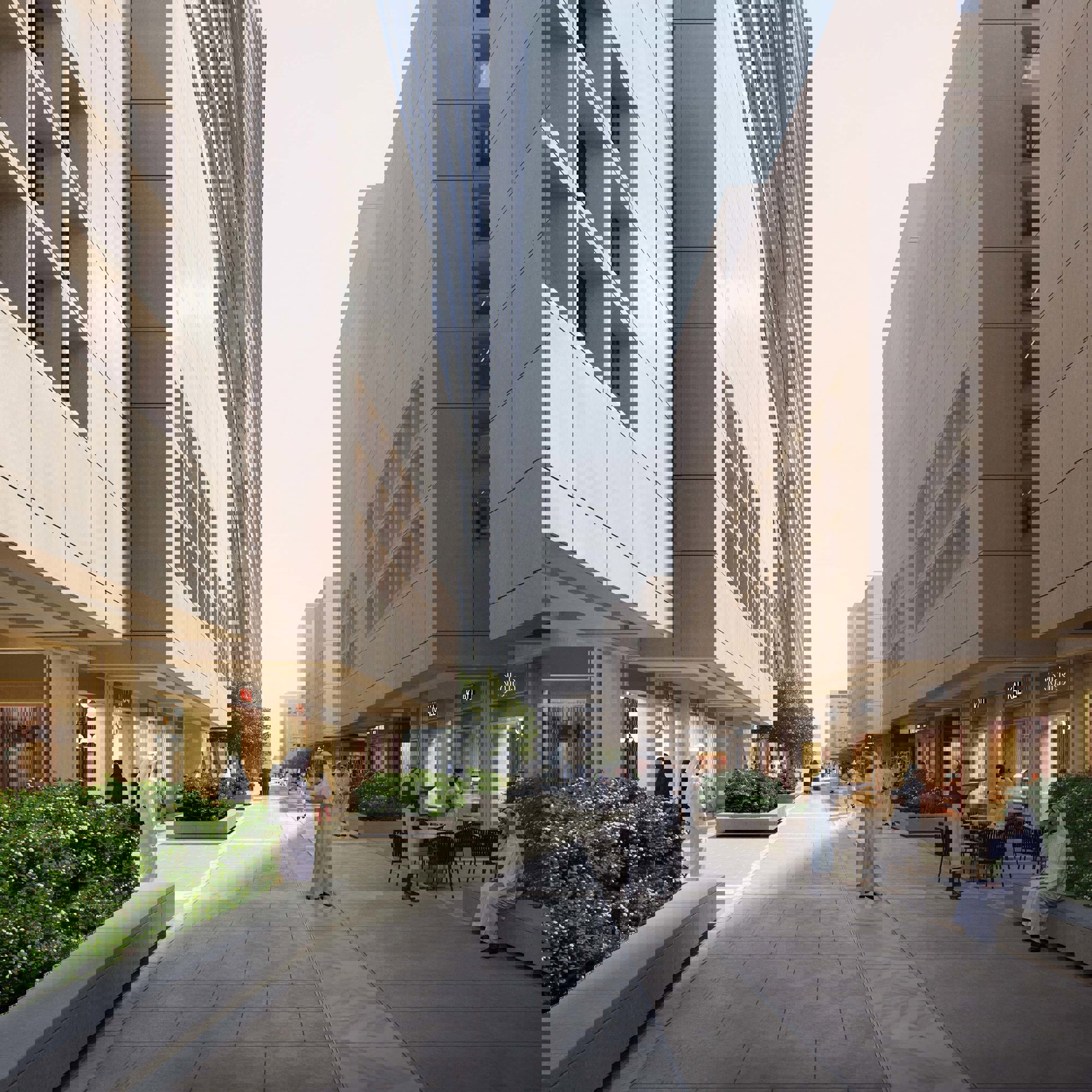 The podium buildings feature ultra-high-performance concrete, lightweight and low carbon moulded concrete panels, giving the buildings a high thermal mass, with minimal punched windows that reduce the amount of solar heat to the interior spaces. 20% of the site is covered with lush but drought-tolerant landscape, where more than 70% of the species are native. Inspired by the learnings from the region, the narrow human-scaled streets and shaded terraces create an inviting public realm at ground level, with the building blocks arranged around courtyards that capture cooling breezes.