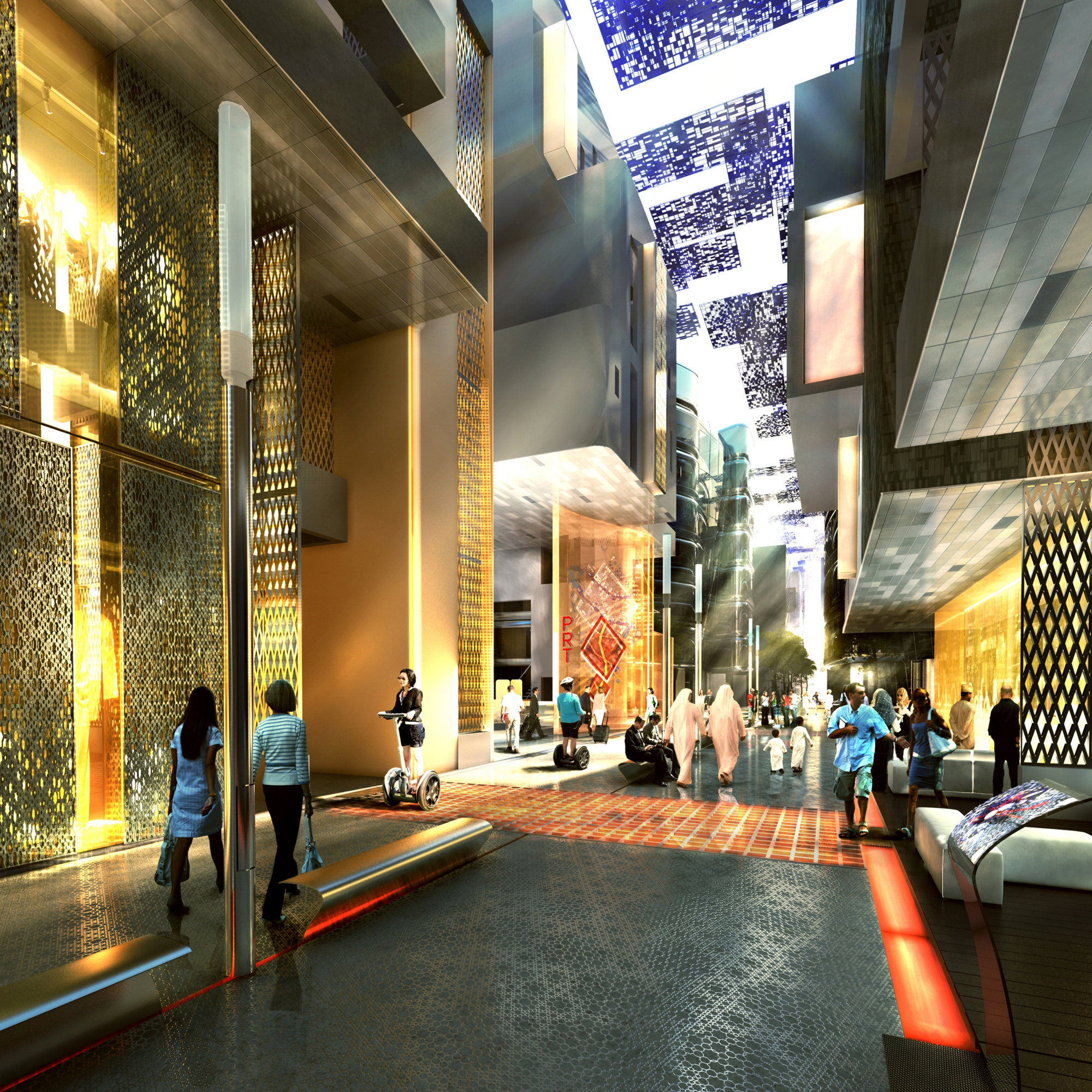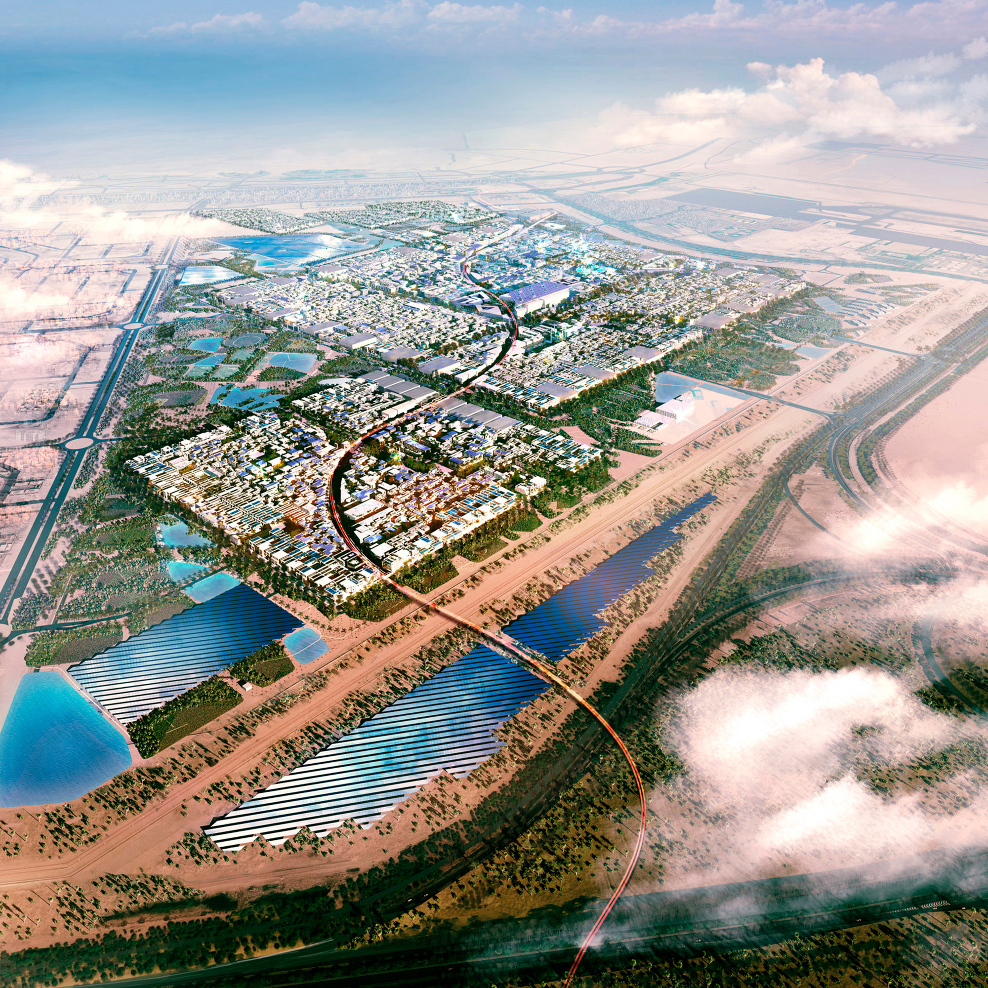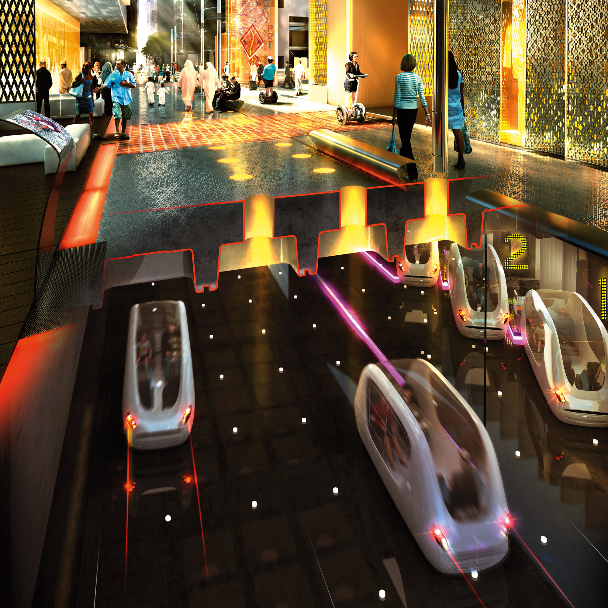 A mixed-use, low-rise, high-density development, Masdar City includes the headquarters for the International Renewable Energy Agency and the recently completed Masdar Institute. Strategically located for Abu Dhabi’s transport infrastructure, Masdar is linked to neighbouring communities and the international airport by existing road and rail routes. The city itself will be the first modern community in the world to operate without fossil-fuelled vehicles at street level. With a maximum distance of 200 metres to the nearest rapid transport links and amenities, the city is designed to encourage walking, while its shaded streets and courtyards offer an attractive pedestrian environment, sheltered from climatic extremes. The land surrounding the city will contain wind and photovoltaic farms, research fields and plantations, allowing the community to be entirely energy self-sufficient.
