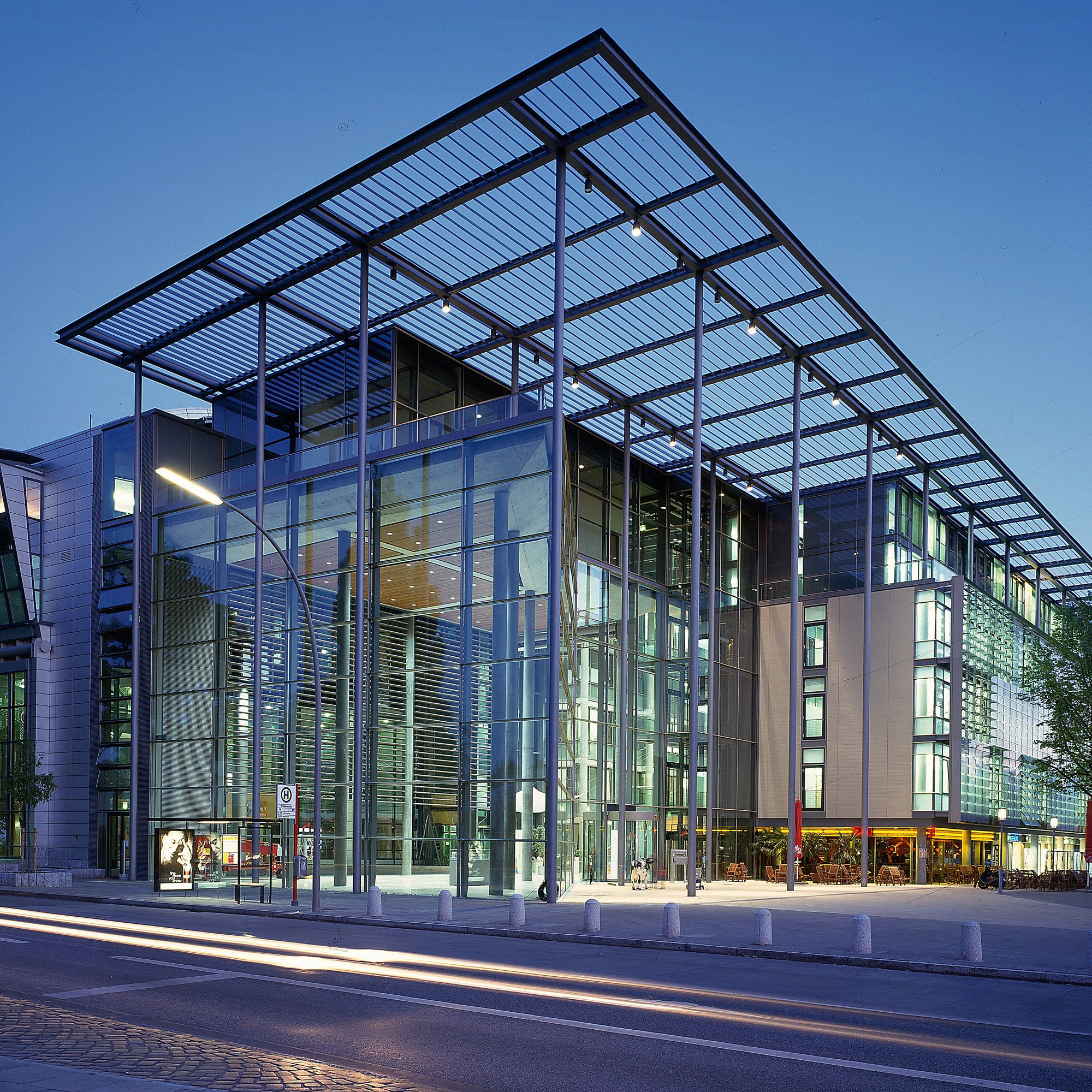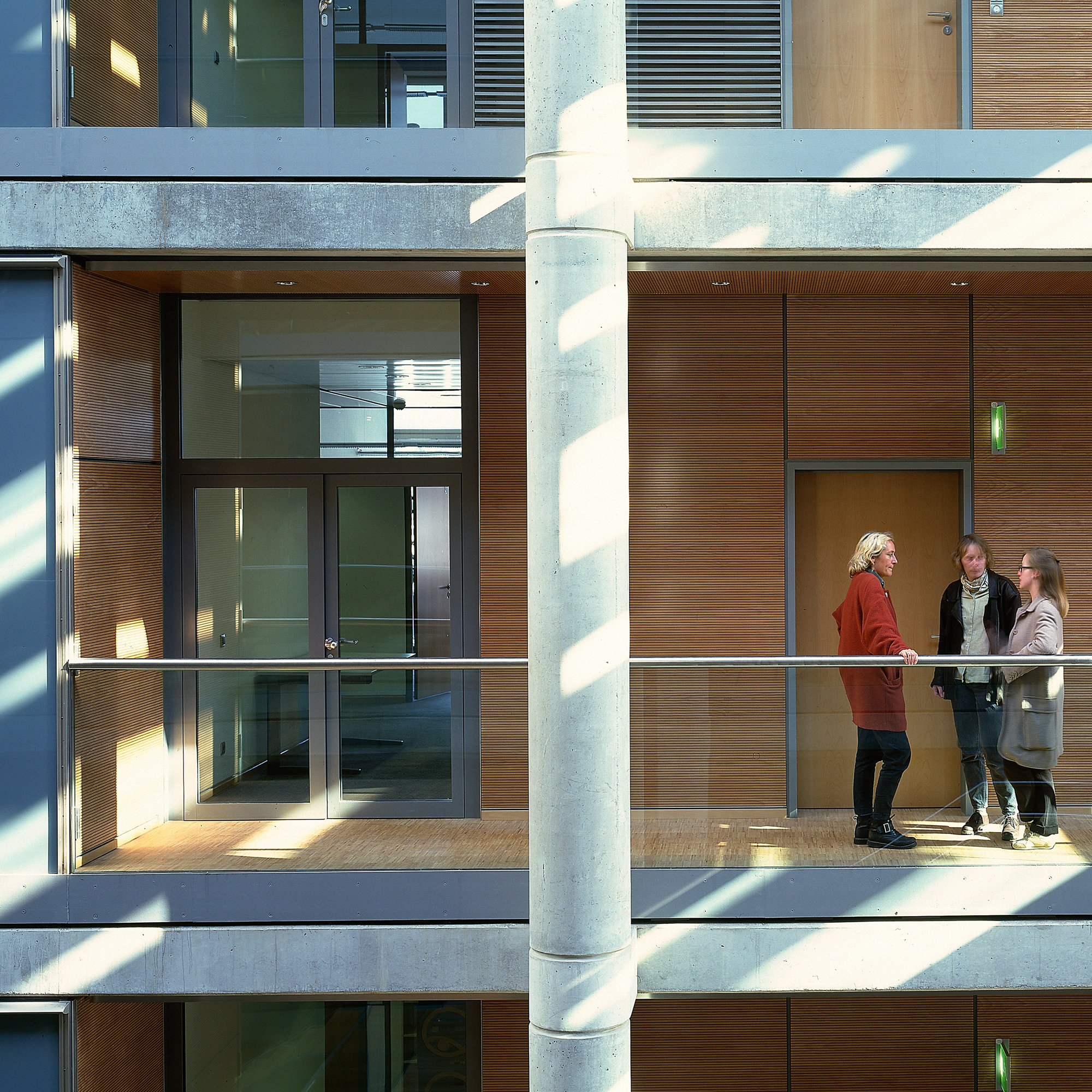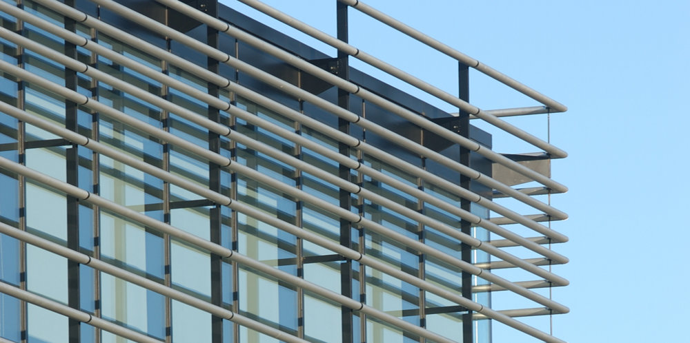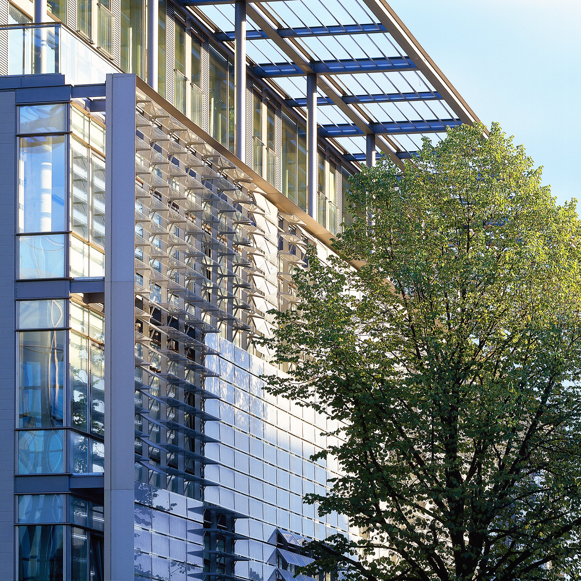 A cantilevered louvred roof provides passive solar protection for the atrium, the Media Circus and the upper levels, and terminates in a canopy above the main entrance. The west facade of the office building is protected against solar gain by adjustable glass louvres, operated individually for each office unit. This allows the use of clear glazing, which avoids colour distortions for the media work, and the louvres form a second skin, creating a constantly changing pattern across the facade.