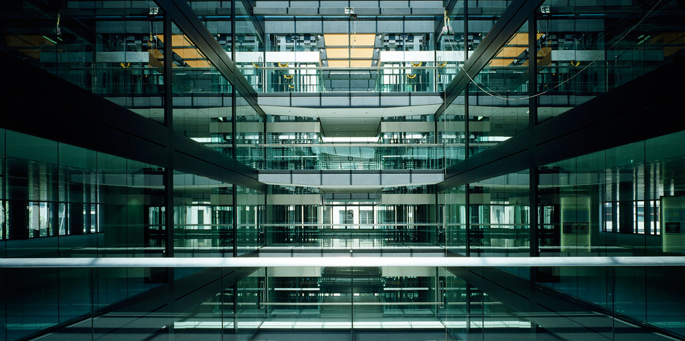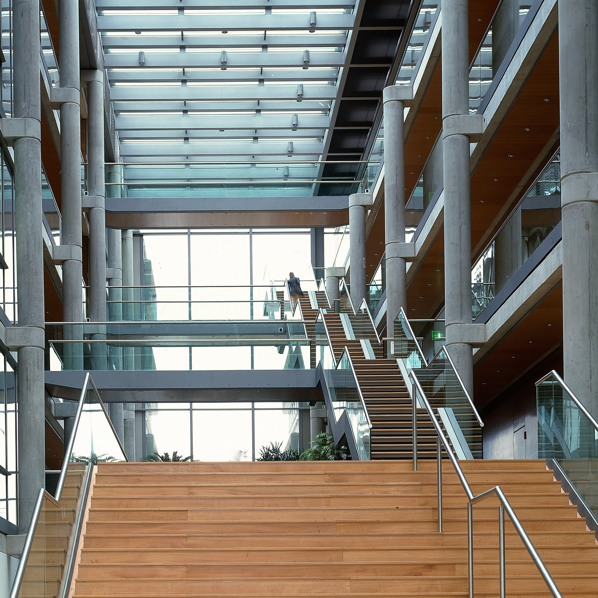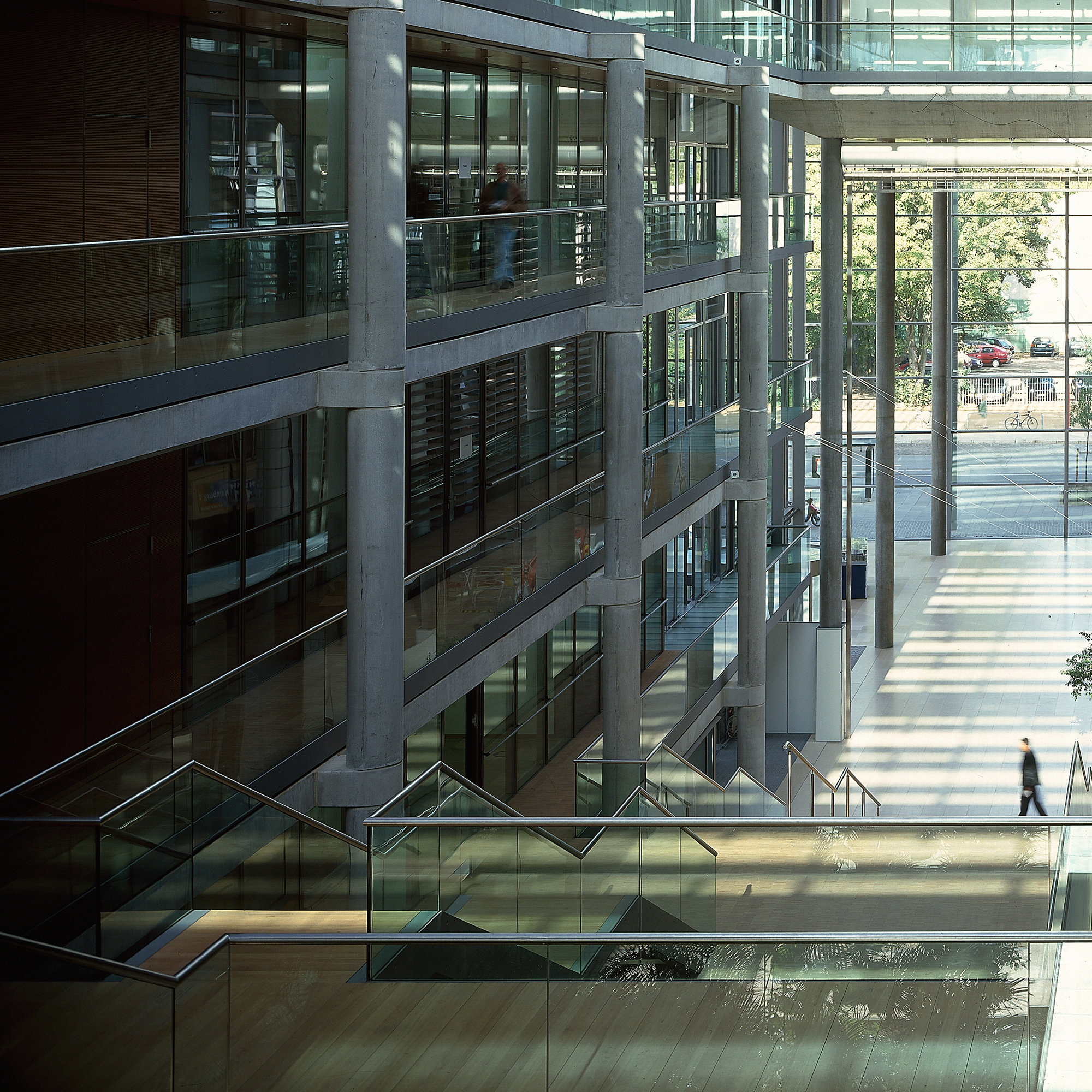 To optimise energy consumption the relatively clean return air from the offices is used to heat and ventilate the atrium. As all the services are integrated within the raised floor, suspended ceilings are not required; this allows the concrete slabs to contribute to the passive temperature control of the building through their inherent thermal mass; moreover, it creates a generous ceiling height of 3 metres.
