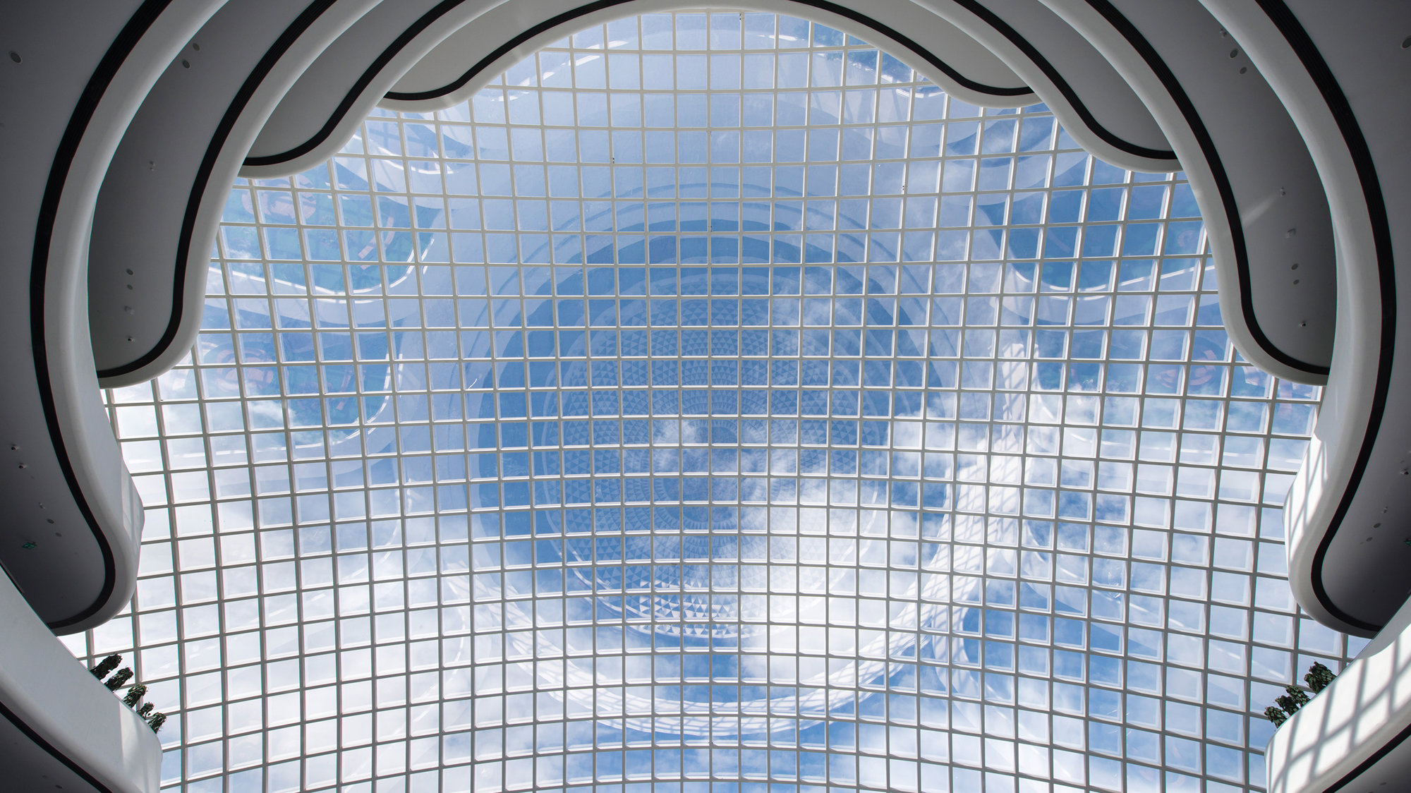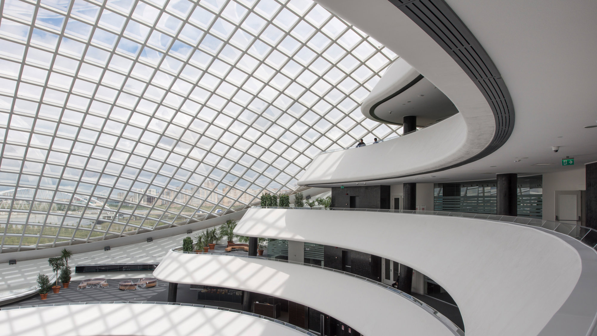 The building is orientated towards the north, directly facing the Presidential Palace, and its white marble façade is seemingly cut away to reveal a glass lens. Each piece of marble on the façade is only 15millimetres thick, to reduce the weight of the stone, which has then been laminated onto an aluminium honeycomb mesh to give it stability. The glazed roof is a shallow dome, supported by a steel frame and a steel ring beam that gives the structure its strength. Internally, the floors step back to reveal a large atrium at ground level. The study desks on the library floors face out onto the atrium, creating a dynamic, interactive space for research, similar to the practice’s earlier work on the Berlin Free University.
