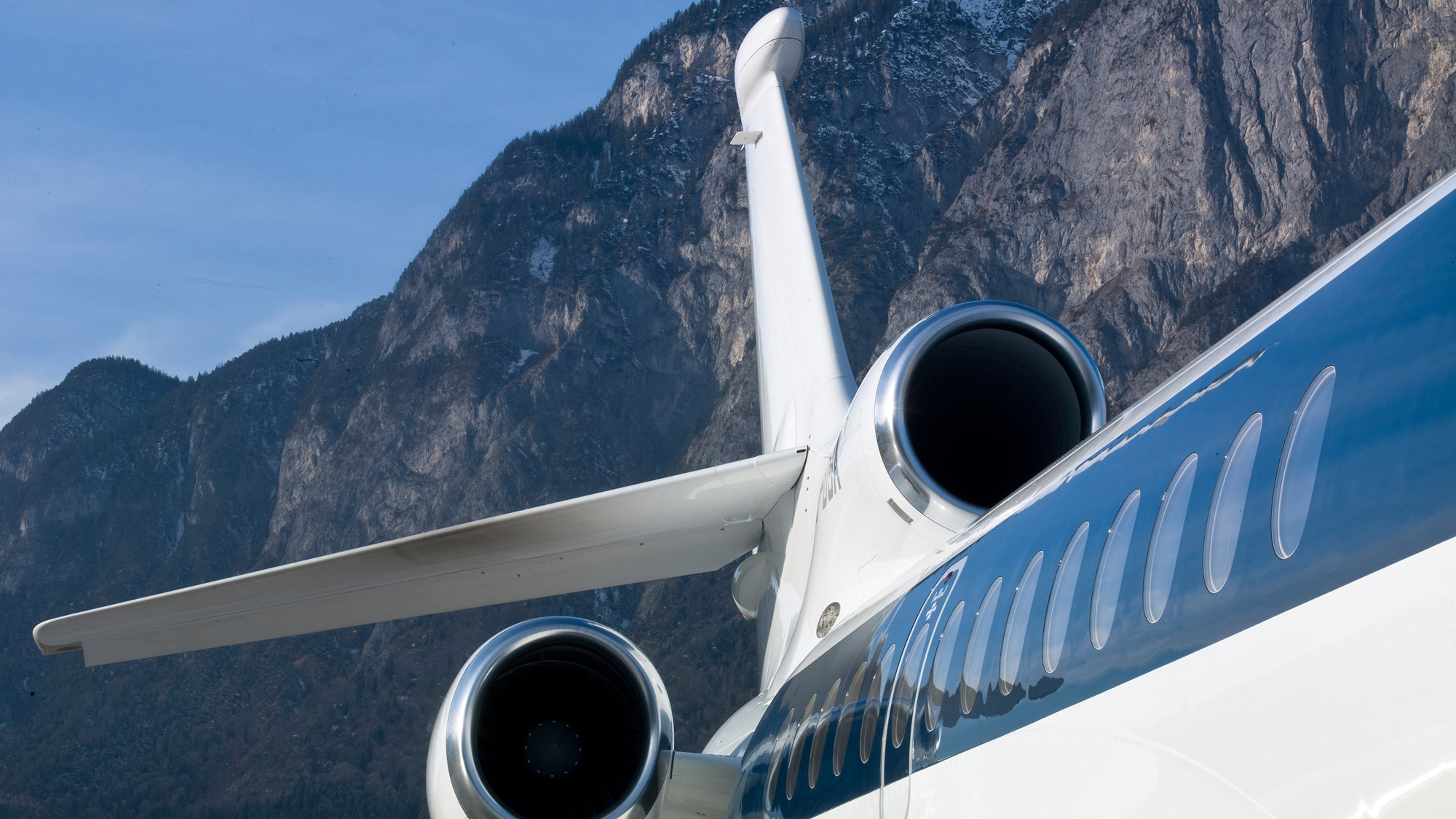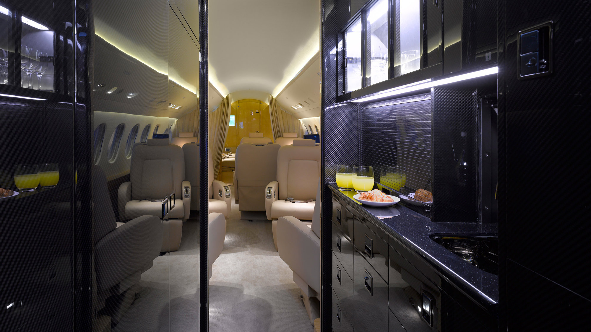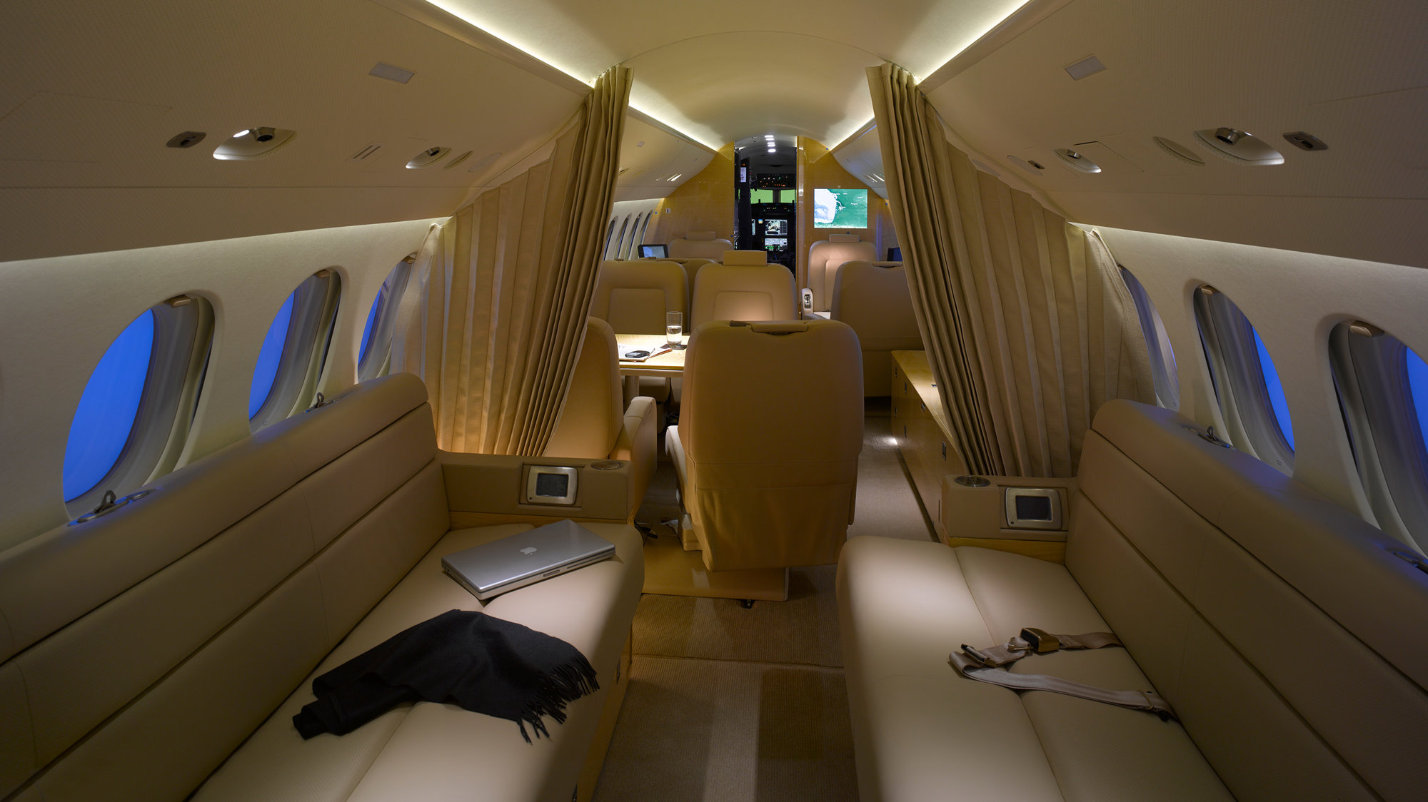 Materials are used in new and subtle ways. Carbon fibre is utilised for its lightness, strength and durability, and is used here as a veneer for the first time. The seating is a mixture of perforated and solid leather, which breaks down the bulk, improving both aesthetics and comfort. The areas that support the crew and the cockpit are sensitive to issues of glare, so are darker and integrate materials such as sheepskin, which is favoured by pilots for comfort. One of the most striking features is the new livery. The bold, dark blue horizontal stripe across the windows of the cockpit and cabin gives the aircraft a sleeker form. Although it was devised specifically for the Falcon 7X, NetJets was so impressed by this subtle branding that it is applying the scheme to its entire fleet.