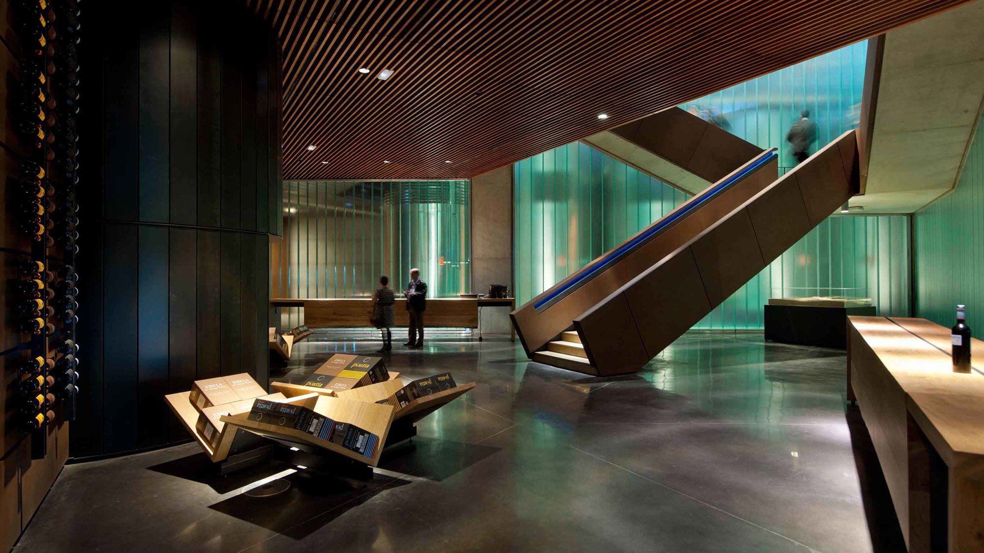 Reflecting the growth in wine tourism and its importance to the industry, a raised public gallery at the heart of the winery extends into glazed mezzanine areas, allowing visitors to see the different stages of production. Between the wings, reception areas with terraces and water pools overlook the vineyards. Lined with slats from recycled wine barrels, the public areas evoke the rich tradition of winemaking in the region.