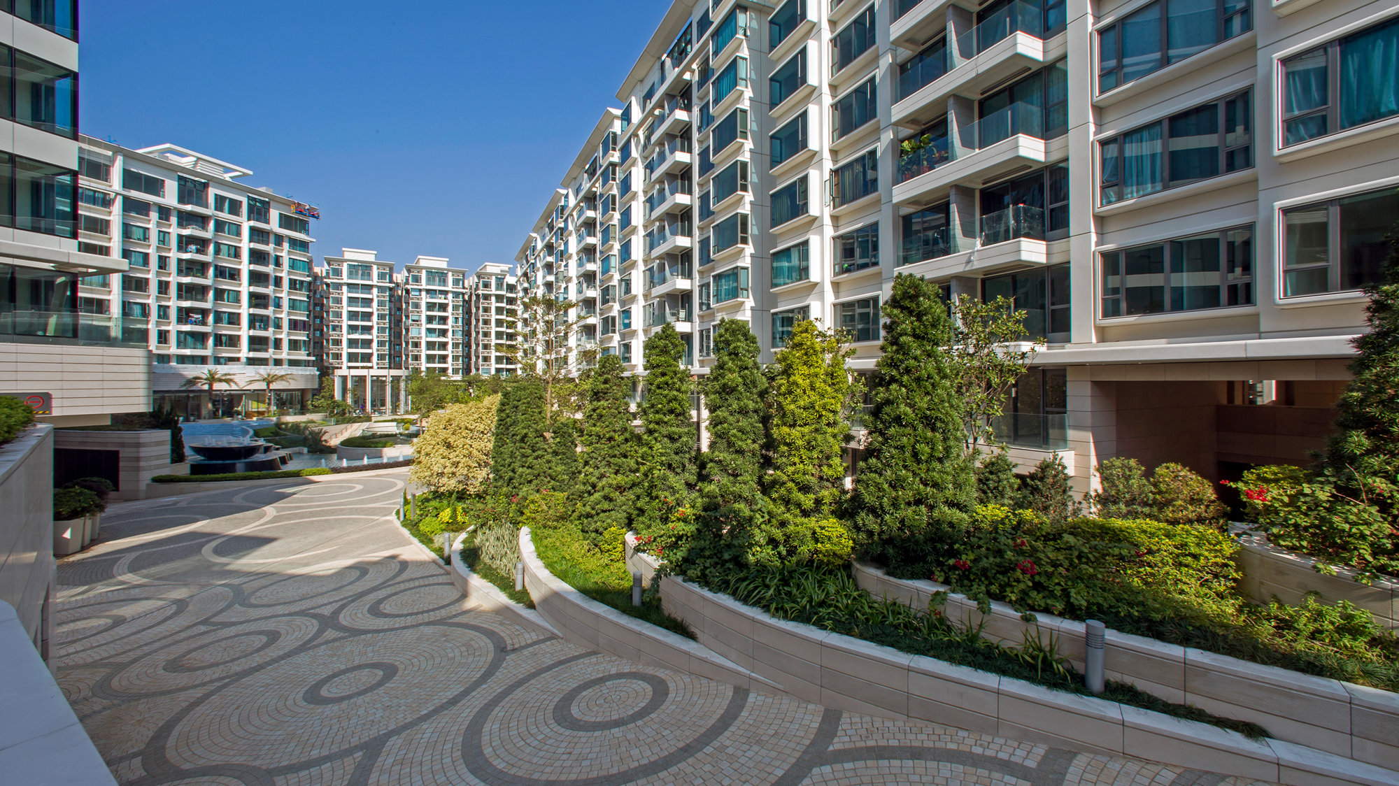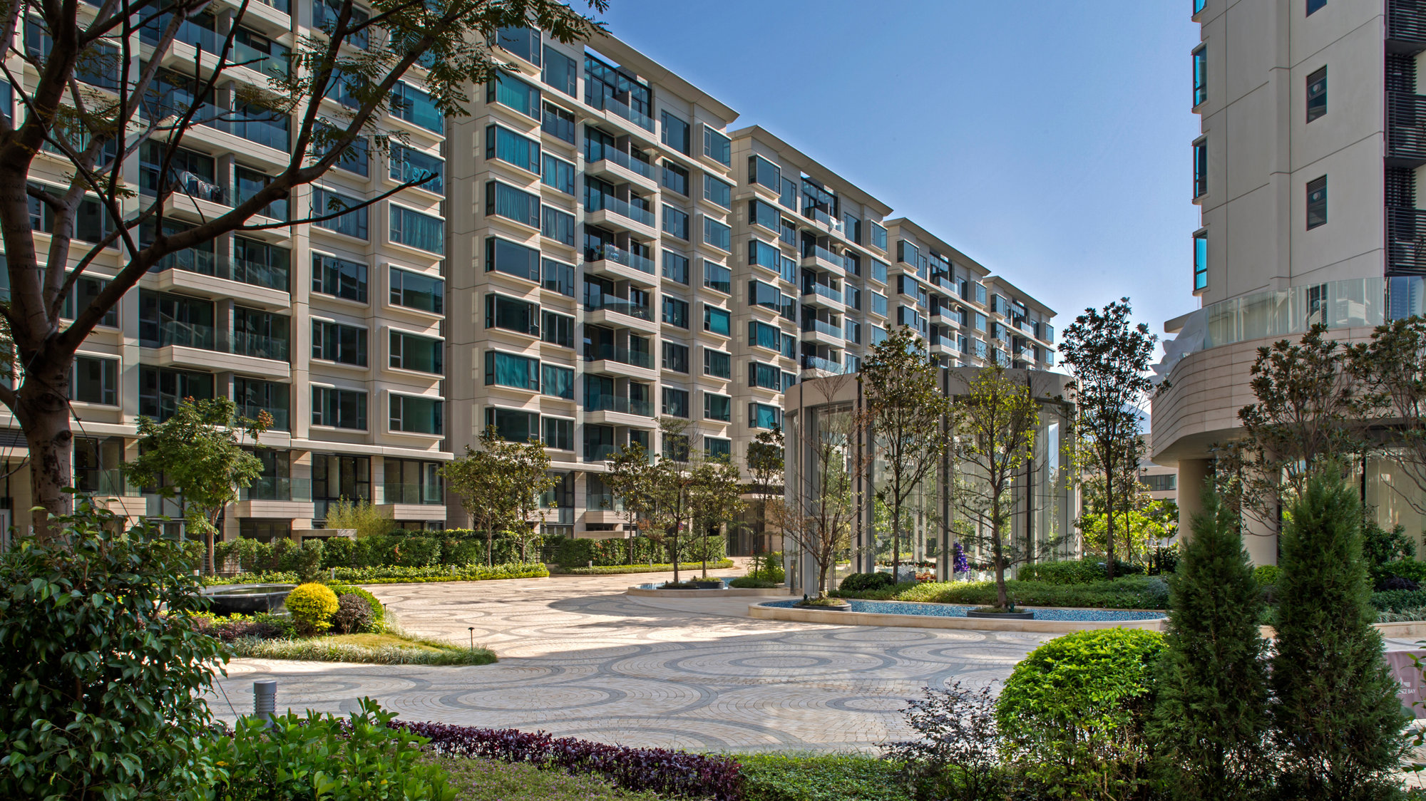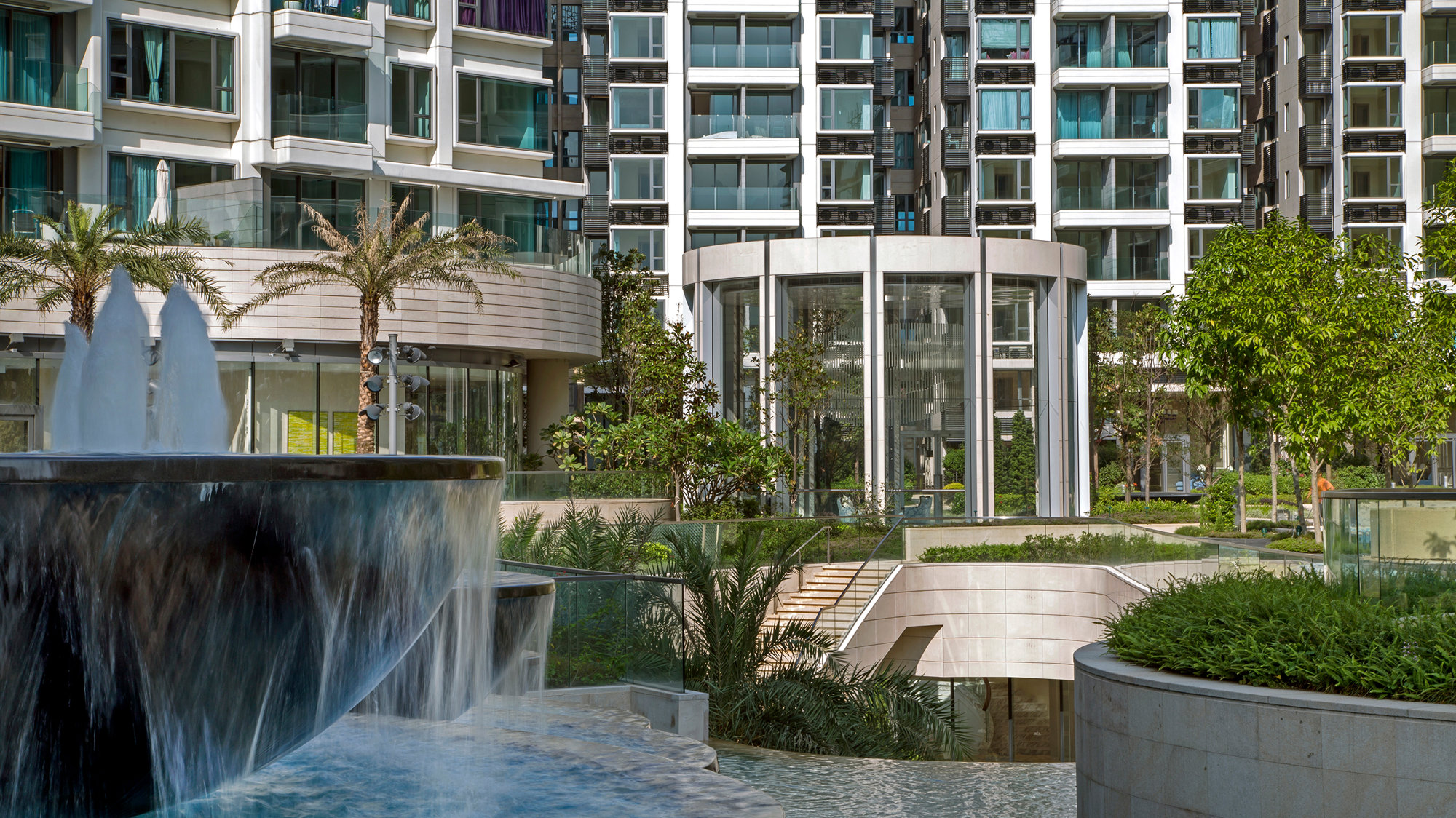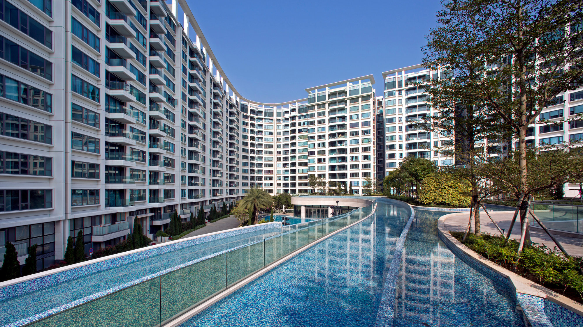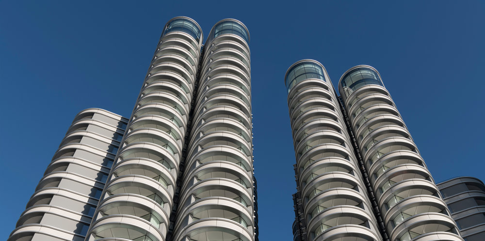 The buildings are arranged in three clusters and are vertically staggered to form a natural barrier between the waterfront and the busy road bounding the northern edge of the site. The fluid contours of the swimming pools and landscaped grounds provide a dynamic inward focus, and the cores are placed to the rear of the buildings to maximise views out towards the harbour. Filled with natural light, the living spaces lead to generous balconies and terraces, some with private swimming pools, and the apartment buildings are topped by lush gardens.