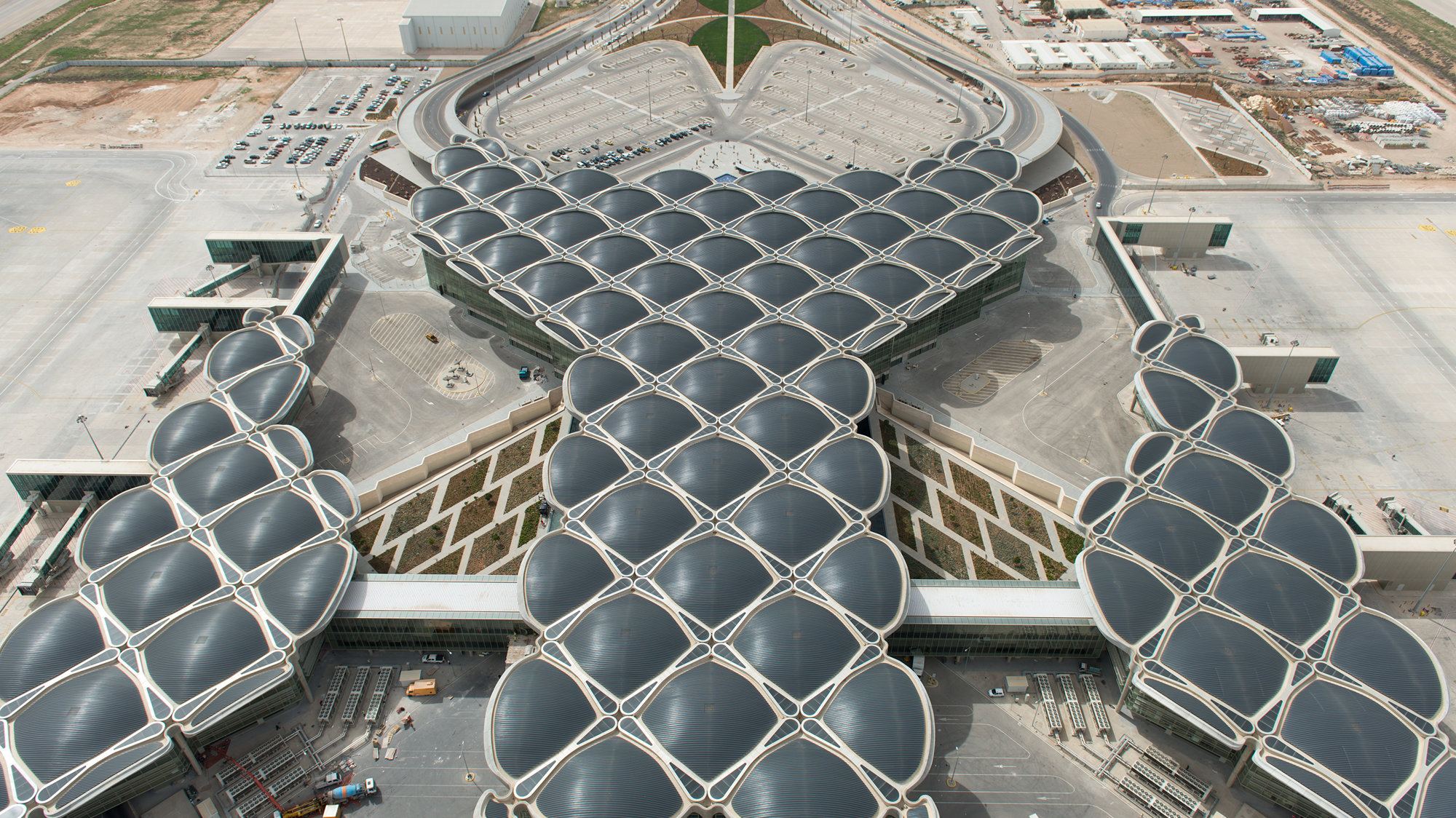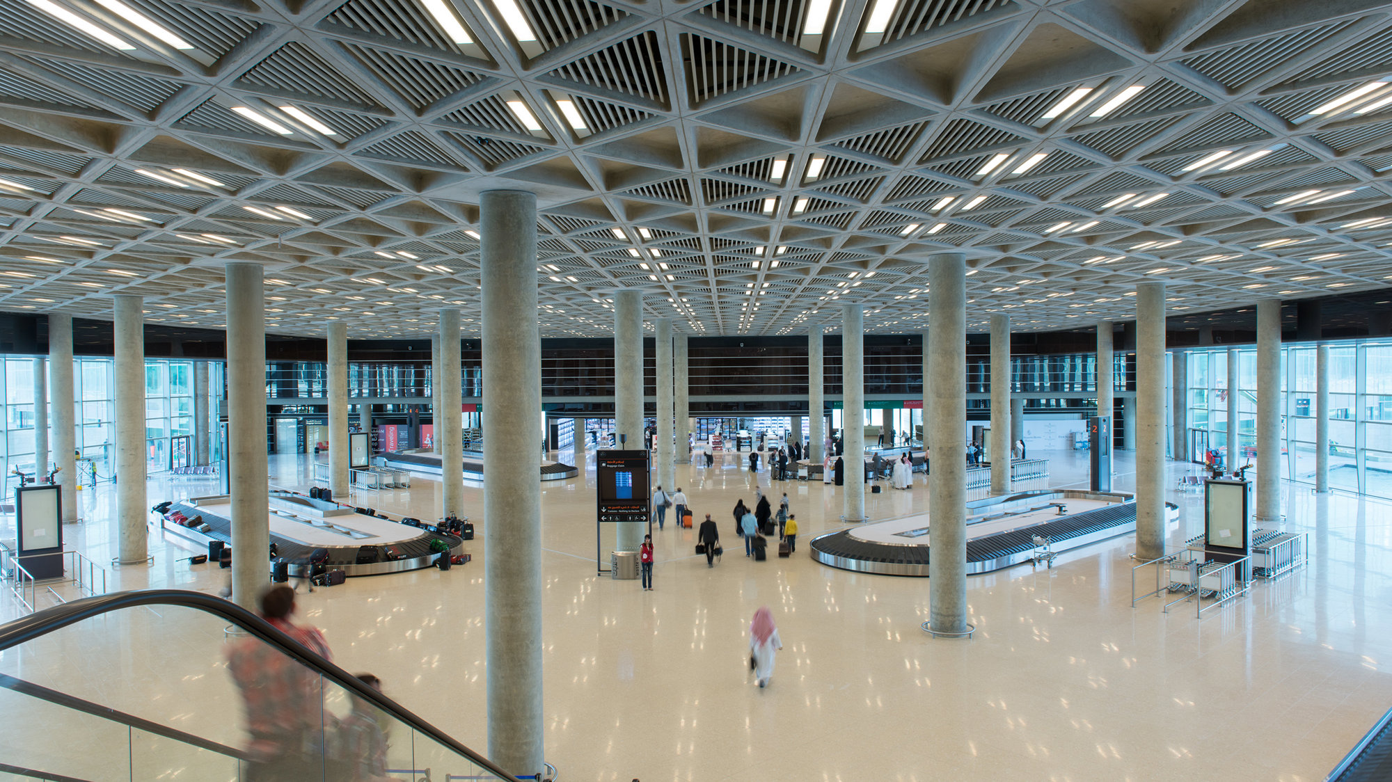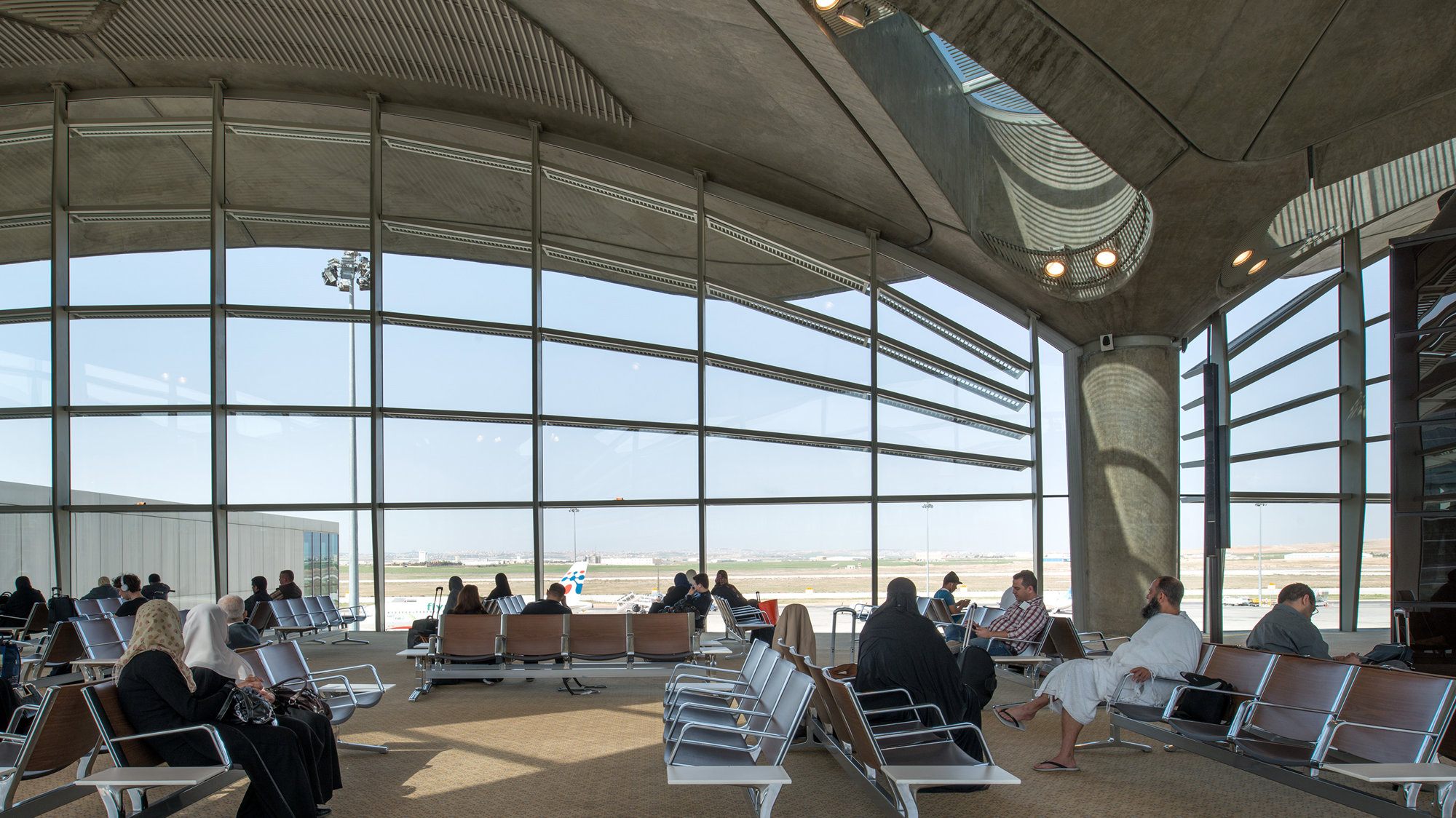 The terminal is glazed on all sides to open up long views to the aircraft on the apron and aid orientation. Two piers of departure gates run along either side of the central building, which contains the main processing areas and shops, lounges and restaurants. Between these volumes, open-air courtyards draw on vernacular Arabic architecture and contribute to the terminal’s environmental strategy: the plants and trees help to filter pollution and pre-condition the air before it is drawn into the air handling system. In celebration of the tradition for family groups to congregate at the airport, the forecourt has been enlarged to create a landscaped plaza with seating, shaded by trees, where people can gather to bid farewell or welcome returning travellers.