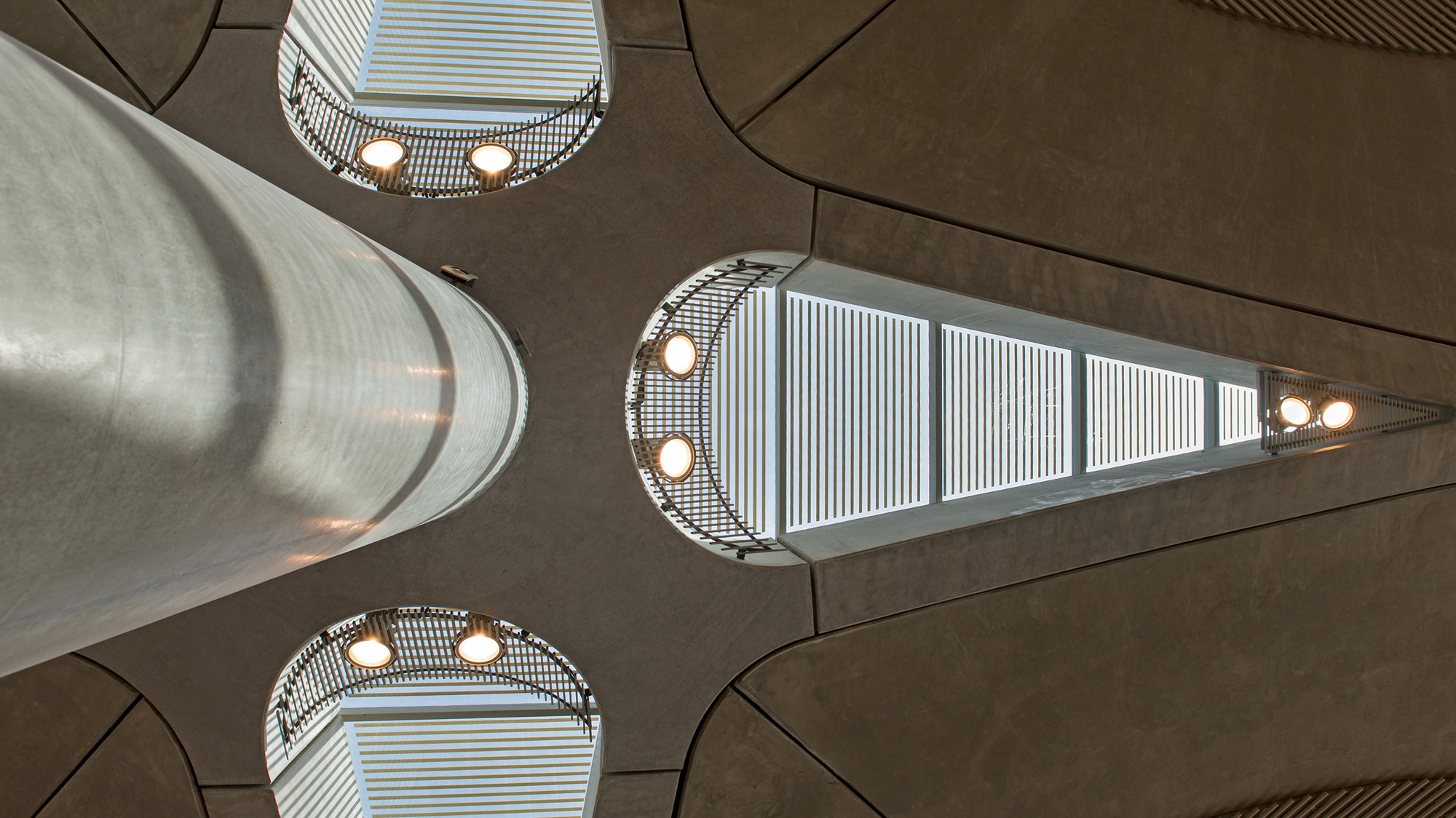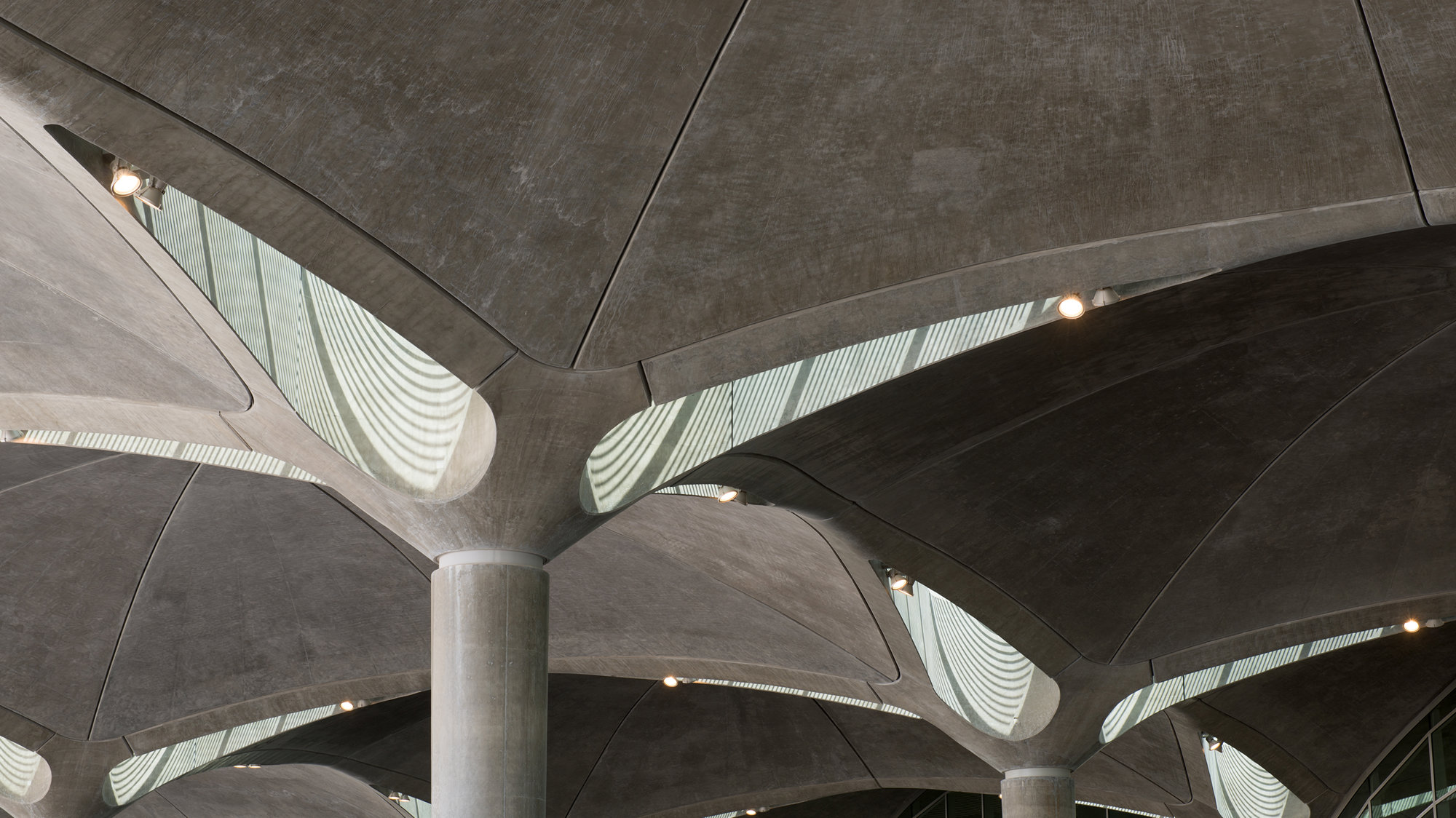 In response to local building expertise and Amman’s climate, where summer temperatures vary markedly between daytime and night time the building is constructed entirely from concrete, the high thermal mass of the material providing passive environmental control. The tessellated roof canopy comprises a series of shallow concrete domes, which extend to shade the facades. To enable seamless future expansion, each dome is a modular unit. The domes branch out from the supporting columns like the leaves of a desert palm and daylight floods the concourse through split beams at the column junctions. Echoing the veins of a leaf, a geometric pattern based on traditional Islamic forms is applied to each exposed soffit.