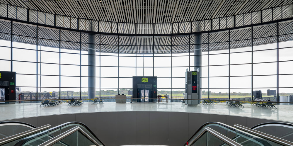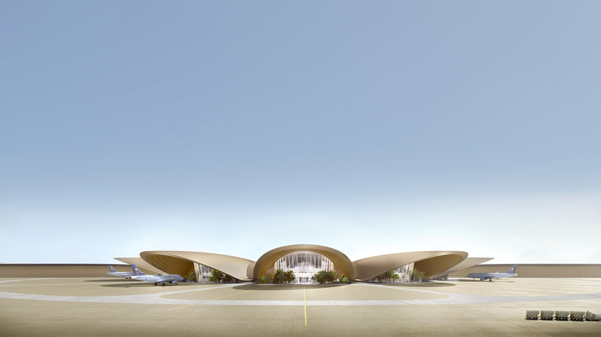 The design of the terminal aims to bring the experience of a private aircraft terminal to every traveller by providing smaller, intimate spaces that feel luxurious and personalised. The form of the roof shells cantilevers on the landside and airside to provide shade to the passengers. An internal green oasis with an indigenously planted garden forms a green focus, creating a relaxed, resort-like atmosphere within the airport terminal. The airport will be powered by 100 percent renewable energy.