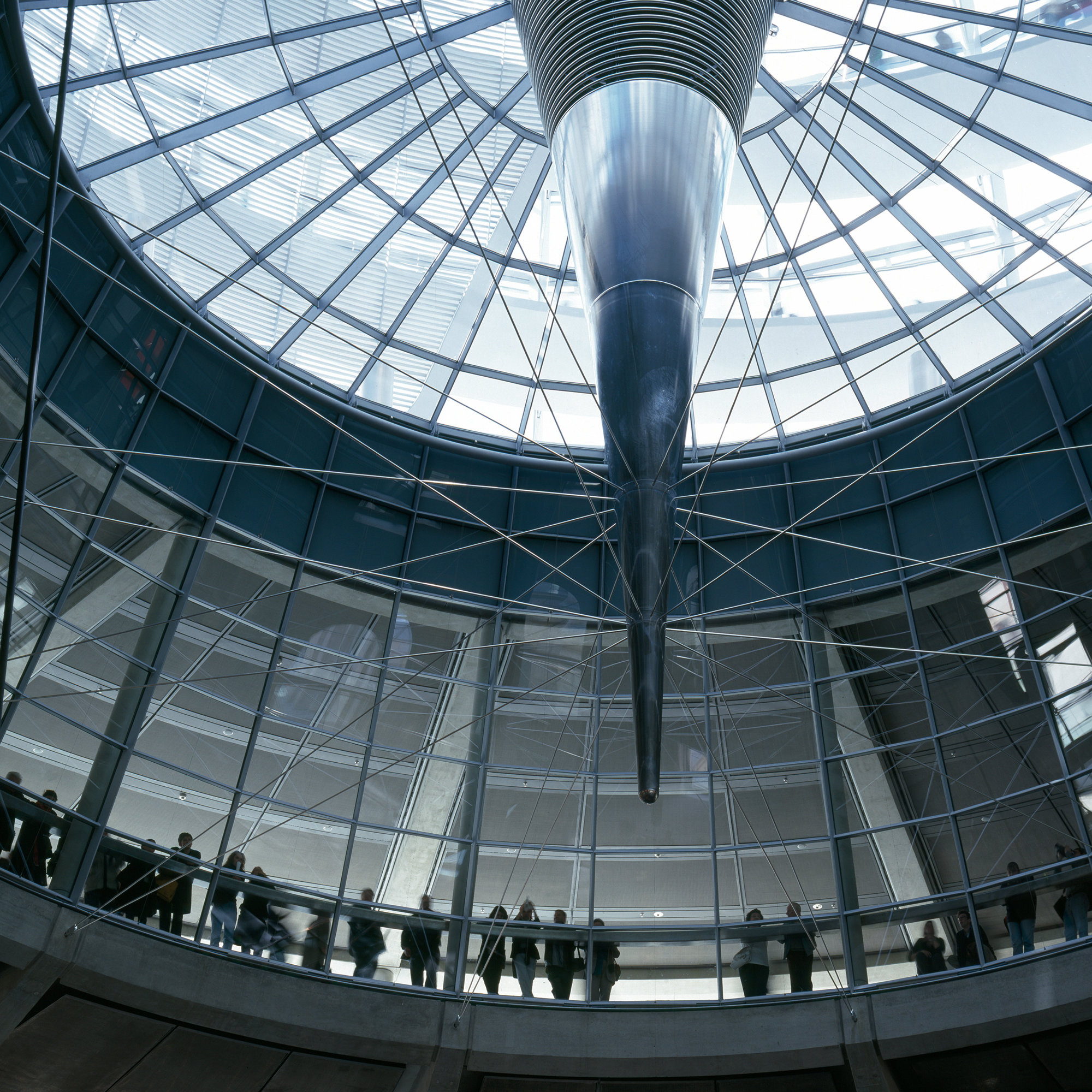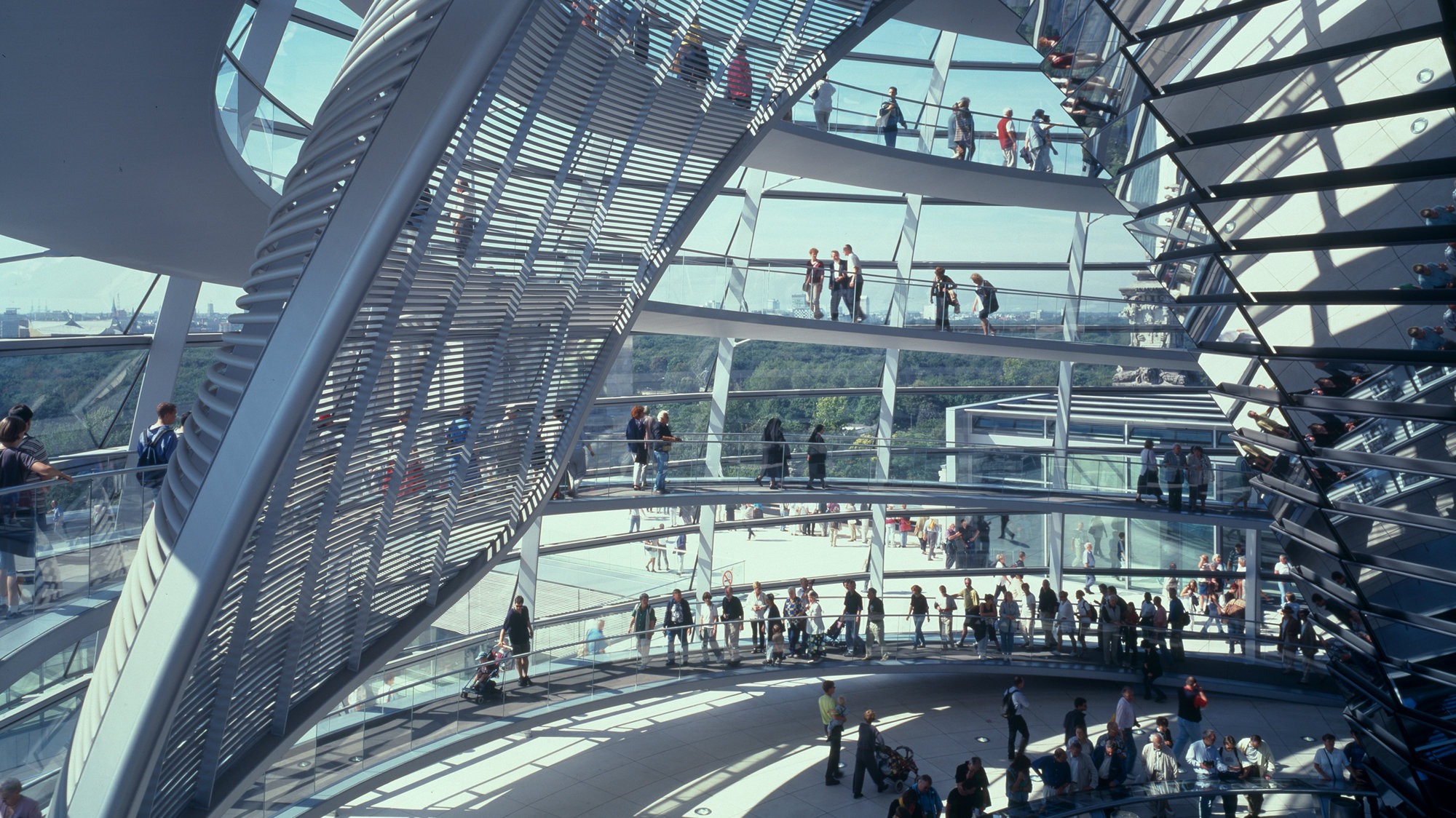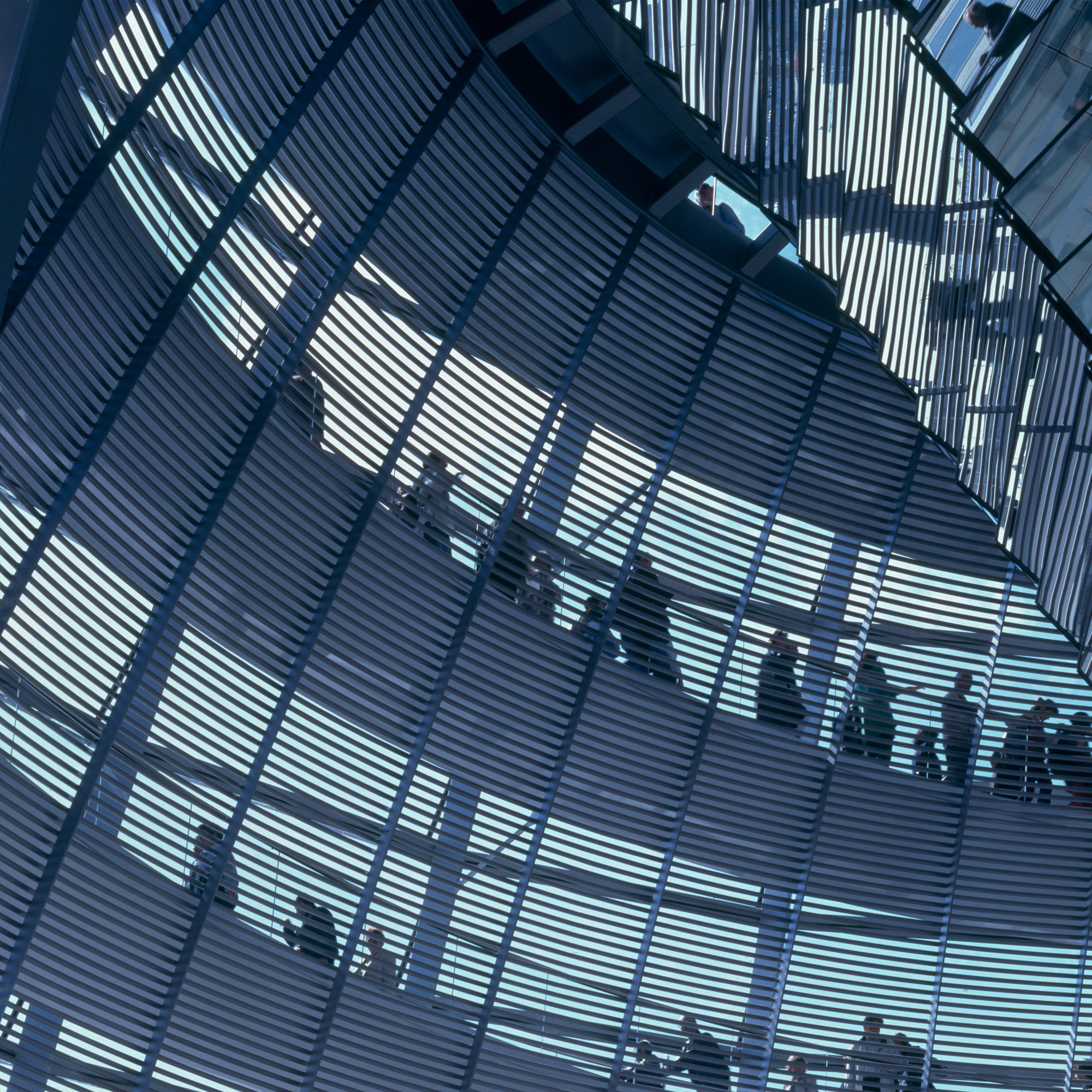 Public and politicians enter the building together and the public realm continues on the roof in the terrace restaurant and in the cupola, where ramps lead to an observation platform, allowing people to ascend symbolically above the heads of their representatives in the chamber. The cupola is now an established Berlin landmark. Symbolic of rebirth, it also drives the building’s natural lighting and ventilation strategies. At its core is a ‘light sculptor’ that reflects horizon light down into the chamber, while a sun-shield tracks the path of the sun to block solar gain and glare. As night falls, this process is reversed – the cupola becomes a beacon on the skyline, signalling the vigour of the German democratic process.