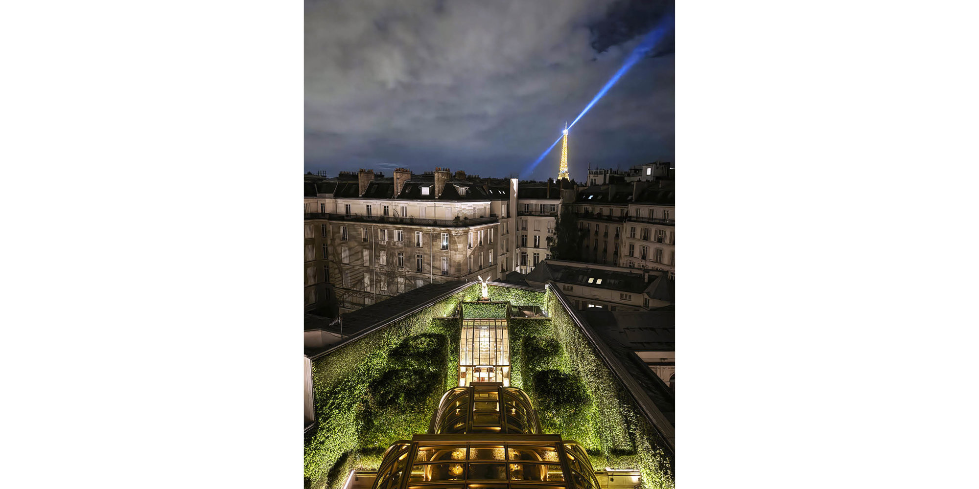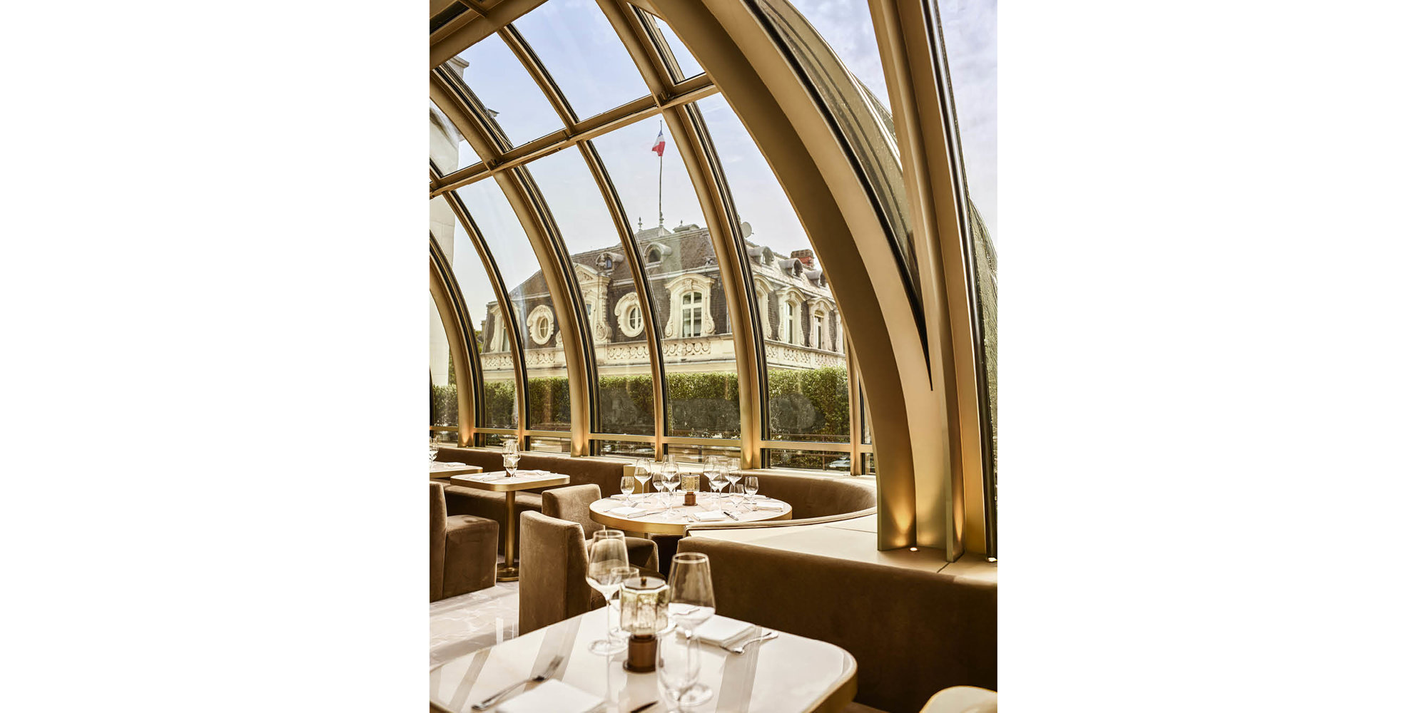 The lift strategy ties together the different spaces and ensures efficient movement across the building’s five storeys. Owing to the prestigious location and strict zoning constraints, a conventional lift with a permanent rooftop level enclosure was not an option, as it would have been visible from the Champs-Élysées and blocked the sightline to the Eiffel Tower. Instead, a retractable lift rises only when needed and disappears seamlessly when not in use. When the cab ascends, the hatch opens, and a glass parapet automatically deploys around the opening to provide enclosure and ensure safety.