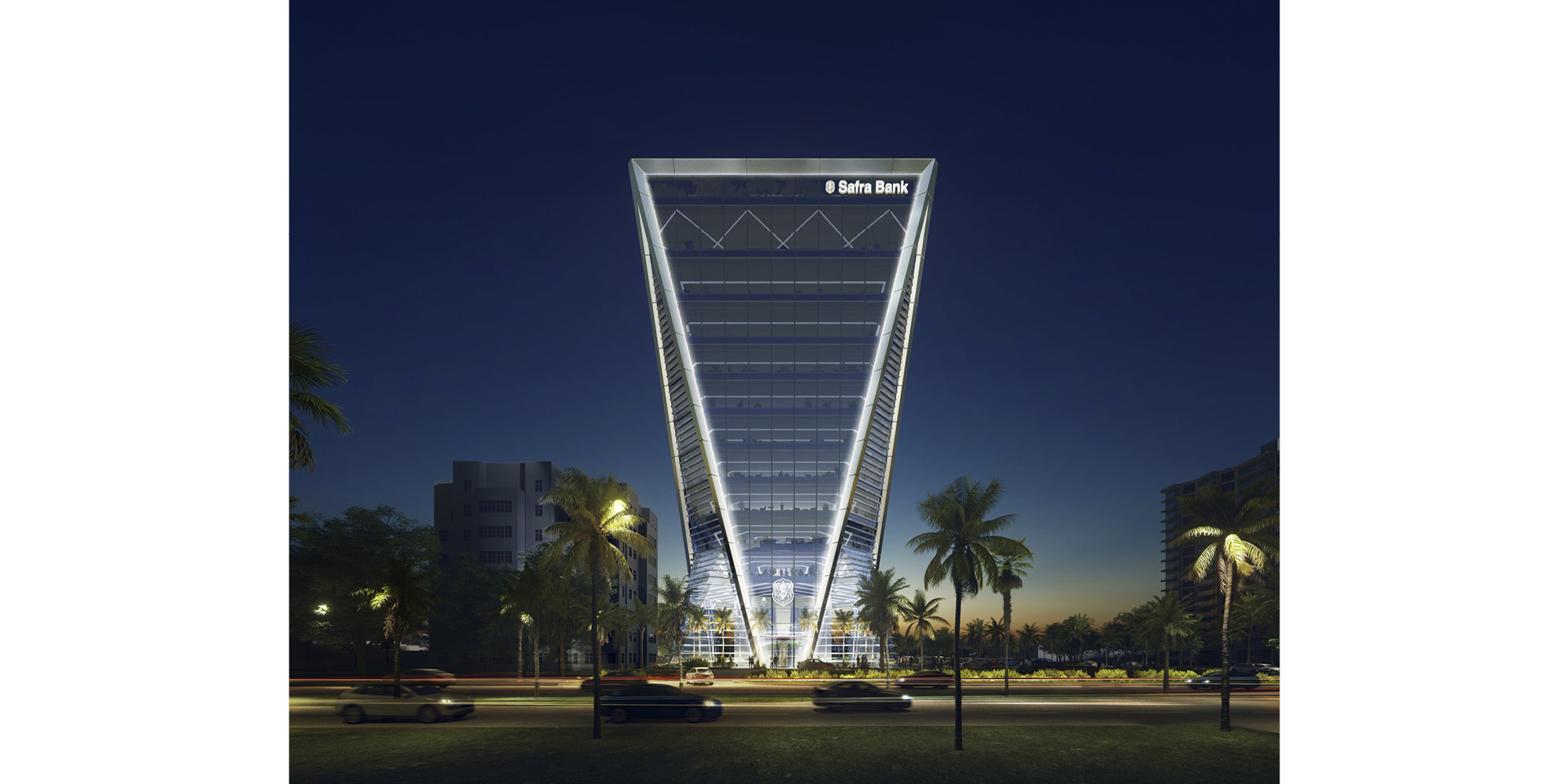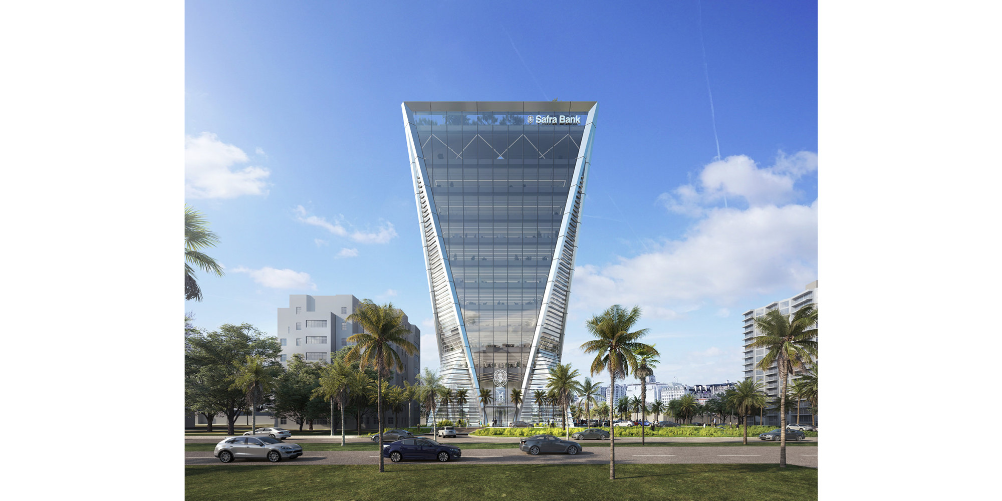 The 210-foot tower for Safra National Bank occupies a prime corner site in Aventura and is part of the city’s vibrant metropolitan area. The building’s striking form is composed of two interlocking prisms, which converge at level two. The form coveys a sense of balance and generates spectacular spaces at the base and top of the tower, where the bank hosts its clients.