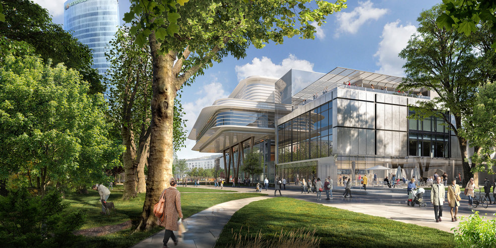 The glazed tower has a steel and anodised aluminium-clad exoskeleton, with louvres that define the four corners and shade the internal spaces. Warmer natural materials, such as timber and limestone, are used in the entrance hall and across the bank’s floors to create a pleasant environment that enhances wellbeing.