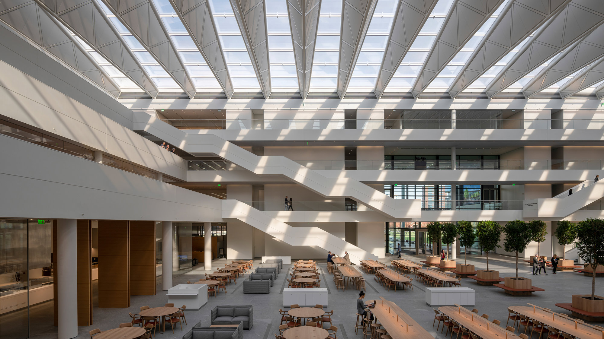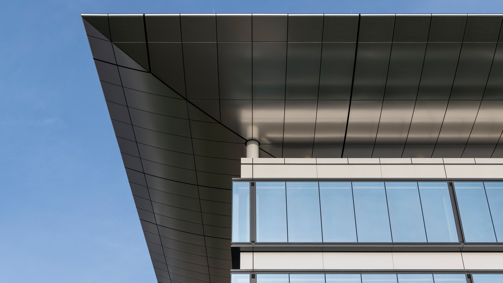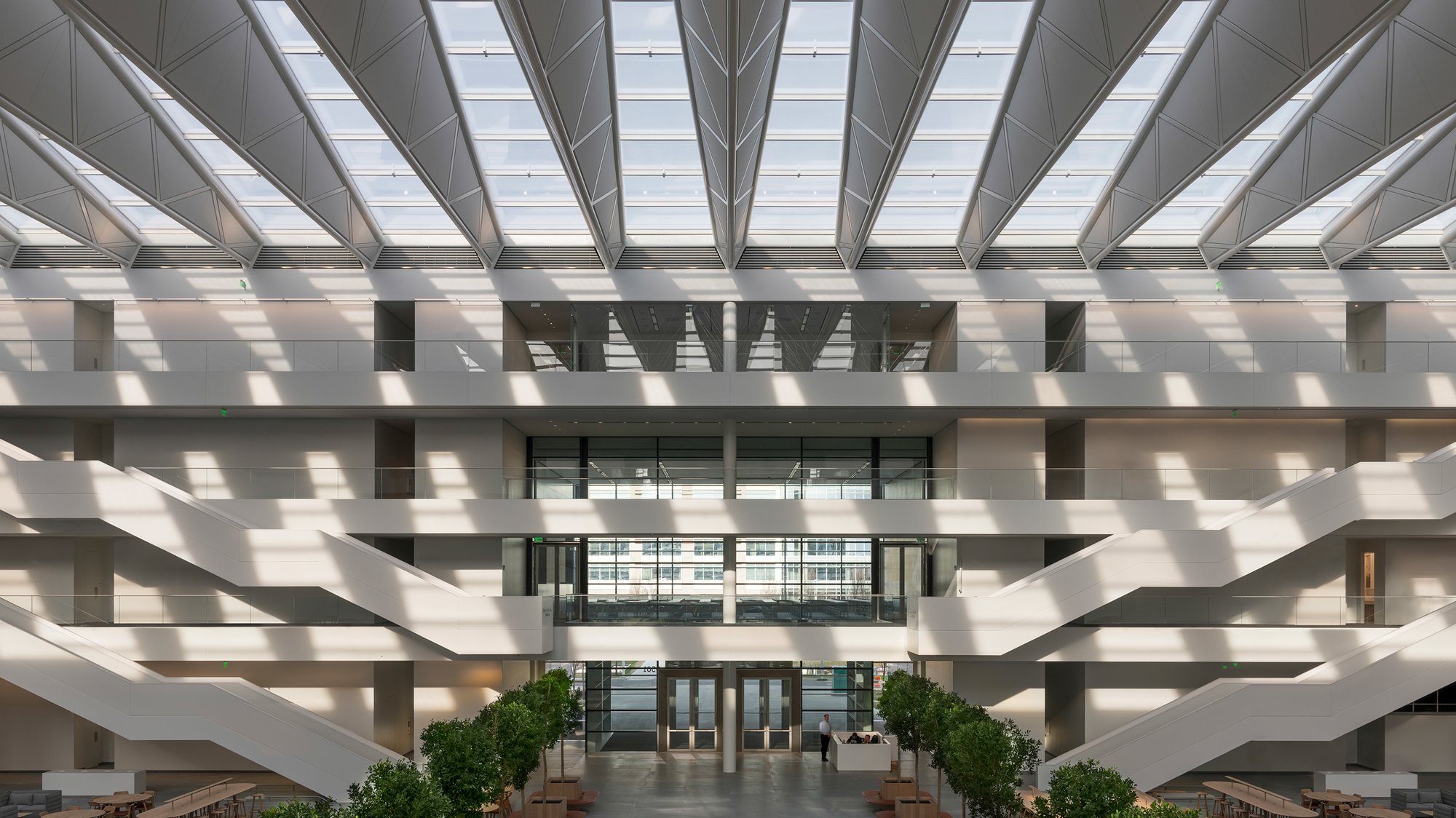 Foster + Partners delivered the structural and environmental design for the LEED Gold-rated project. Detailed daylight and climate analysis informed the design of the roof of the central courtyard. The heavy snowfalls in the region drove the structural design, where the roof trusses are pitched to allow the snow to naturally slide off the glass and onto the solid infill roof around the courtyard, ultimately melting into the channels along each side of the roof. Shading is provided by the truss cladding allowing more light around the perimeter circulation spaces.