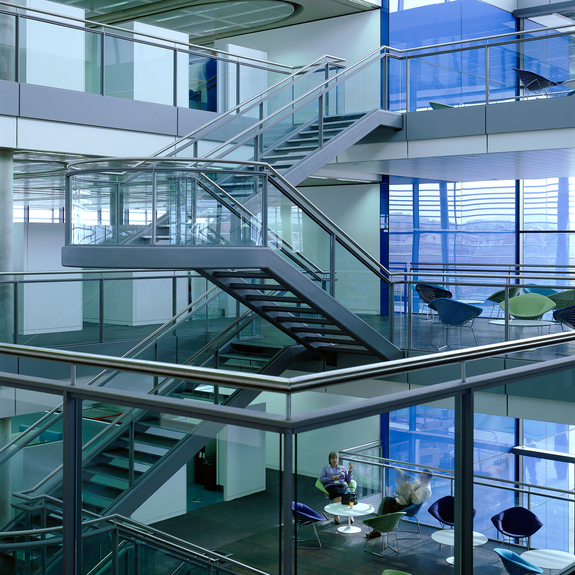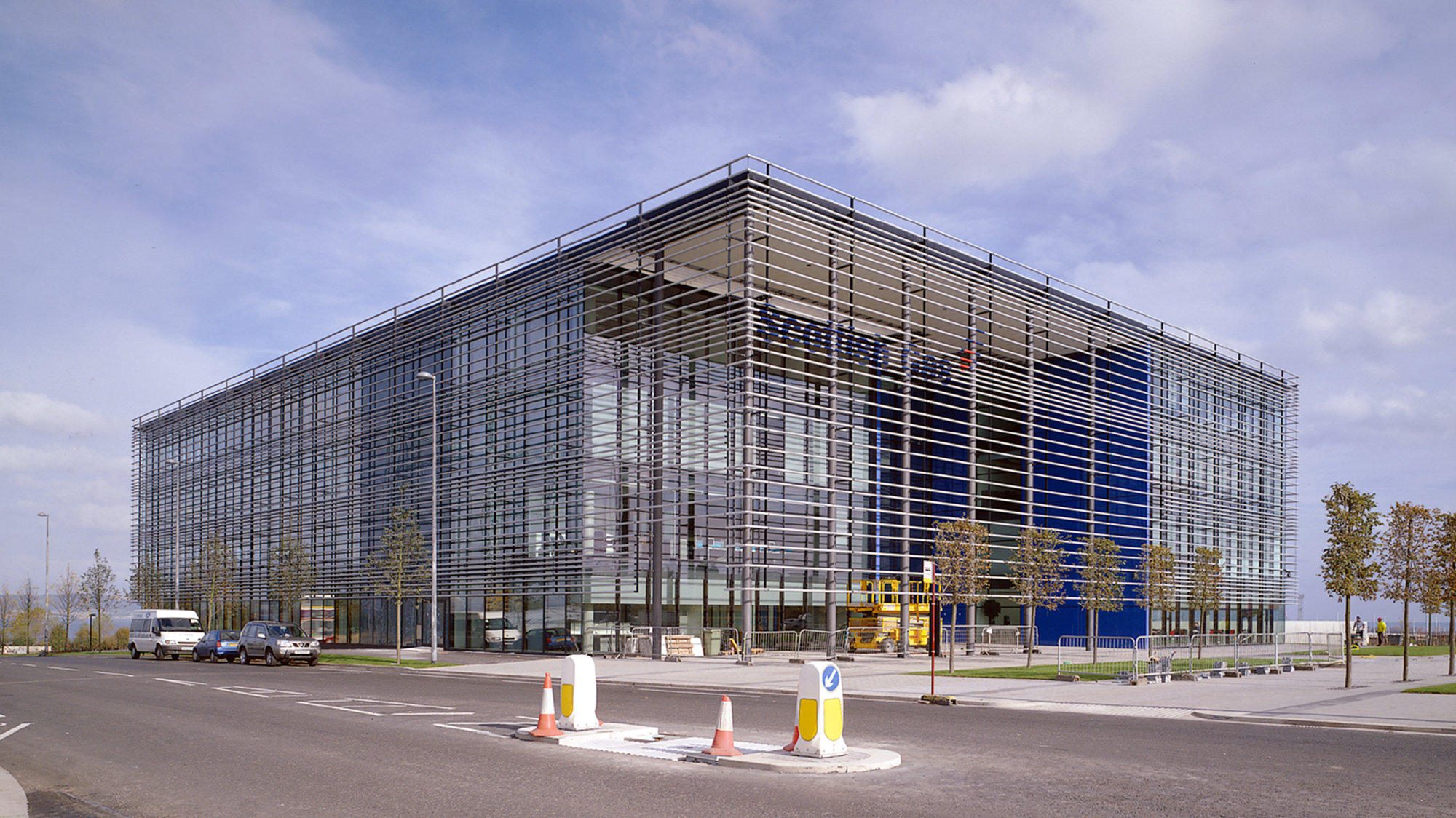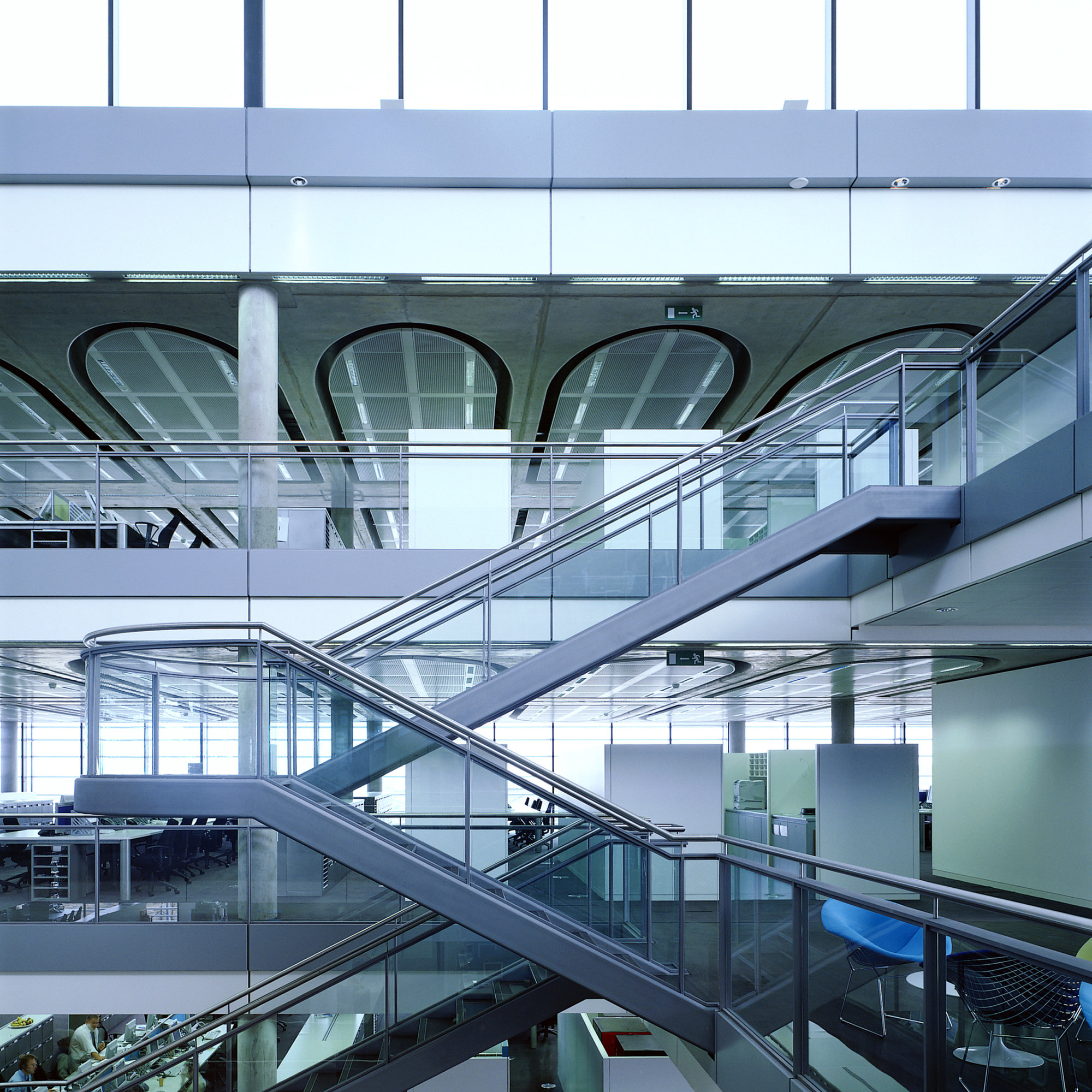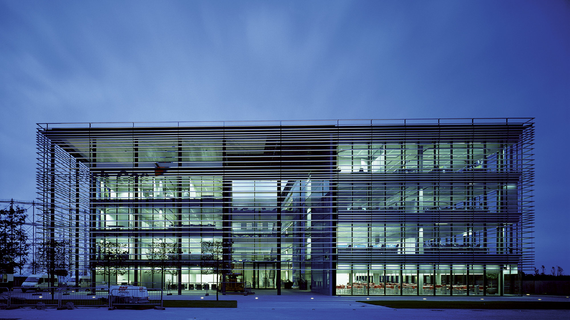 Each facade of the building is fully glazed to form a glass box which is then sheathed by a veil of external silver aluminium louvres to provide shading. A displacement ventilation strategy maintains a comfortable working environment and ensures that the building is highly energy efficient.