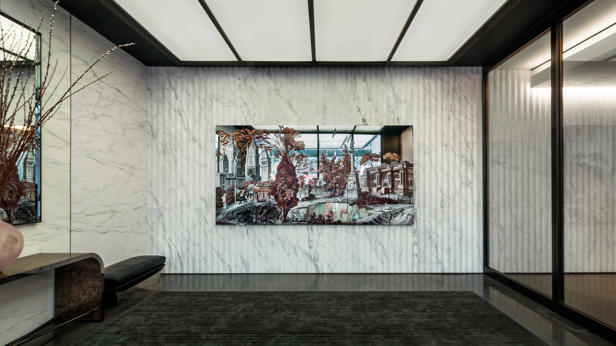 The building has a pure white façade with undulating glass and is designed with a 9-story bustle adjacent to the main 711-foot tower. The entrance is recessed beneath an illuminated canopy that sits harmoniously alongside the 53rd Street entrance and pavilion of the Seagram Building. The entry sequence continues on a single plane from the street to reveal a gallery-like lobby with fluted white marble walls, bronze fireplace and diamond polished concrete floors within.