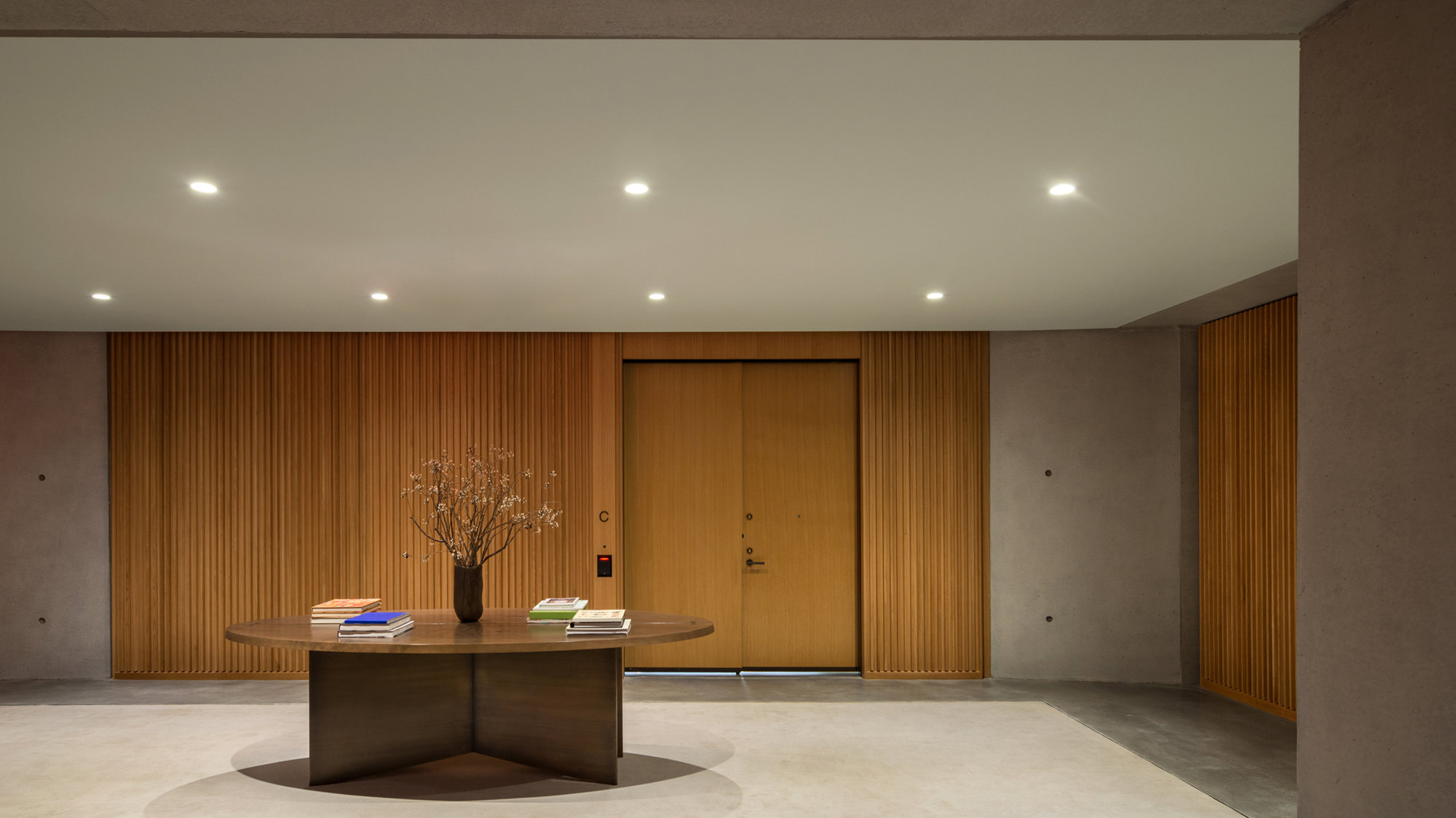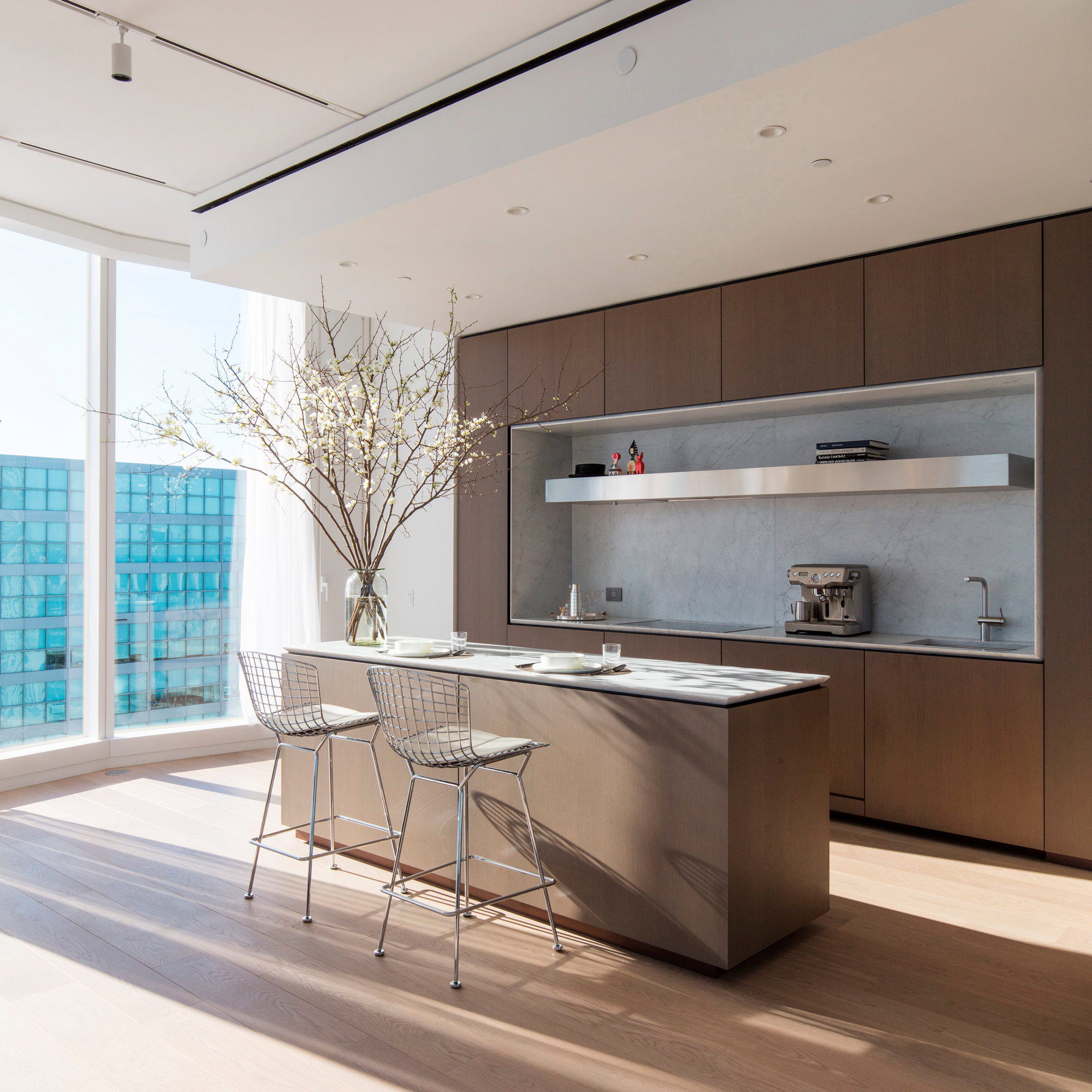 The tower’s slender form creates a narrow floorplate, allowing the interior spaces to be flooded with daylight and creating spectacular views across the city from every side. With a total of 94 apartments, there are two main design typologies that distinguish them. ‘Loft Apartments’ are inspired by New York’s downtown industrial loft style living with art gallery type spaces and finishes. These apartments occupy the lower floors where the floor sizes are larger, and views are more engaging with urban energy of New York’s street life. Materials used throughout these floors are reminiscent of the NY downtown gallery scene: architectural concrete columns and walls for hanging art, ribbed concrete ceilings with integrated gallery-style track lighting, polished concrete floors and brushed stainless steel kitchens. These materials are complemented by a warmer palette of unstained natural oak cabinetry and doors throughout.