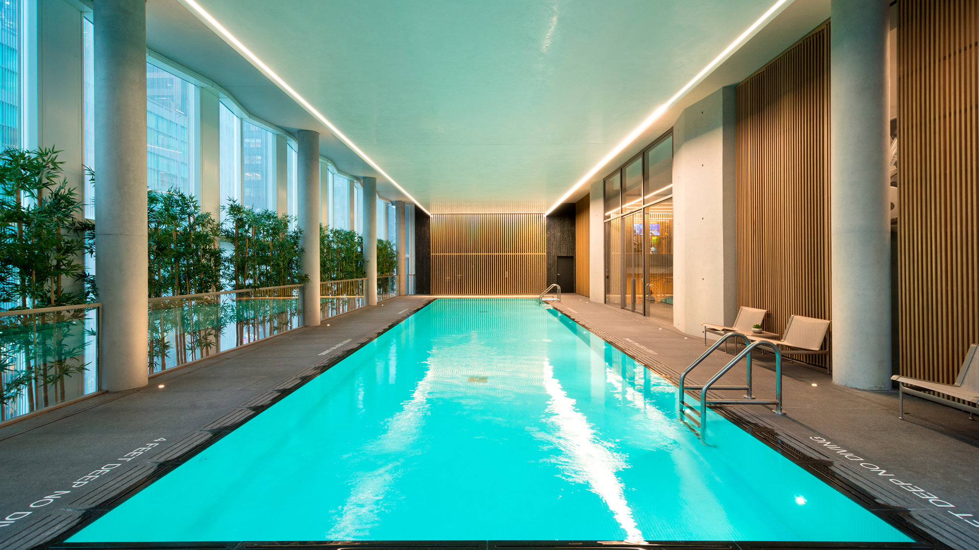 Shared amenities for residents are located on the third and fourth floors, including a full wellness center with a 60-foot-long lap pool, fitness rooms, yoga & ballet studios, steam & sauna rooms, a library and multimedia room.