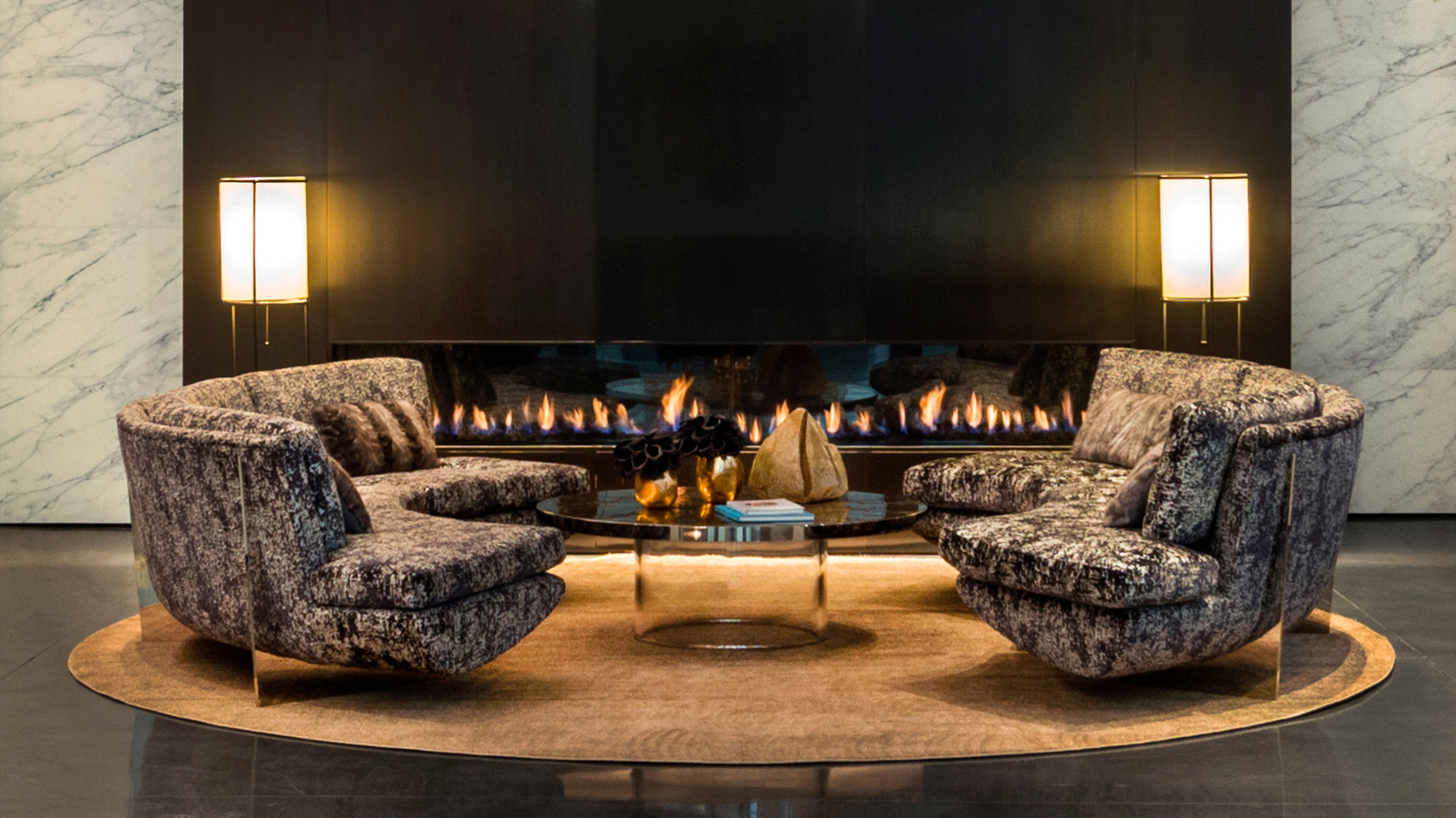 Second type of residences are the ‘Tower Apartments’, which are on the upper floors with commanding views of the city with high ceilings. These apartments utilize a more traditional material palette consisting of large plank white oak flooring, aged oak cabinetry and White Carrara marble kitchen surrounds. Master bathrooms are designed with Italian Silver Travertine flooring and custom designed vanities and fixtures. Powder rooms also have Greek Argos Black vanities with bespoke lighting
