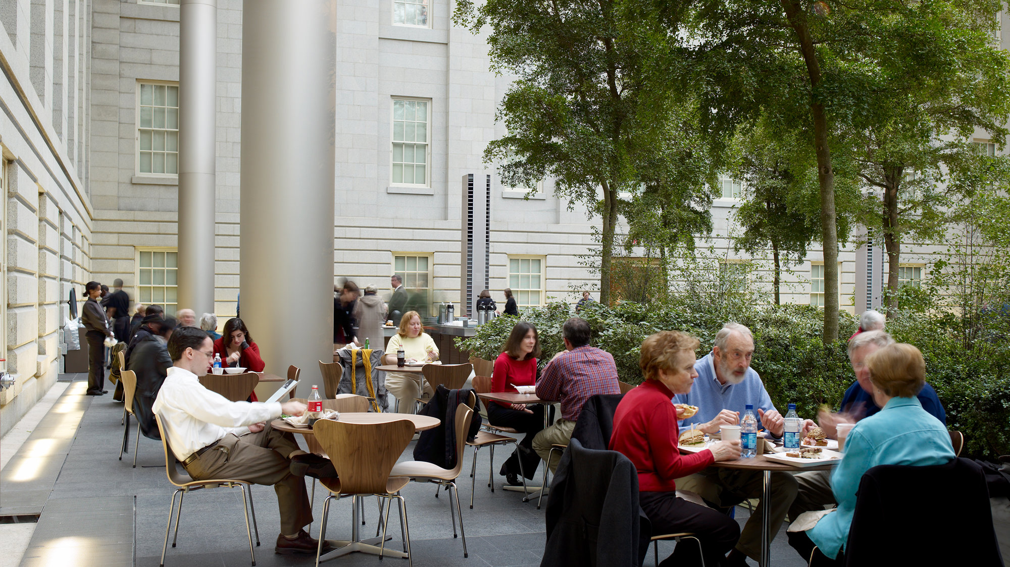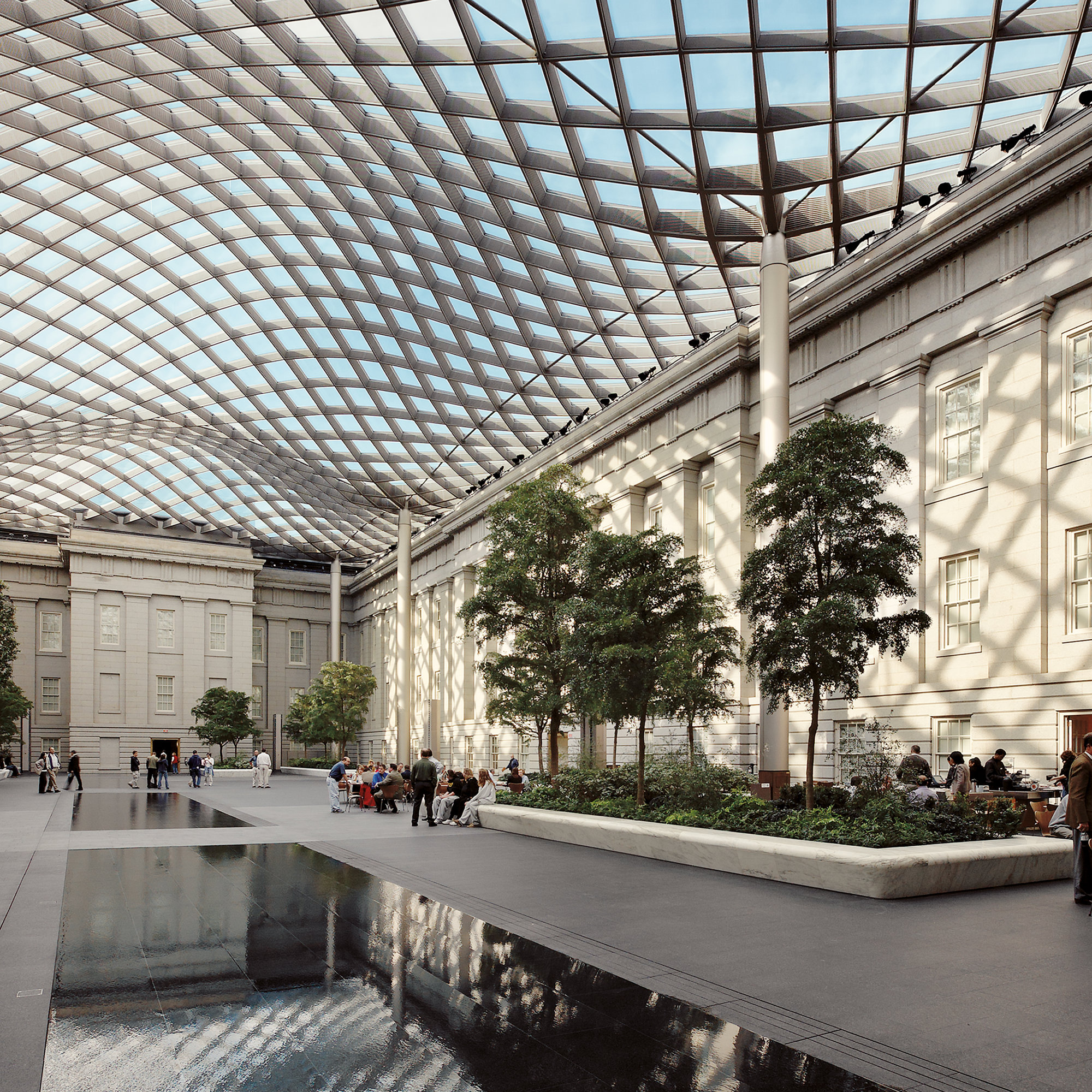 The Smithsonian Institution occupies the former United States Patent Building, once described by the poet Walt Whitman as ‘the noblest of Washington buildings’. Built between 1836 and 1867, the Patent Building is the finest example of Greek Revival architecture in the United States and a celebrated part of the capital’s urban fabric. Now designated as a National Historic Landmark, the building was rescued from impending demolition in 1958 by President Eisenhower, who transferred it to the Smithsonian Institution for use as the National Portrait Gallery and the Smithsonian American Art Museum. The enclosure of the building’s grand central courtyard was prompted by a desire to transform the public’s experience of the Smithsonian’s galleries and provide the Institution with one of the largest event spaces in Washington.
