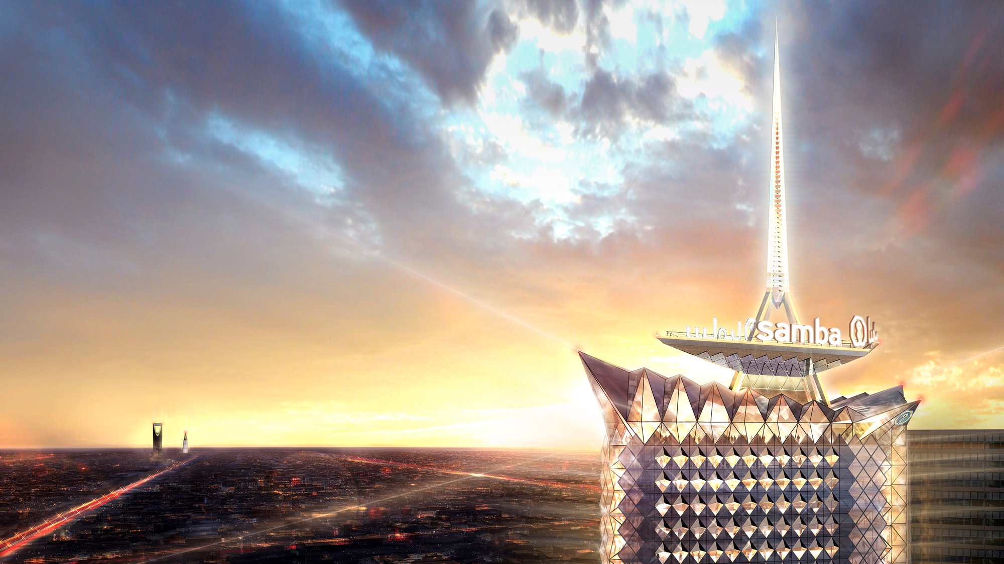 The uppermost floor houses a dramatic open-plan suite, incorporating two majlis and executive spaces with panoramic city views, and it is linked by a grand stair to the executive level below. A podium ‘branch’ building annexed to the lower five floors of the tower contains customer banking facilities. The podium’s roof aligns with the restaurant level to form its open-air seating terrace and also includes a dedicated prayer room within a large pavilion. The tower is topped by a 70-metre high spire, which is illuminated at night as a landmark for Samba. The spire also acts as a radiator, capturing cooling northerly breezes and using water to cool the roof-mounted array of advanced photovoltaic panels, thus enhancing their efficiency. To encourage walking and the use of public transport, the scheme has a low ratio of parking spaces compared to an equivalent office development in Riyadh, and a covered pedestrian walkway extends from the first floor to join the network of shaded routes that bisects the district.