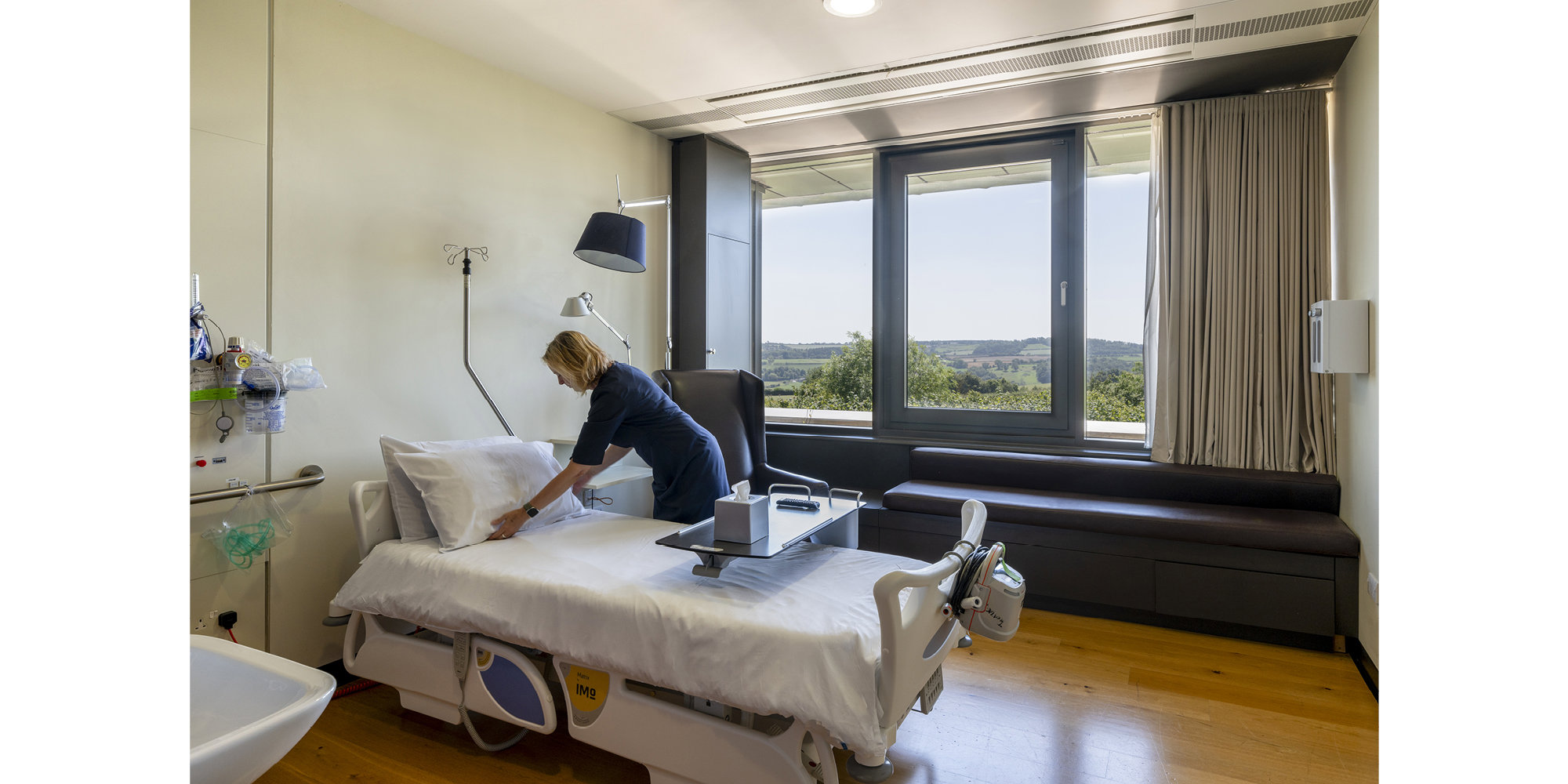 The building is dug into its hillside site and its physical profile kept low, with public entry arranged at the higher level and service access on the floor below. Throughout the hospital there is an emphasis on natural light and views: recovery spaces on the lower level are fully glazed, as are the operating theatres, and all look out across a quiet private garden. Balconies line the building's northern and southern edges, oriented to maximise views across the surrounding countryside. Sympathetic landscaping further emphasises the therapeutic natural environment - an overall approach very different from more familiar, institutional hospital surroundings.