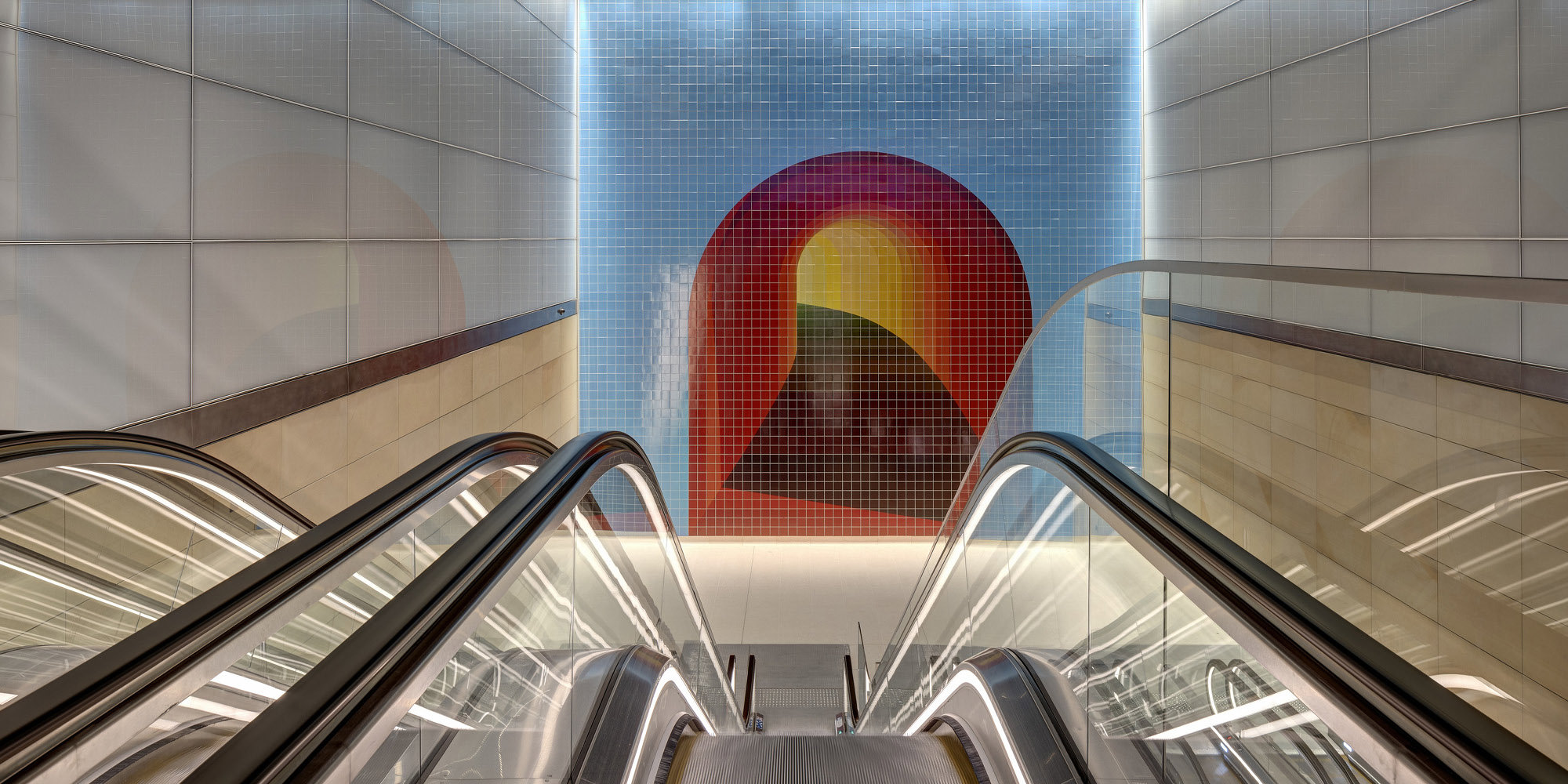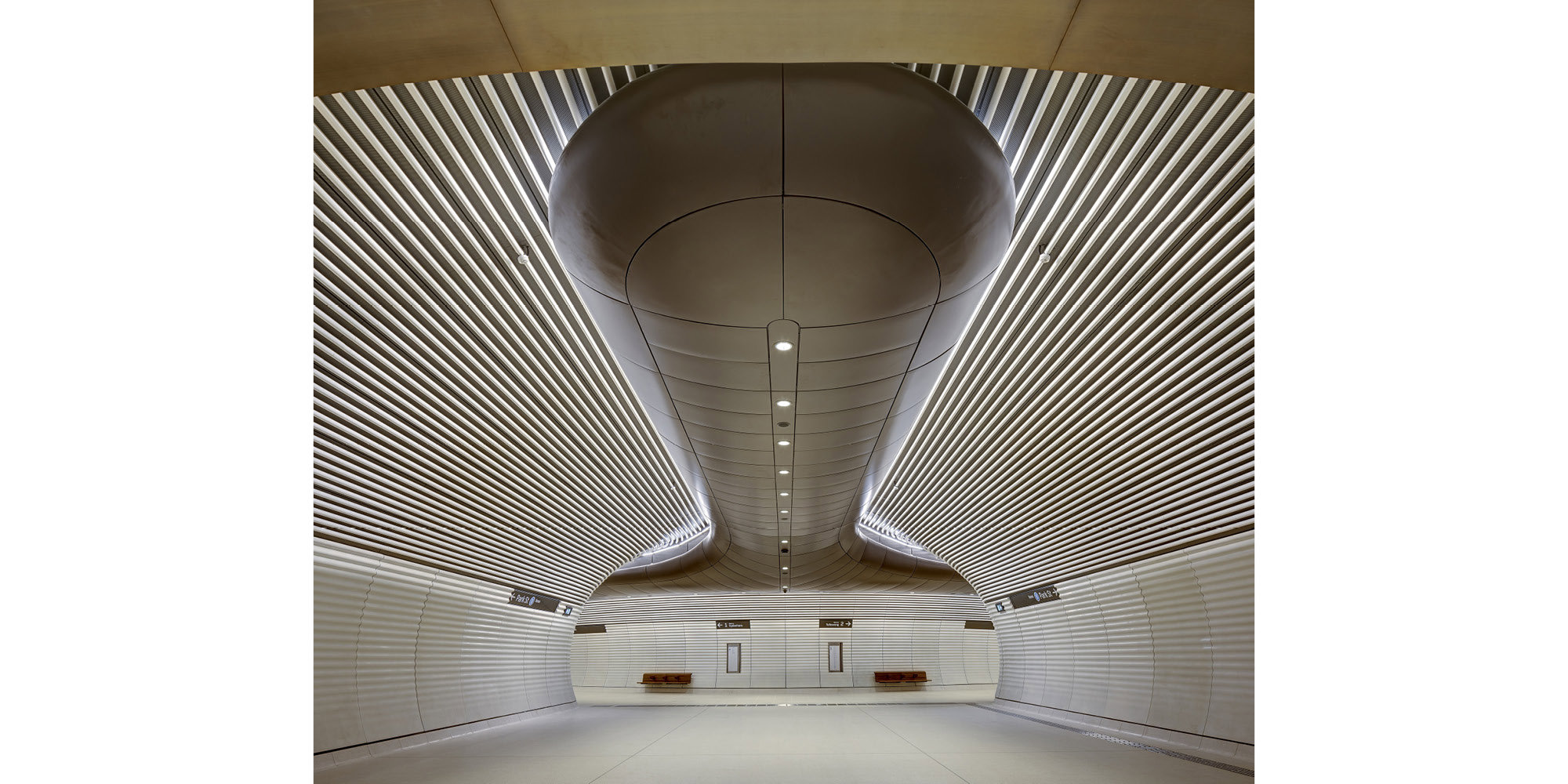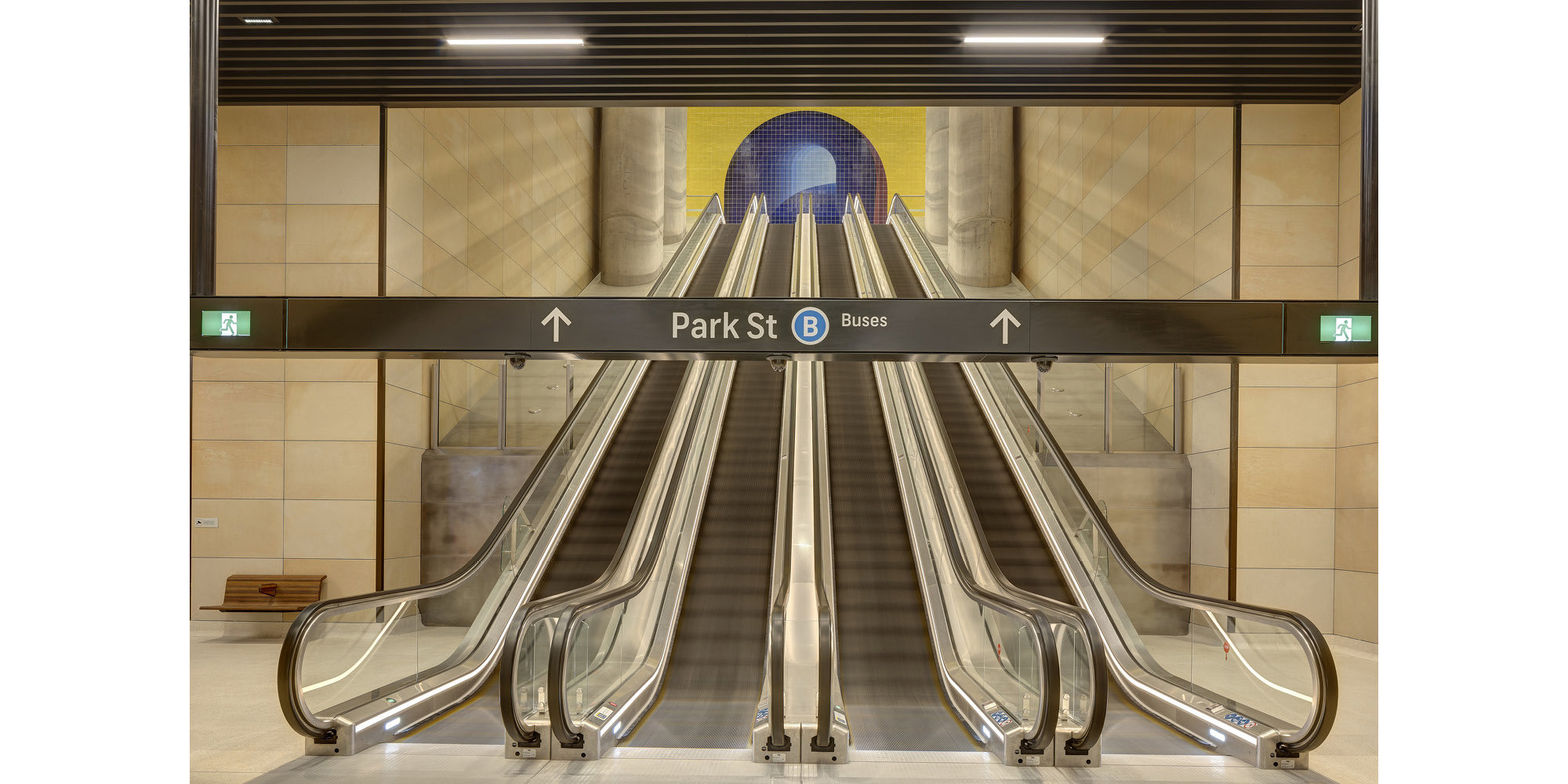 Above this veil, Parkline Place, a 39-storey commercial tower, has been articulated into three vertical blocks with curved corner glazing. A vertical recess in the facade continues seamlessly through the full height of the tower and is centred directly on the station’s entrance veil. This urban scale massing creates a connection between the station and the tower, articulating the south elevation of the tower.
