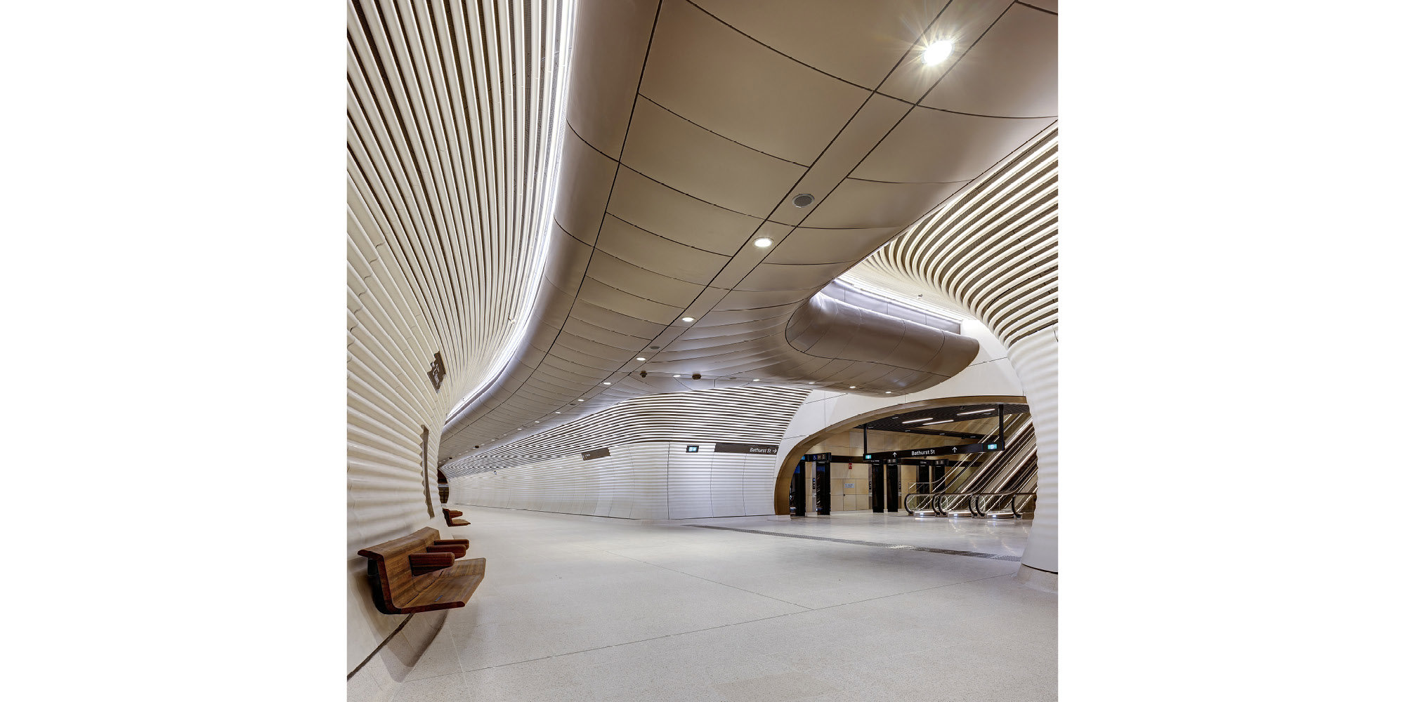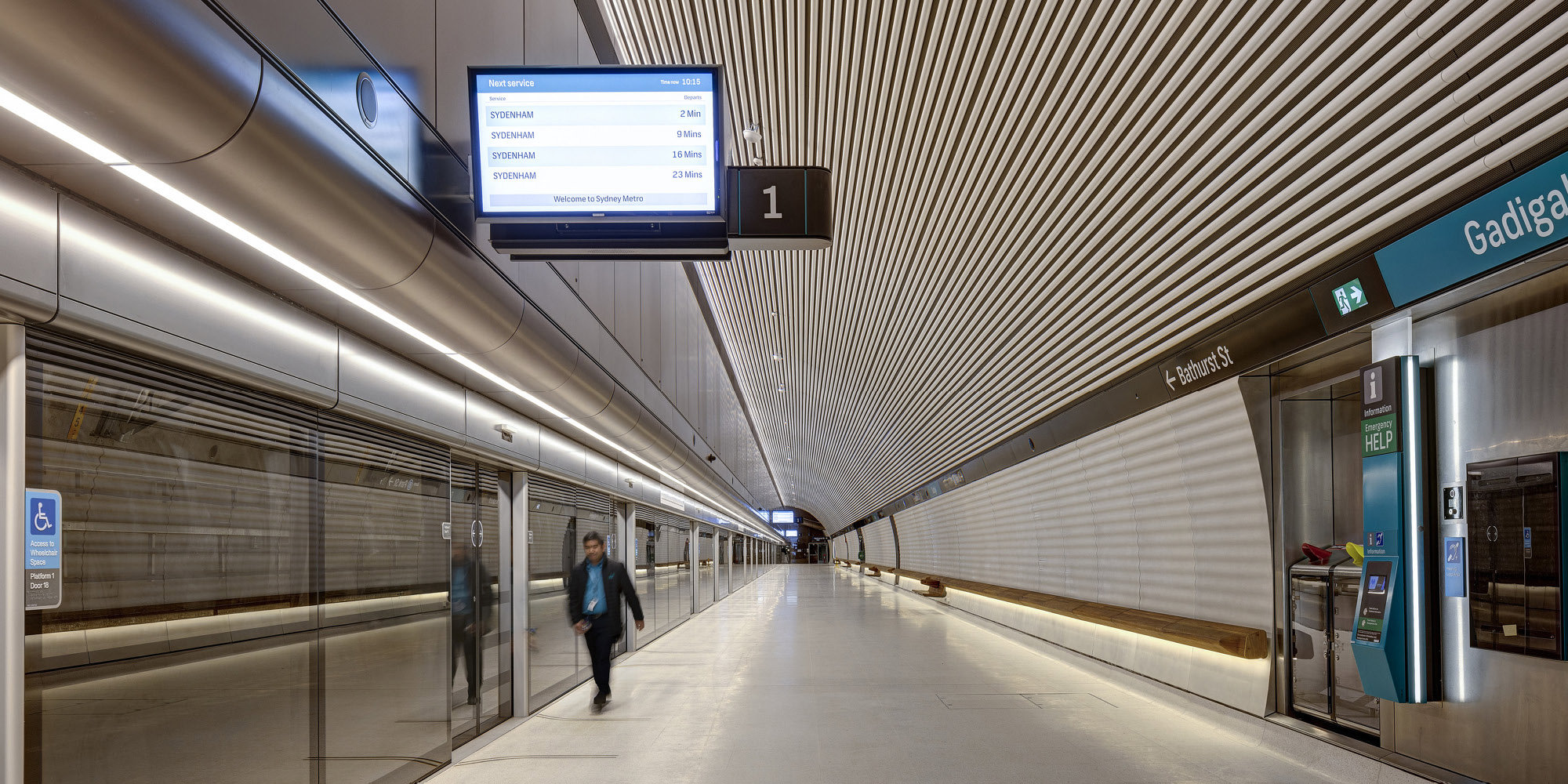 Gadigal Station is located at the junction between Sydney’s southern Central Business District and the Midtown retail precinct. The north station entrance plaza naturally fronts onto the tree lined Park Street which is one of the most prominent east-west streets in Sydney. The entrance is celebrated by a glass veil which allows daylight to flood the station plaza concourse throughout the day.