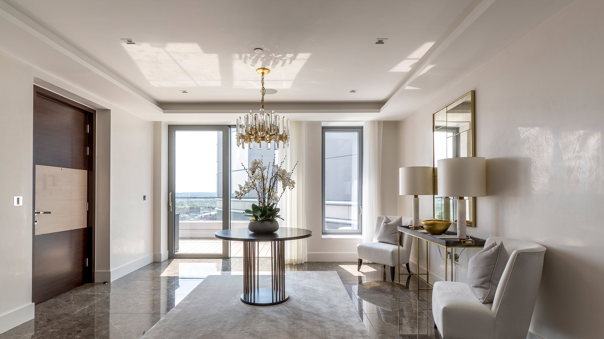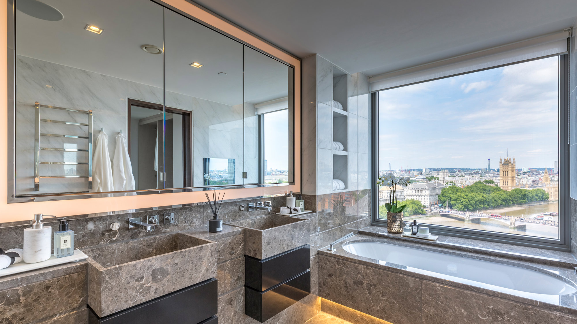 The apartments are designed from the inside-out, as the residential units define the proportions and slender volumes of each building, and the generous living spaces extend into the deep bays that give the scheme its distinctive character. At the same time, the architectural response is sensitive to the scale, massing and materials of neighbouring structures. The balconies frame spectacular panoramic views – unlike typical box-like enclosures, the curved gardens in the sky allow wide, ‘cinemascope’ perspectives of the river and Parliament. Their curvilinear form is further emphasised by highly reflective, metallic detailing, designed to catch the sunlight.