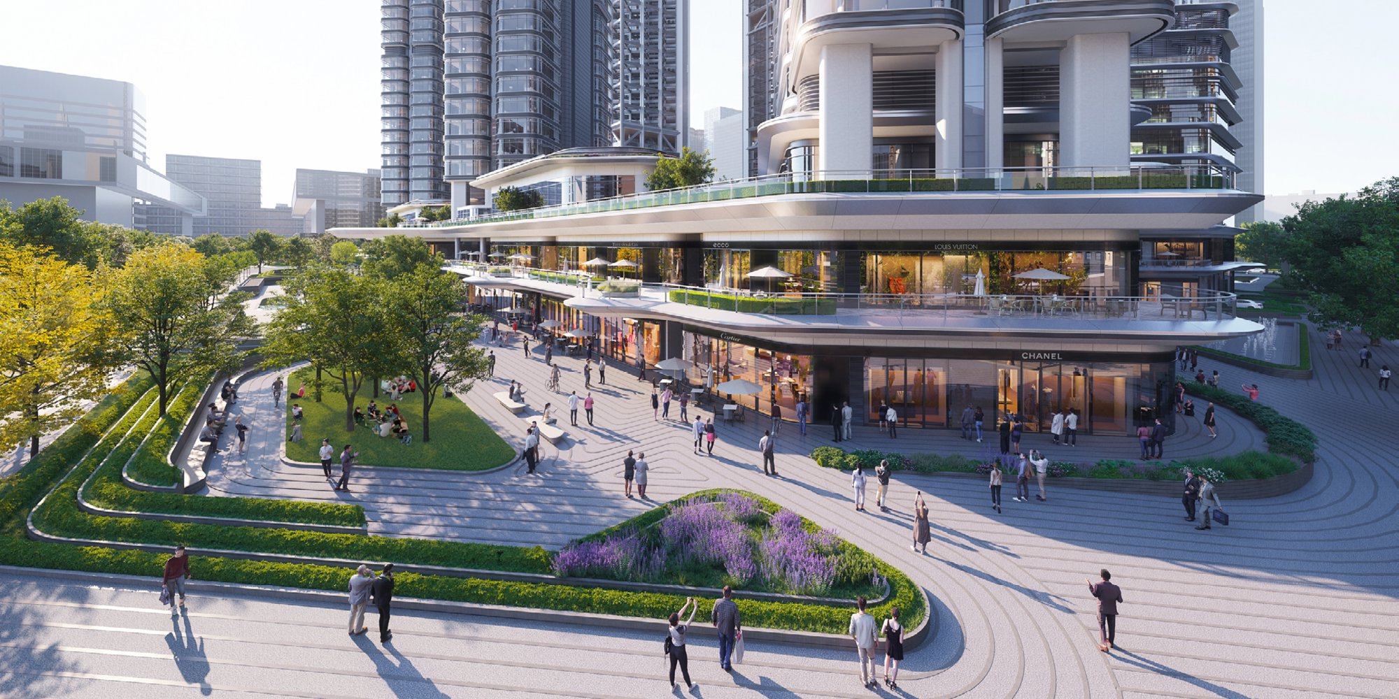 Along Li’er Road, the south-facing residential towers have stepped massing, to allow more light into the development and create a dynamic skyline. The tower’s slender volumes allow for cross ventilation and increase natural light levels. Their distinctive, rounded edges set them apart from the office towers on the other side of the site. Triple-height lobbies visually connect tenants with roof gardens on the upper floors. A collection of connected amenities, including a club, spa, nursery, and pool, redefine the residents’ living experience.