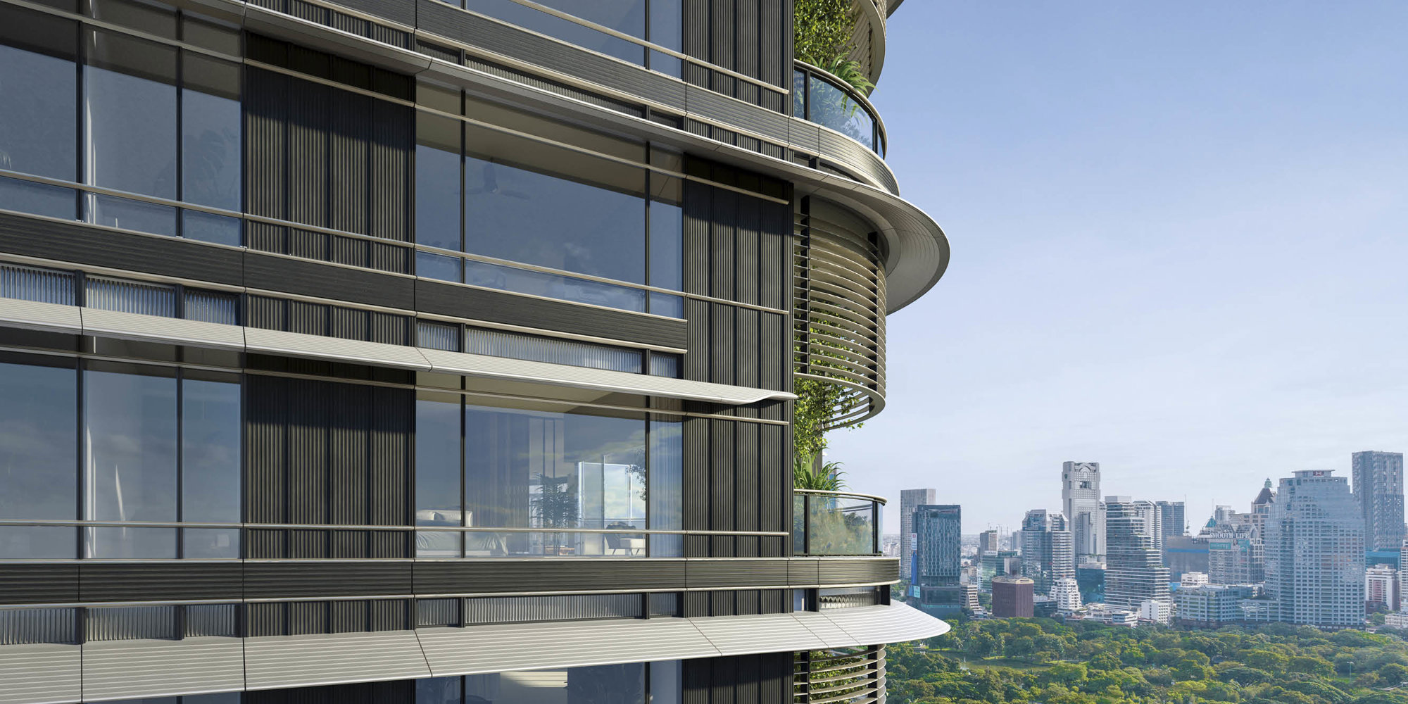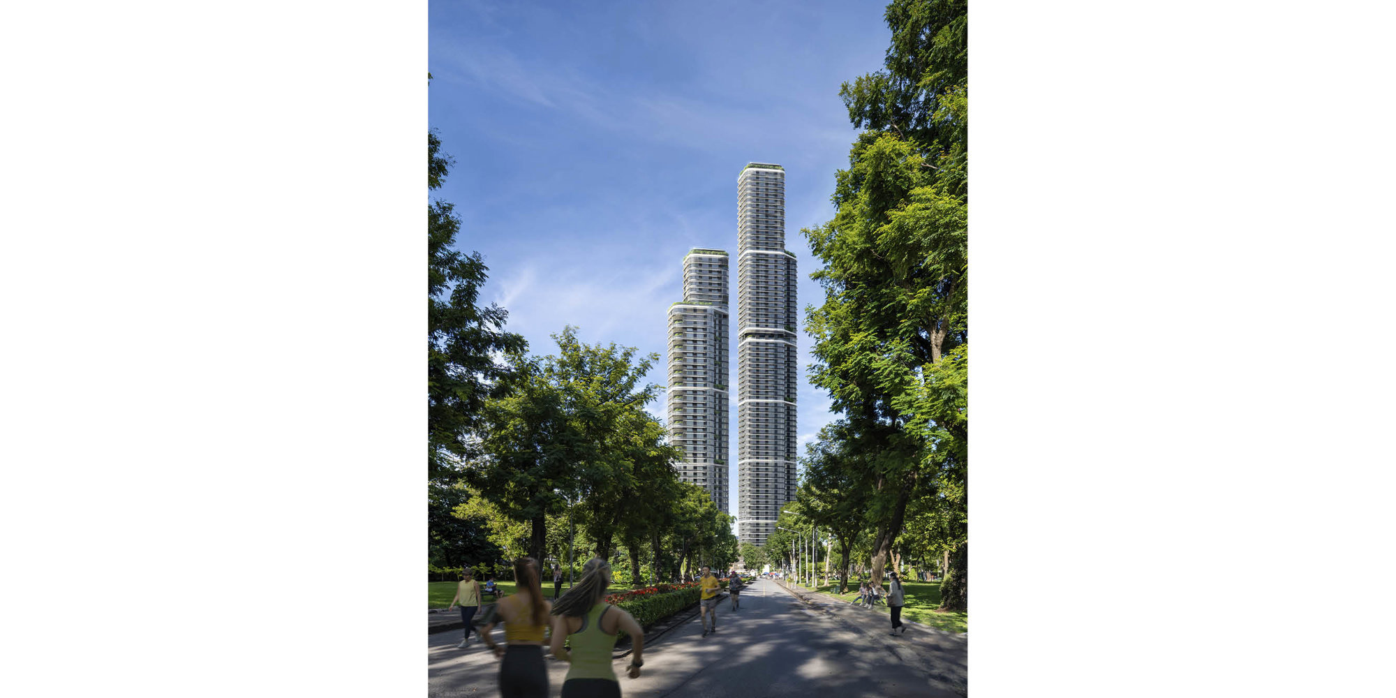 The two ultra-luxury residential towers (214 metres and 284 metres respectively) are located on Wireless Road in the heart of Bangkok, adjacent to the 142-acre Lumphini Park, which is often regarded as the first public park in Thailand. The design extends the experience of the park across the development’s ground plane and vertically through the towers.