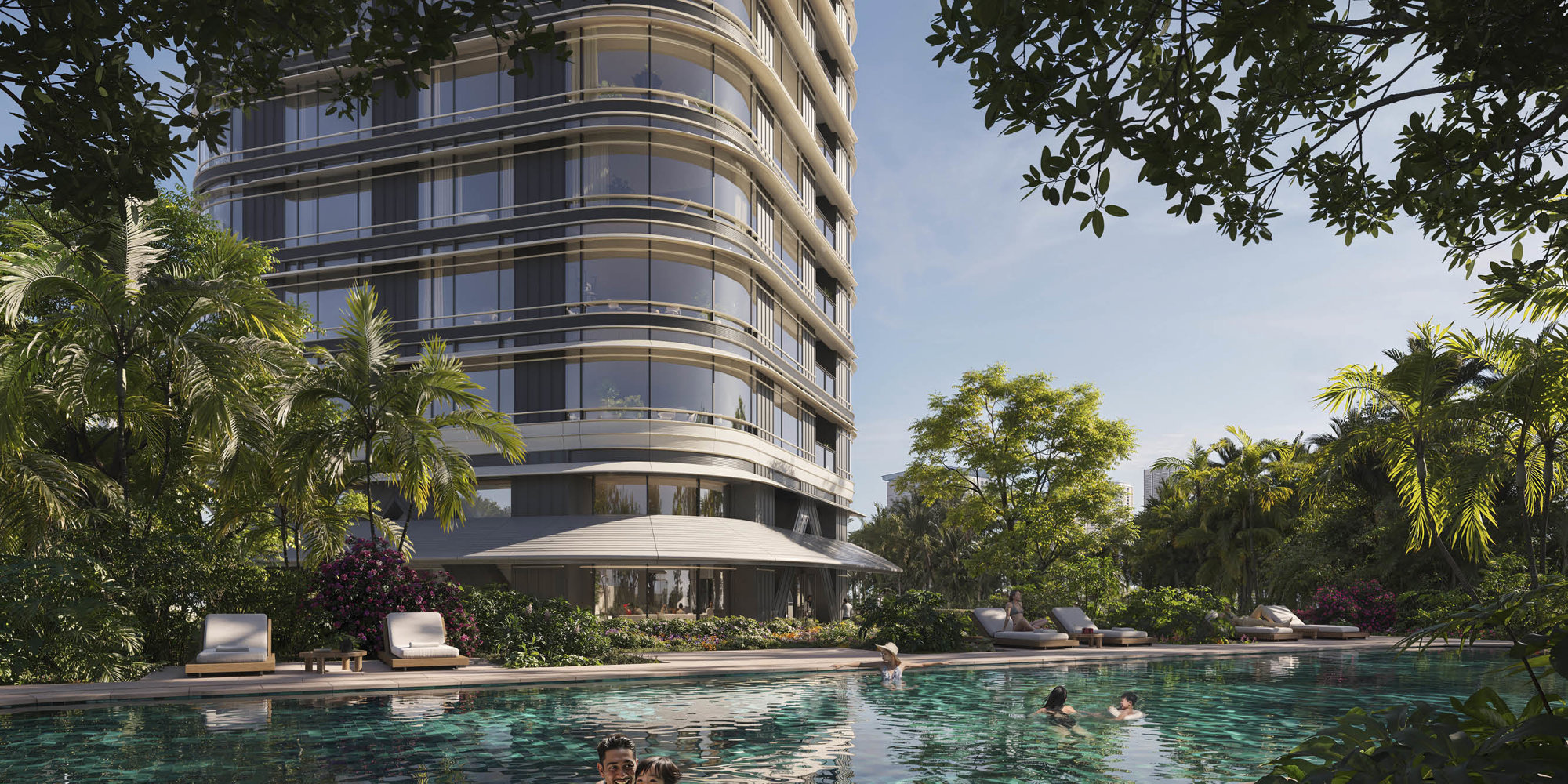 The vibrant ground plane is a green oasis in Bangkok. Each tower has its own entrance and drop-off zones for residents and guests, which enables direct access from the tree-lined driveways. Shaded verandas with overhanging canopies wrap around both buildings at ground level, creating indoor-outdoor spaces for socialising and relaxation. A discreet route from the first tower leads to a private pool, a single-storey children’s pavilion, and a separate children’s pool. The glass pavilion is filled with natural light and provides direct connections with the spectacular natural landscape. Private lifts transport residents to their apartments, where some prime units feature large double-height balconies that offer panoramic views of the city.