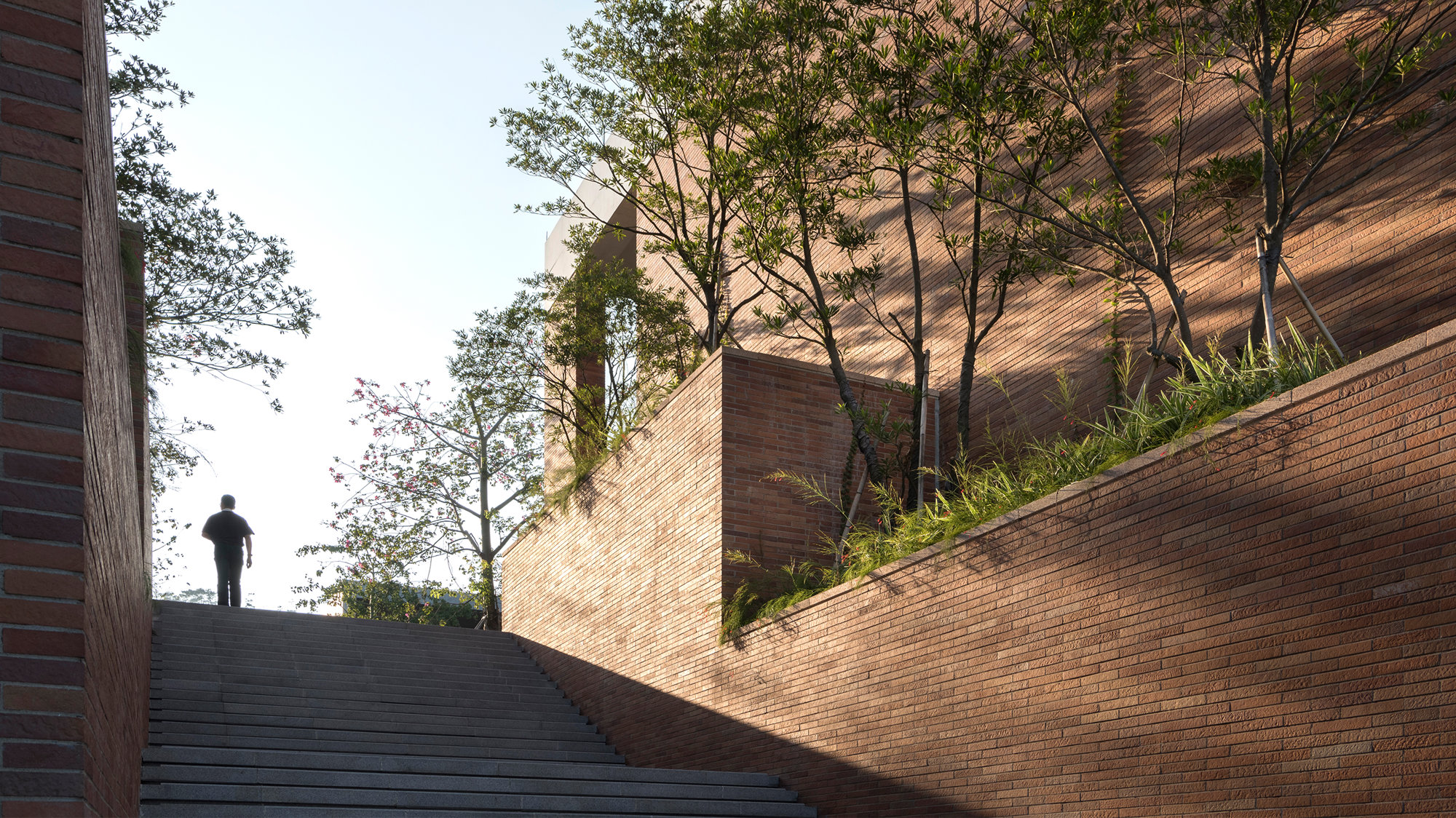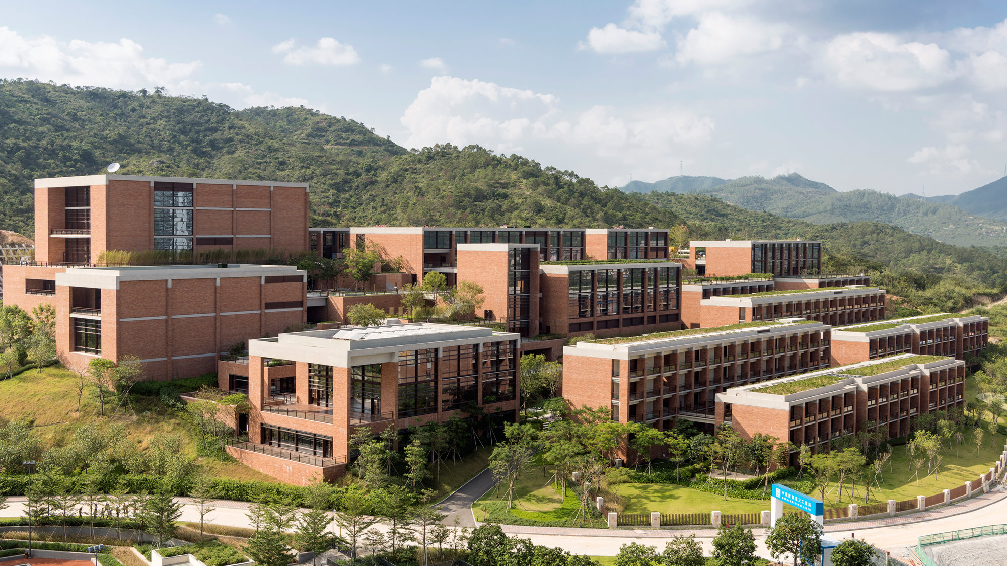 This area of Shenzhen has a history of brick masonry buildings, and the design of the university buildings follow in this tradition by offering a contemporary interpretation of the conventional building block. To accentuate the horizontality of the buildings, the specially designed brick is more than half a metre long, with a smaller cross-section. Although machine-pressed, the brick is rough-textured giving it a crafted, hand-made quality. The texture comes from pressing rough stones against the bricks by hand before firing them. Each brick is baked at varying temperatures (1250 – 1290 degree Celsius) to obtain a narrow variation in colour shades, which closely match the tones of the earth found in the surrounding area.