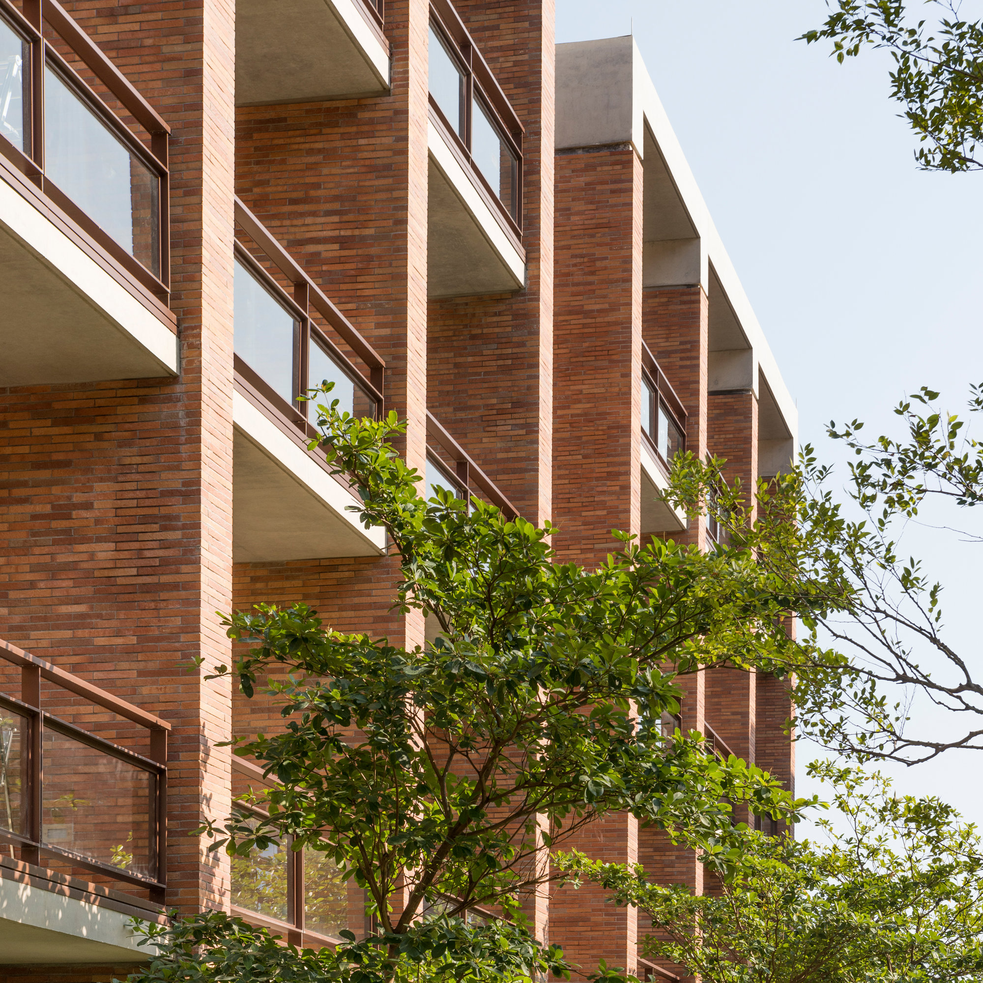 Each dimension of the brick is a carefully calibrated figure. Following a general module of 50 millimetres, the 42 millimetre height is overlaid with an 8 millimetre layer of mortar to align the brickwork with other building elements such as doors, windows and staircases. The colour of the mortar also exudes warmth, matching the shade of the fair-faced concrete on the buildings. The result is precise, well-engineered complex of buildings that obtain their character from the basic building block – the brick, simultaneously reflecting the area’s vernacular heritage and the contemporary nature of the university buildings.