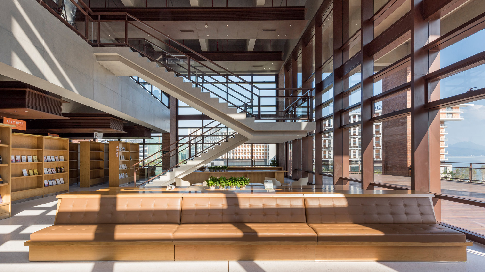 Xiao Jing Wan is a coastal urban development located to the east of Shenzhen. Foster + Partners has designed a masterplan for the region that includes a University campus for China Resources. The 55,000 square-metre University is located astride a hill with exceptional views towards the sea. Teaching rooms and an innovation centre flank the central axis, which terminates with a grand building housing the main auditorium and executive meeting rooms. The library, additional auditoria, students’ bar, gym and residences step down the hill, maintaining views, and are linked by lush landscaping. The buildings maintain a strong horizontal emphasis, and utilise a restrained materials palette consisting of fair-faced concrete exposed internally and externally, bronze coloured cladding and a specially designed clay brick.