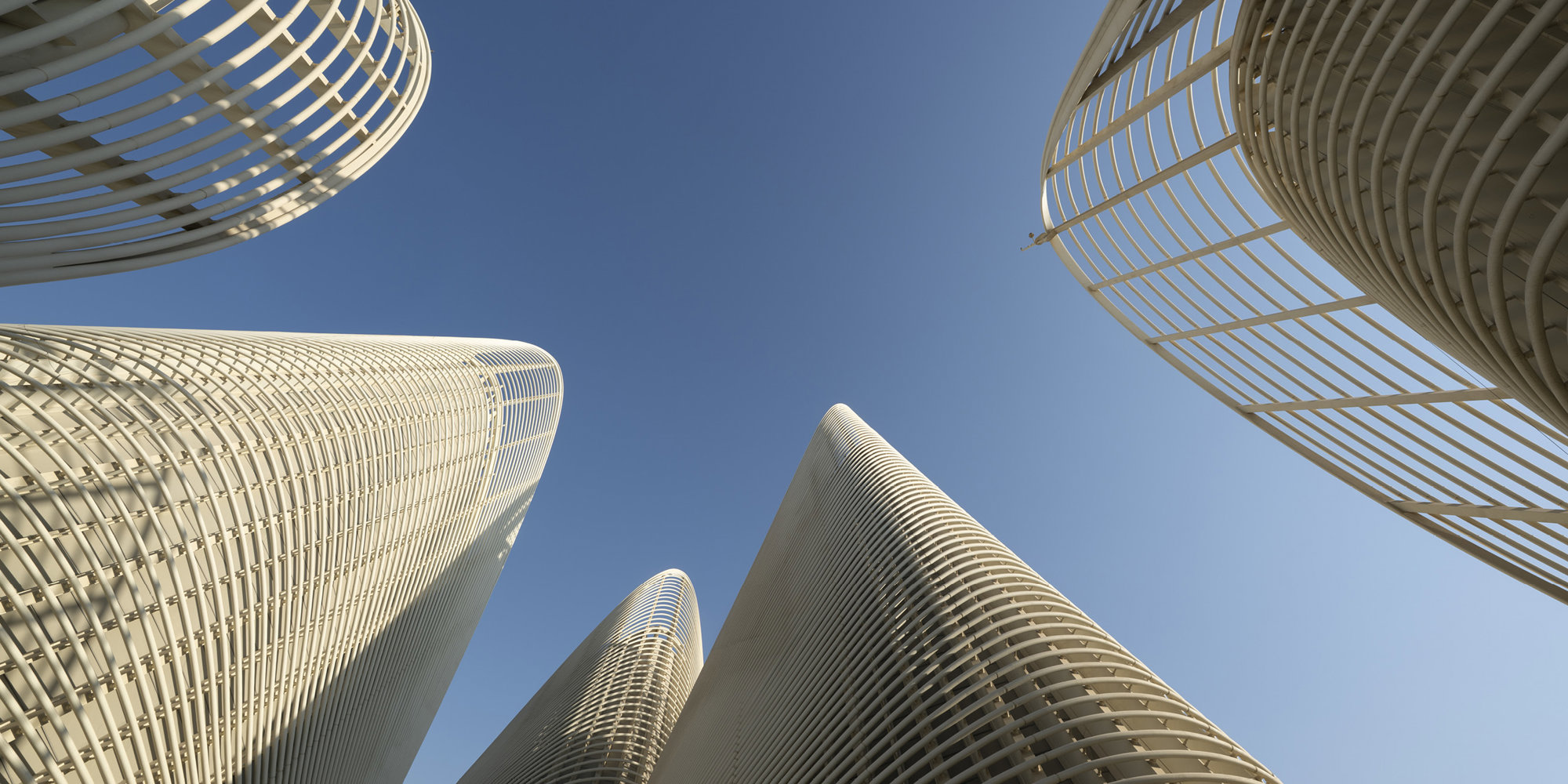 The museum’s five light-weight steel wings are part of the system of natural ventilation. Air vents open at the top of the towers, taking advantage of the negative pressure on the lee-side of the profile to draw hot air out from the atrium, assisted by the thermal effect of the heat build-up on the tips of the wings. Air that has been naturally cooled through pipes buried deep below the desert floor then flows into the atrium through a low-level ventilation system. The wings are glazed to channel natural light into the galleries below, and each one is individually tuneable.